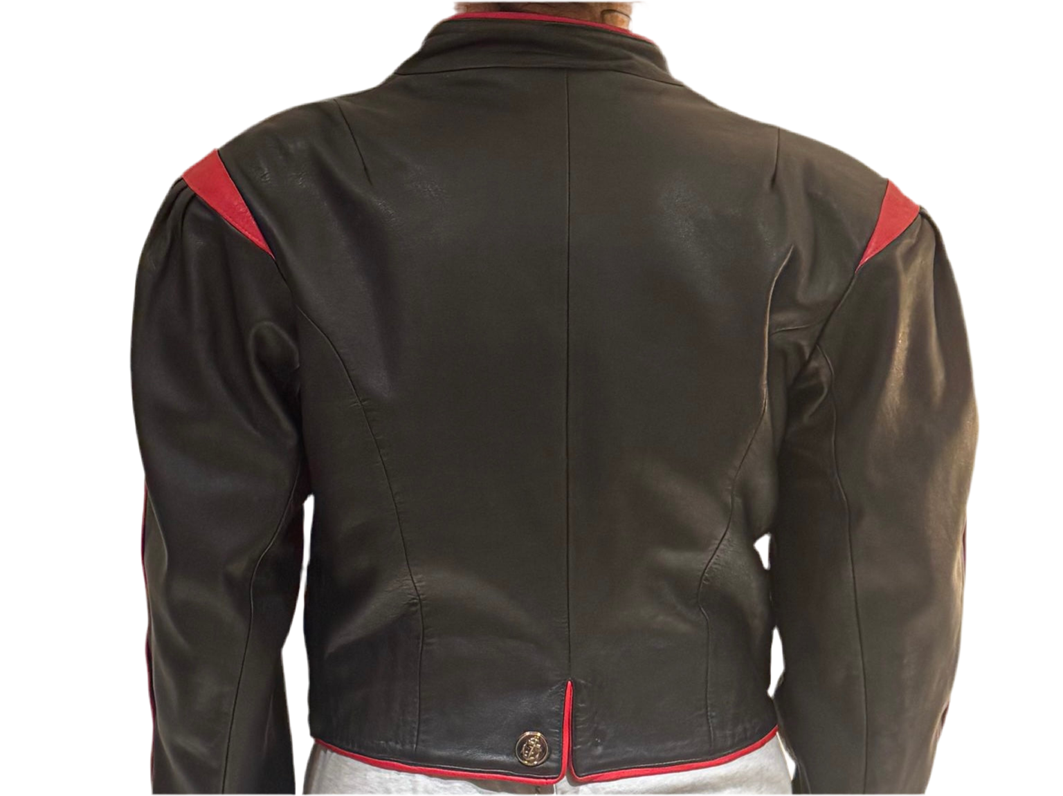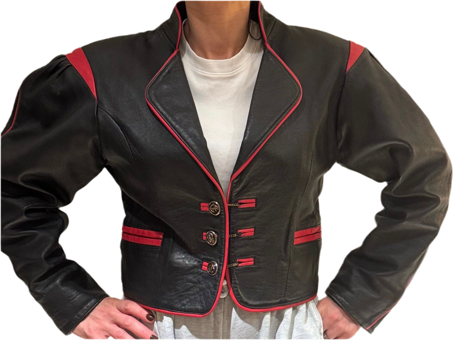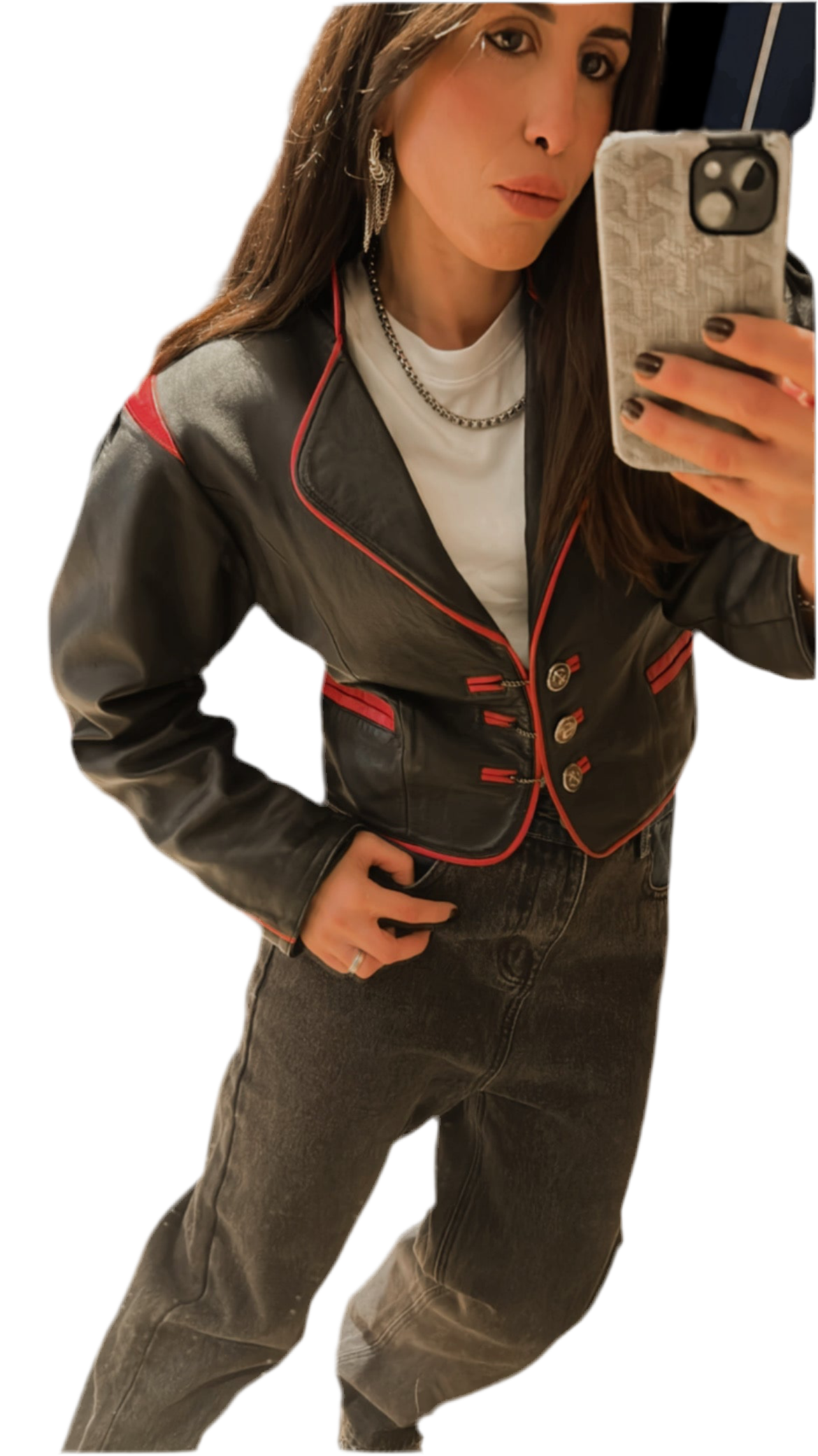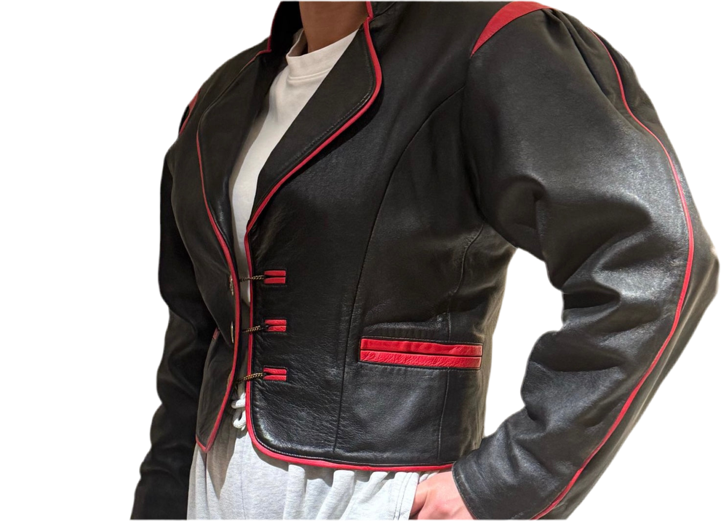 * Style audacieux et distinctif : Cette veste se caractérise par une combinaison de cuir noir et rouge, créant un contraste saisissant et un look affirmé.