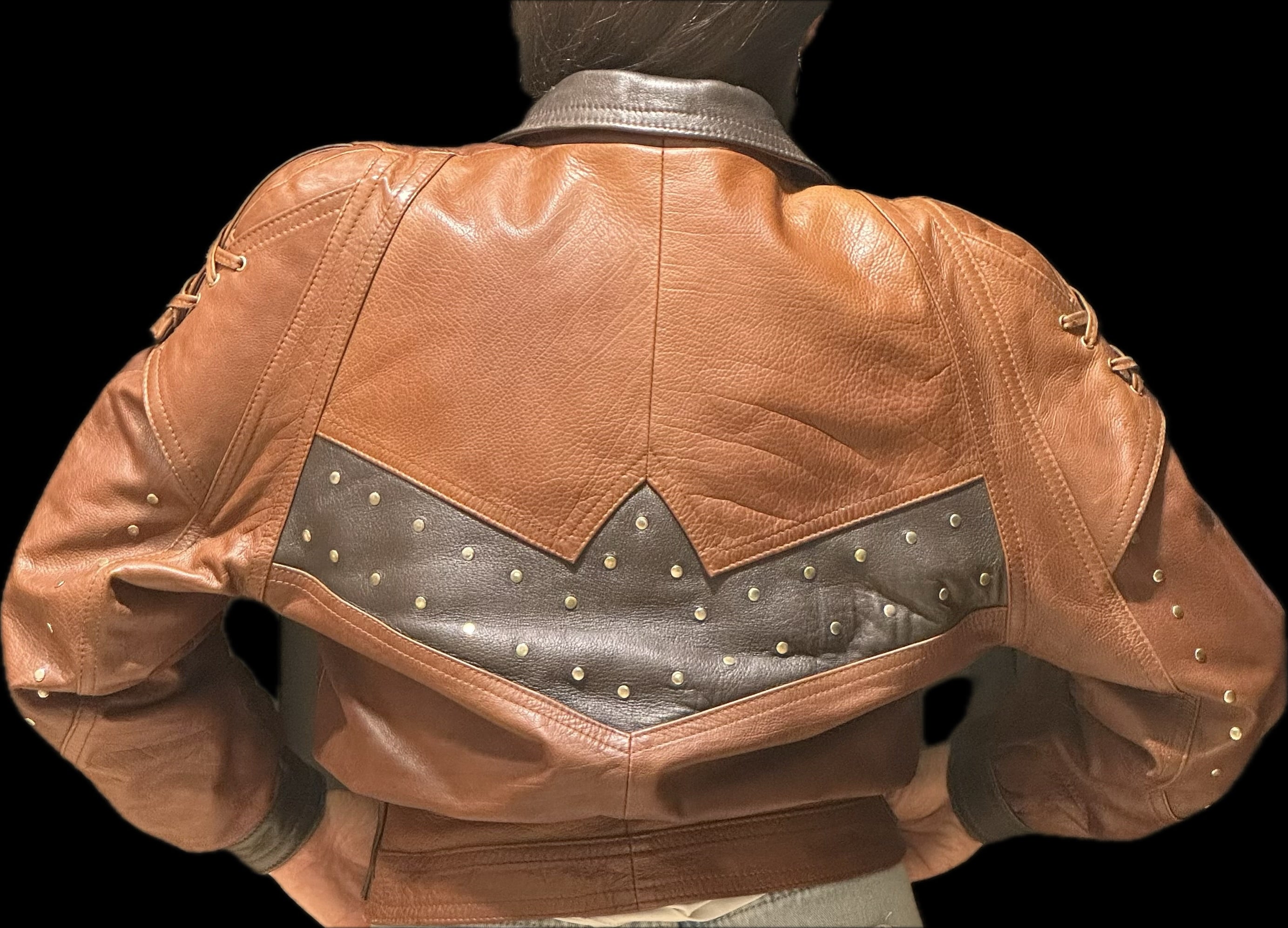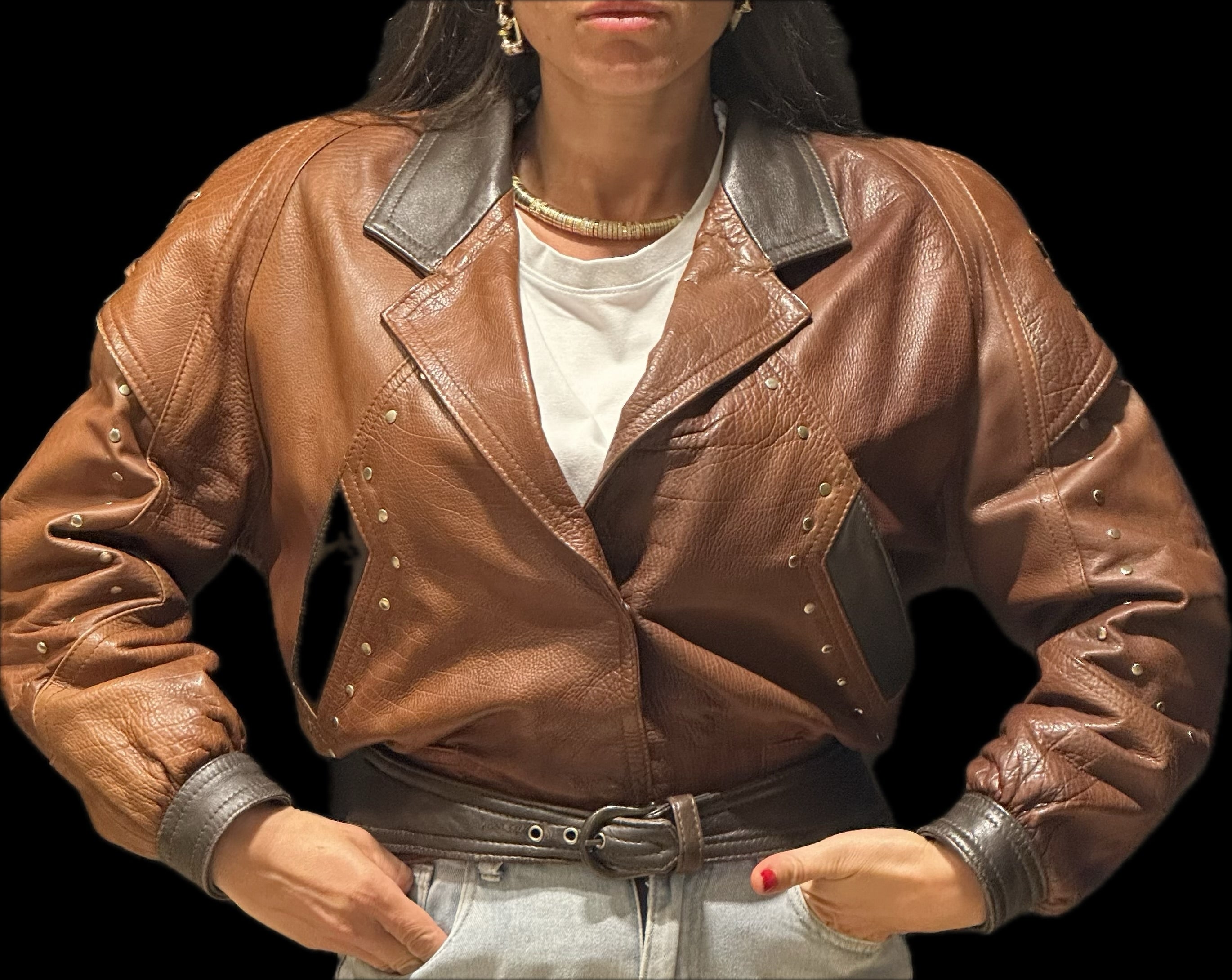Titre : Blouson Cuir Bicolore Vintage Marron & Noir Clouté - Taille 36/38 - Sublime et Unique