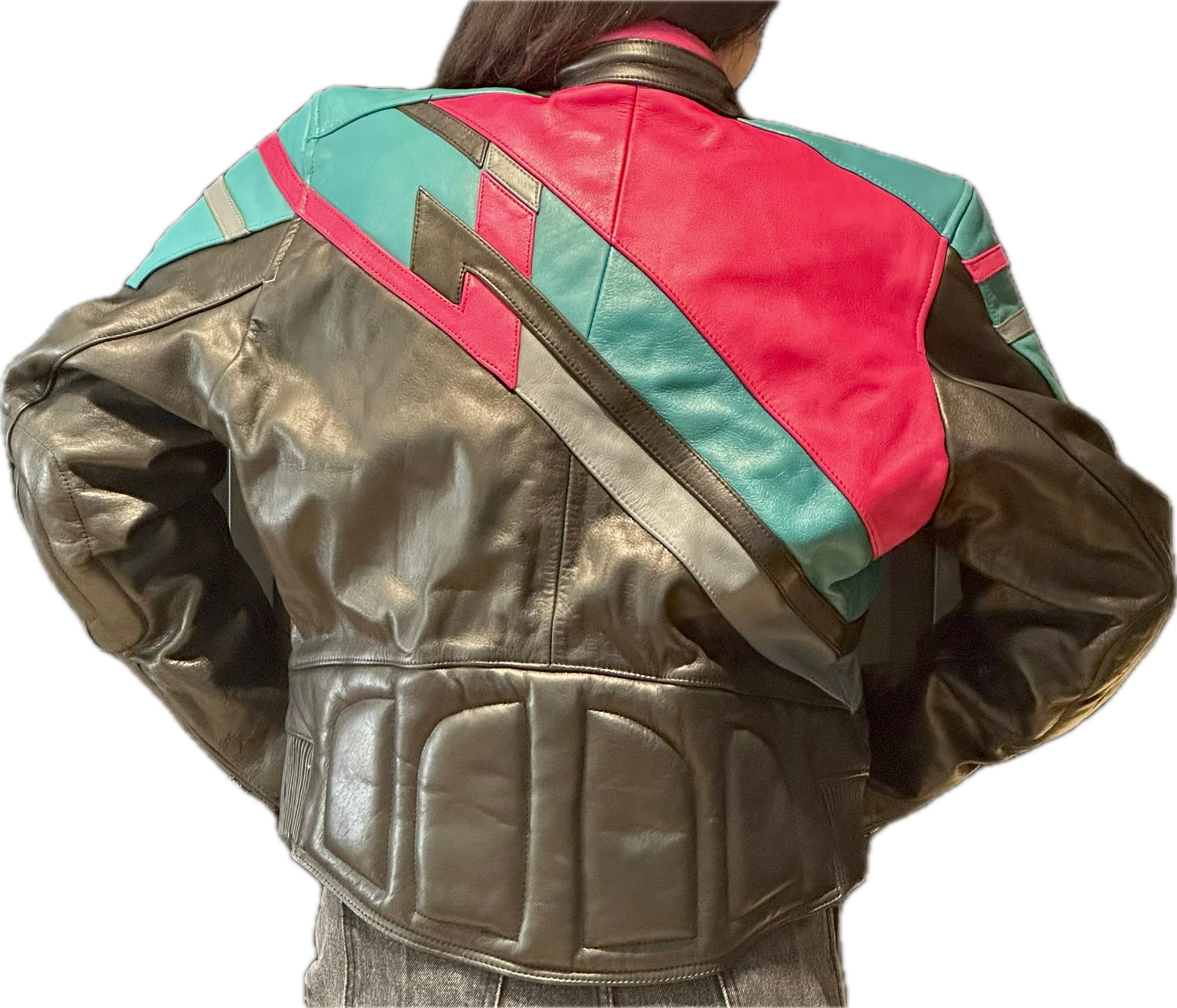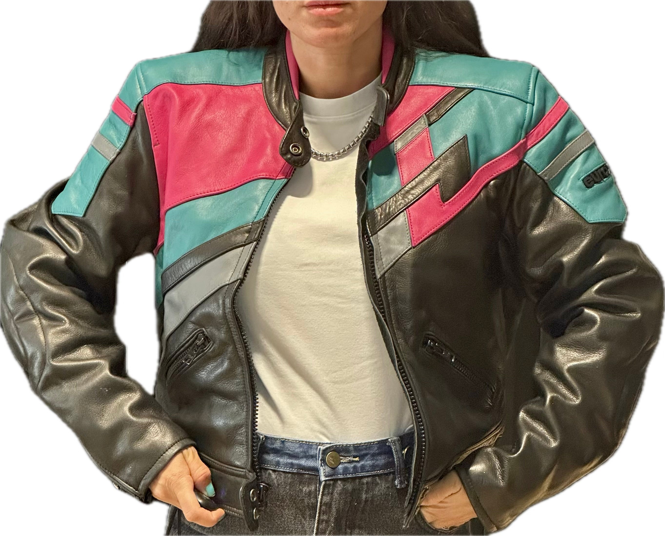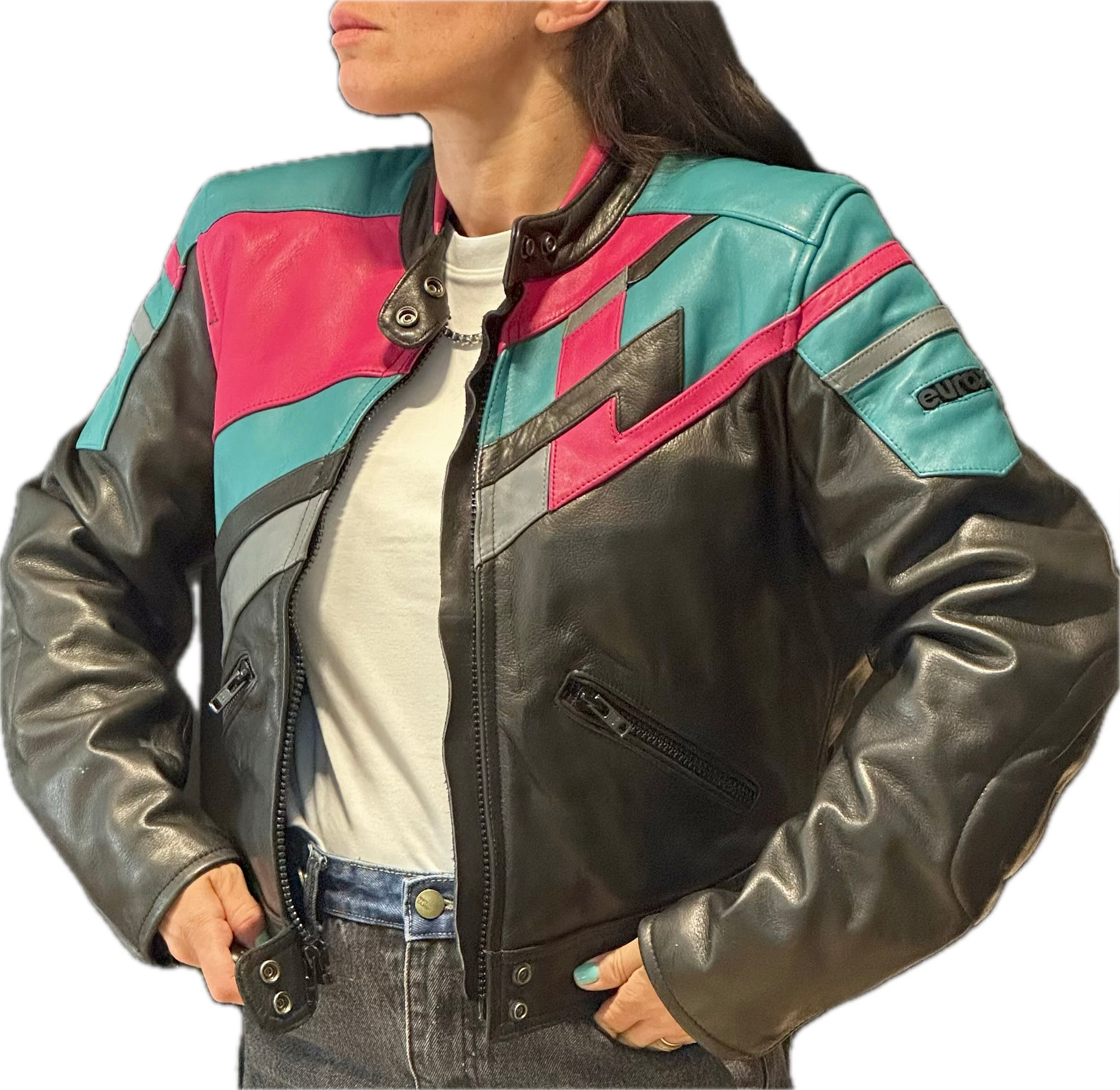 Confectionné dans un cuir noir d'une qualité exceptionnelle, ce blouson se distingue par ses empiècements géométriques vibrants de turquoise et de rose fuchsia. Ces touches de couleurs audacieuses contrastent magnifiquement avec le noir profond, créant un design dynamique et irrésistiblement rétro. Chaque détail de ce blouson est pensé pour captiver le regard, des lignes nettes aux finitions impeccables.