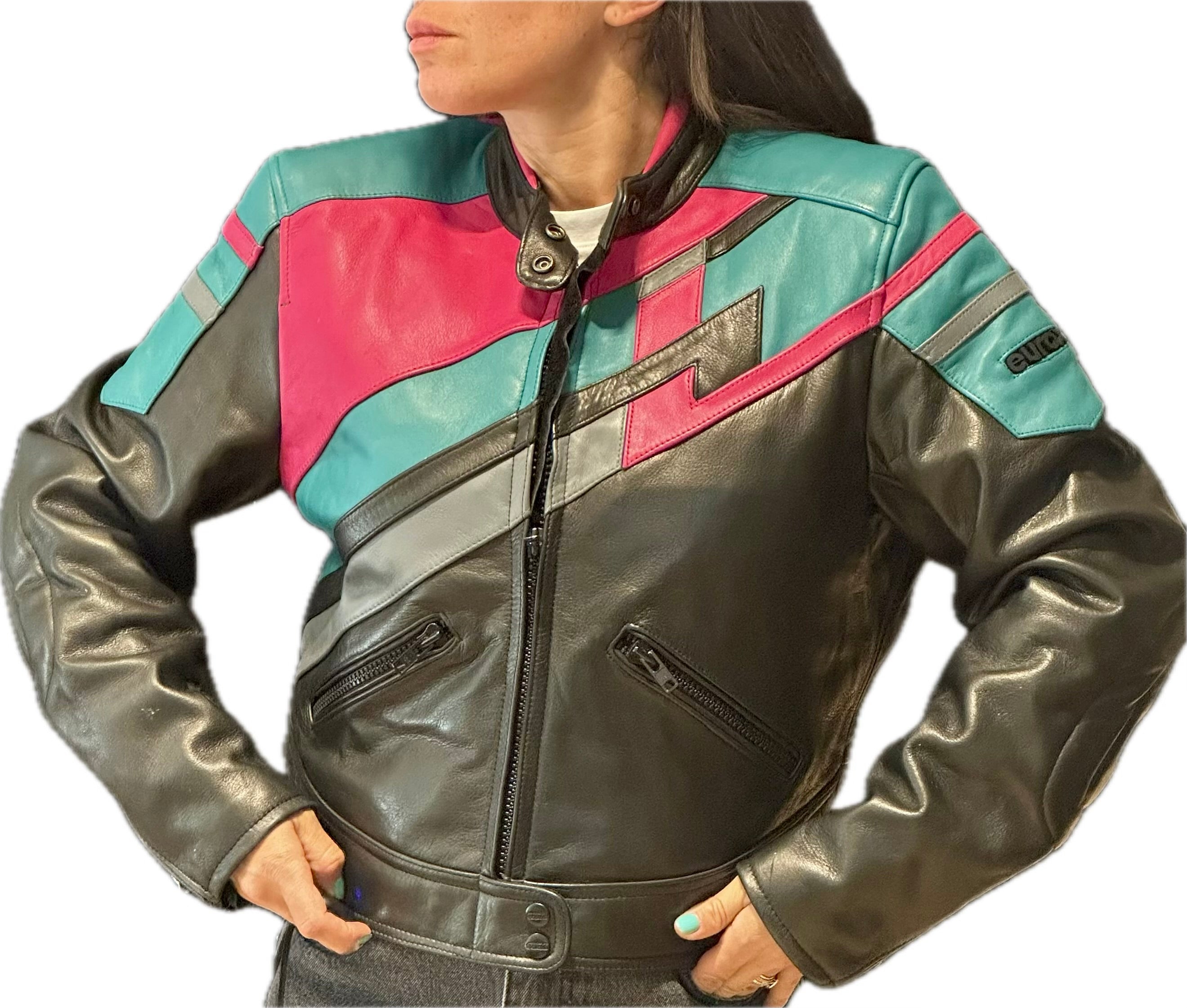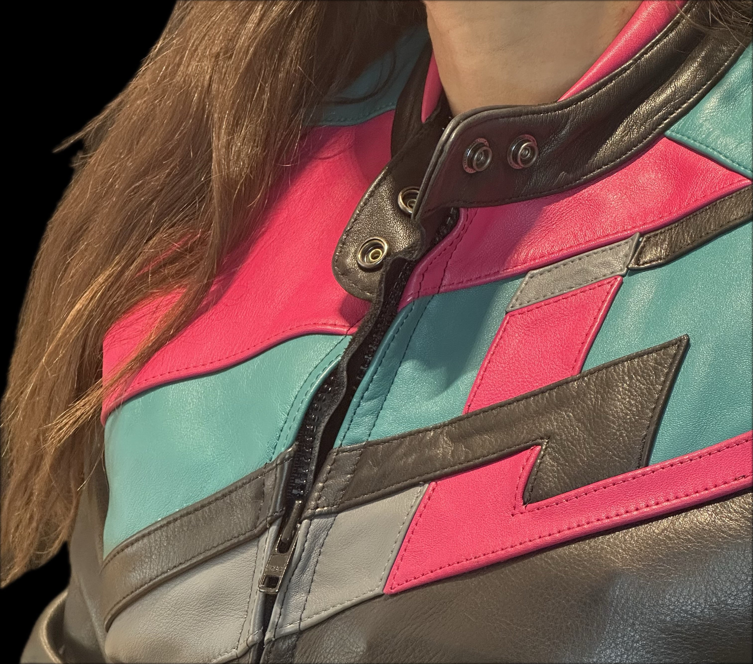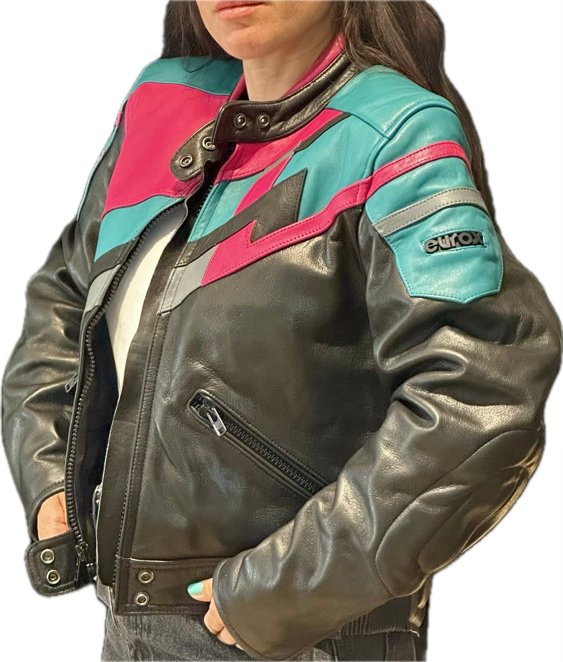 Confectionné dans un cuir noir d'une qualité exceptionnelle, ce blouson se distingue par ses empiècements géométriques vibrants de turquoise et de rose fuchsia. Ces touches de couleurs audacieuses contrastent magnifiquement avec le noir profond, créant un design dynamique et irrésistiblement rétro. Chaque détail de ce blouson est pensé pour captiver le regard, des lignes nettes aux finitions impeccables.