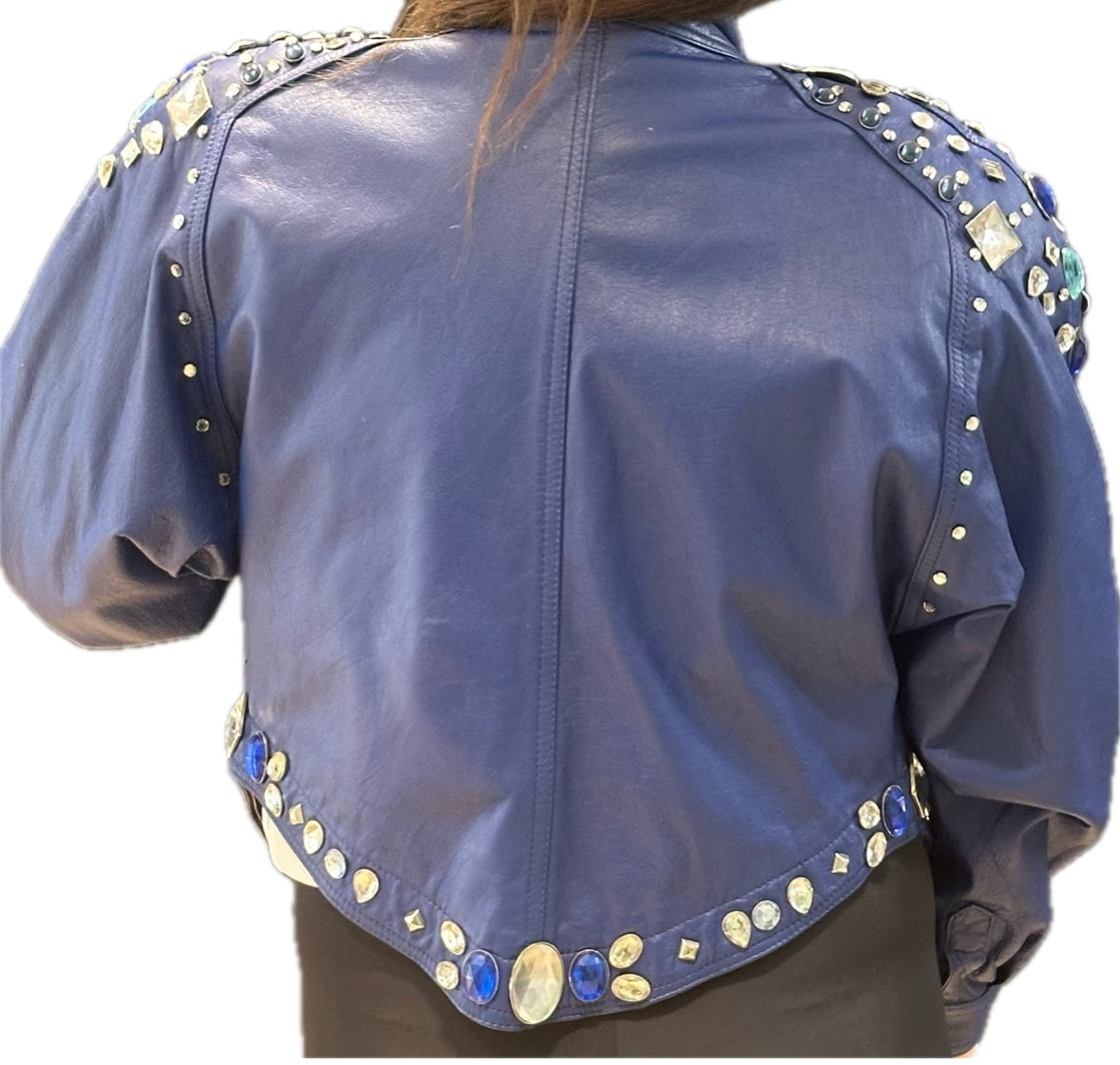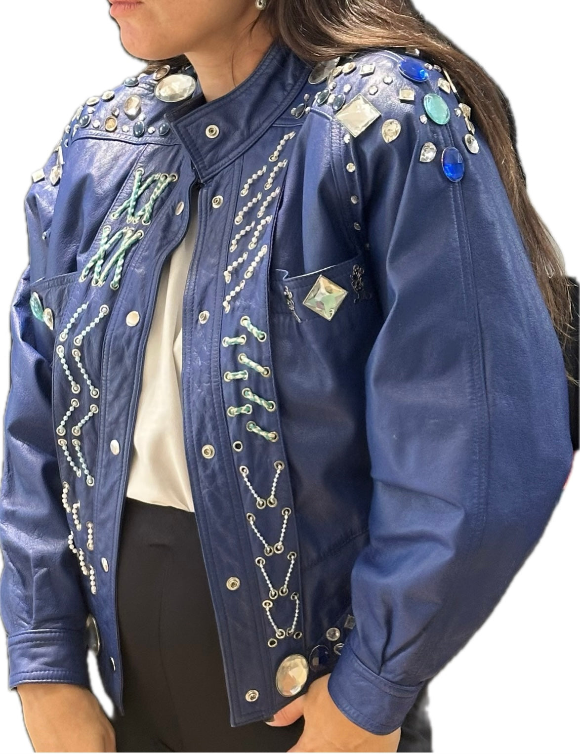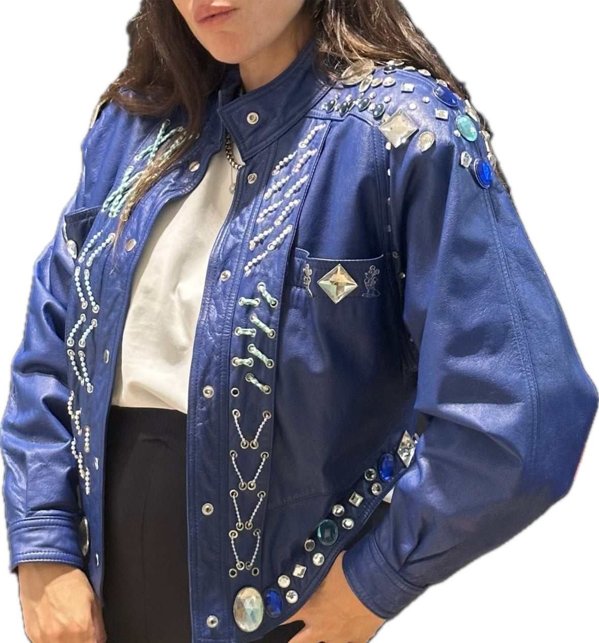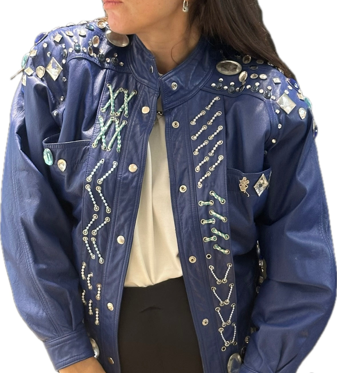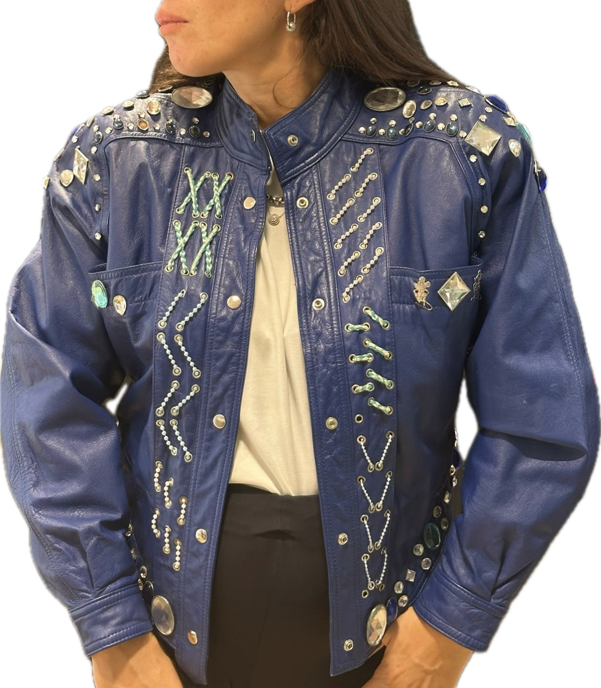 Ce blouson en cuir bleu profond incarne l’essence du vintage revisité. Entièrement customisé à la main, il se distingue par un travail minutieux de broderies, de perles et de cristaux disposés en motifs géométriques et lignes graphiques. Chaque détail, du laçage turquoise aux strass étincelants sur les épaules, fait de cette pièce une véritable œuvre d’art portable.