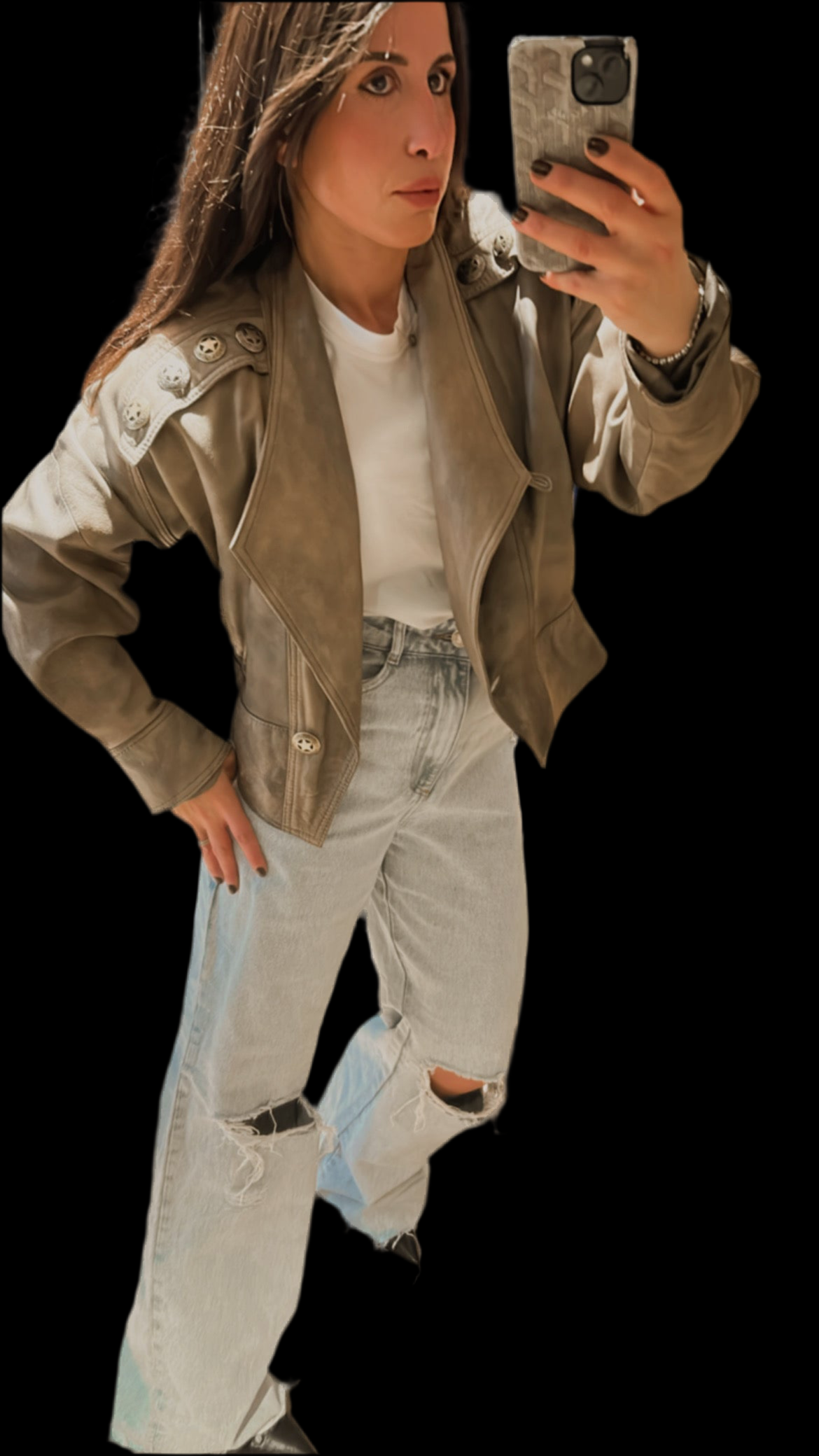 * Style : Blouson court de style aviateur ou motard, avec une coupe légèrement ample et des manches bouffantes.
