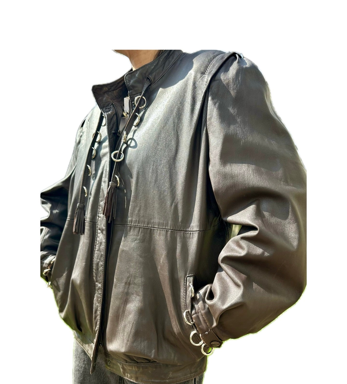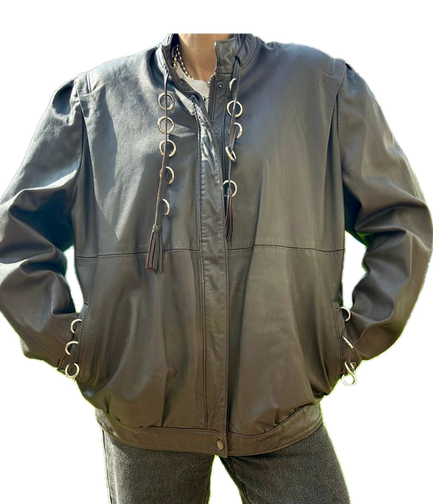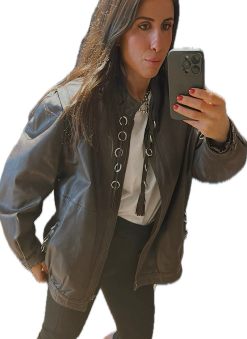 Blouson en Cuir Marron Customisé Anneaux - Pièce Vintage Unique - Taille 42