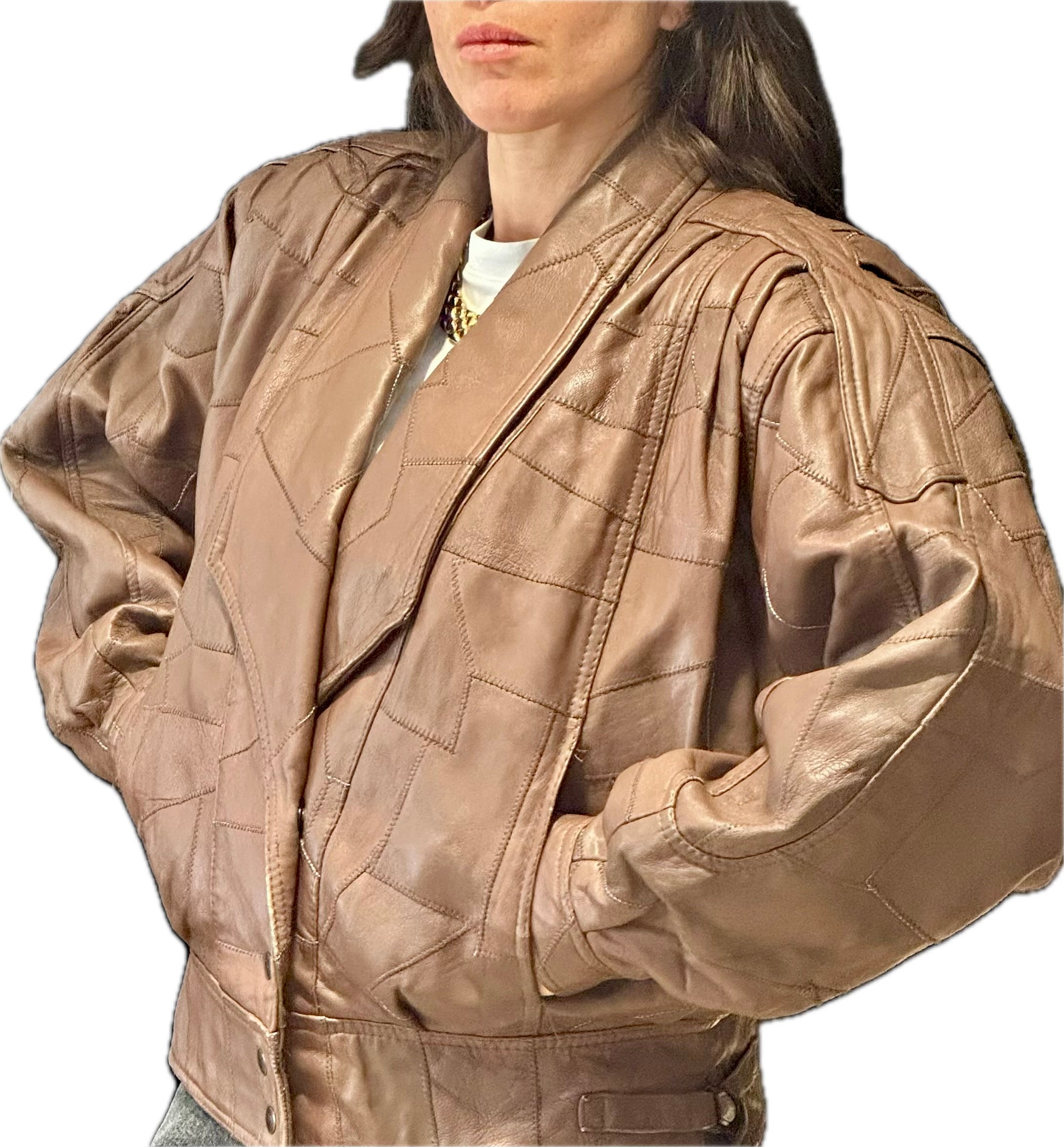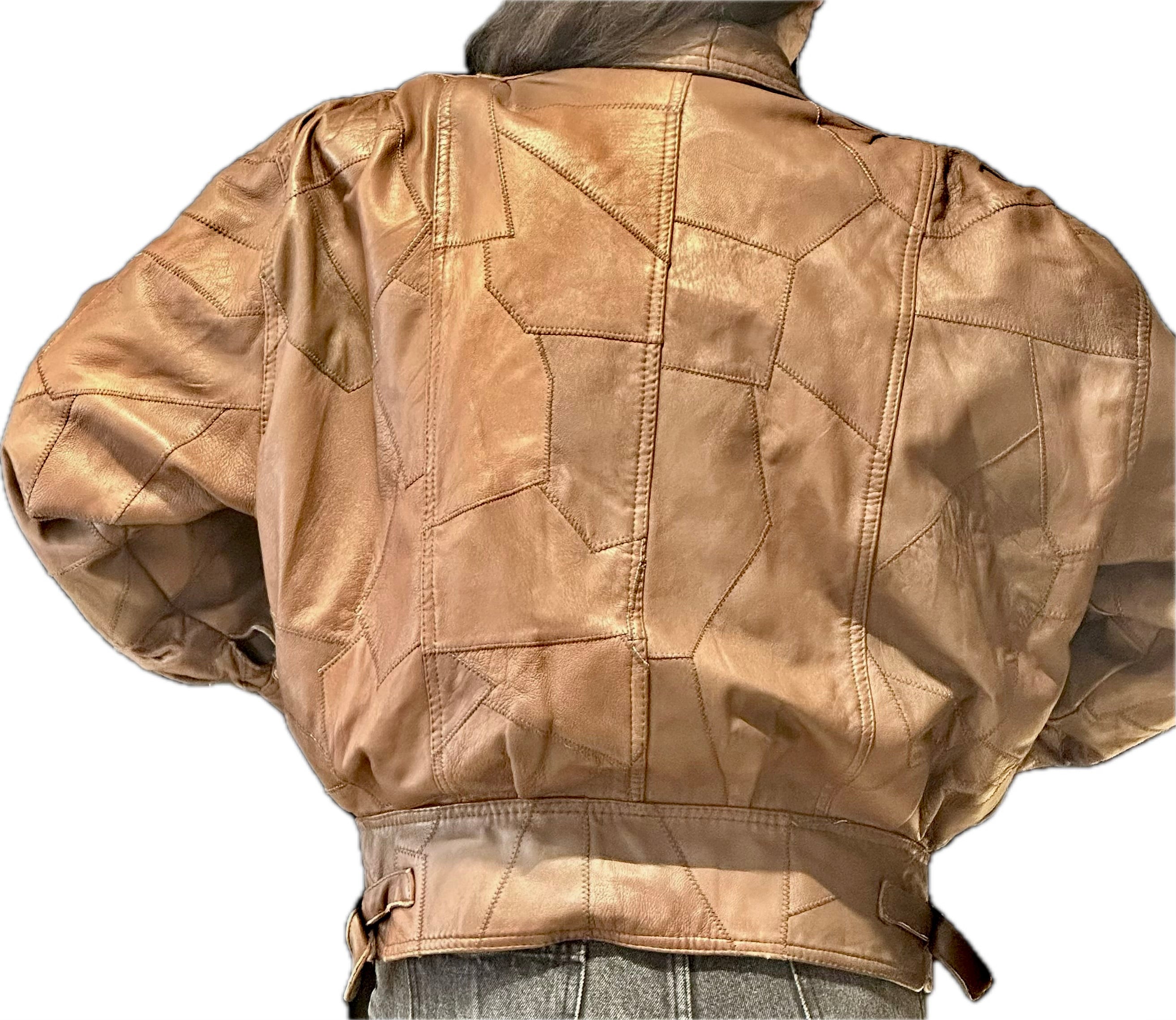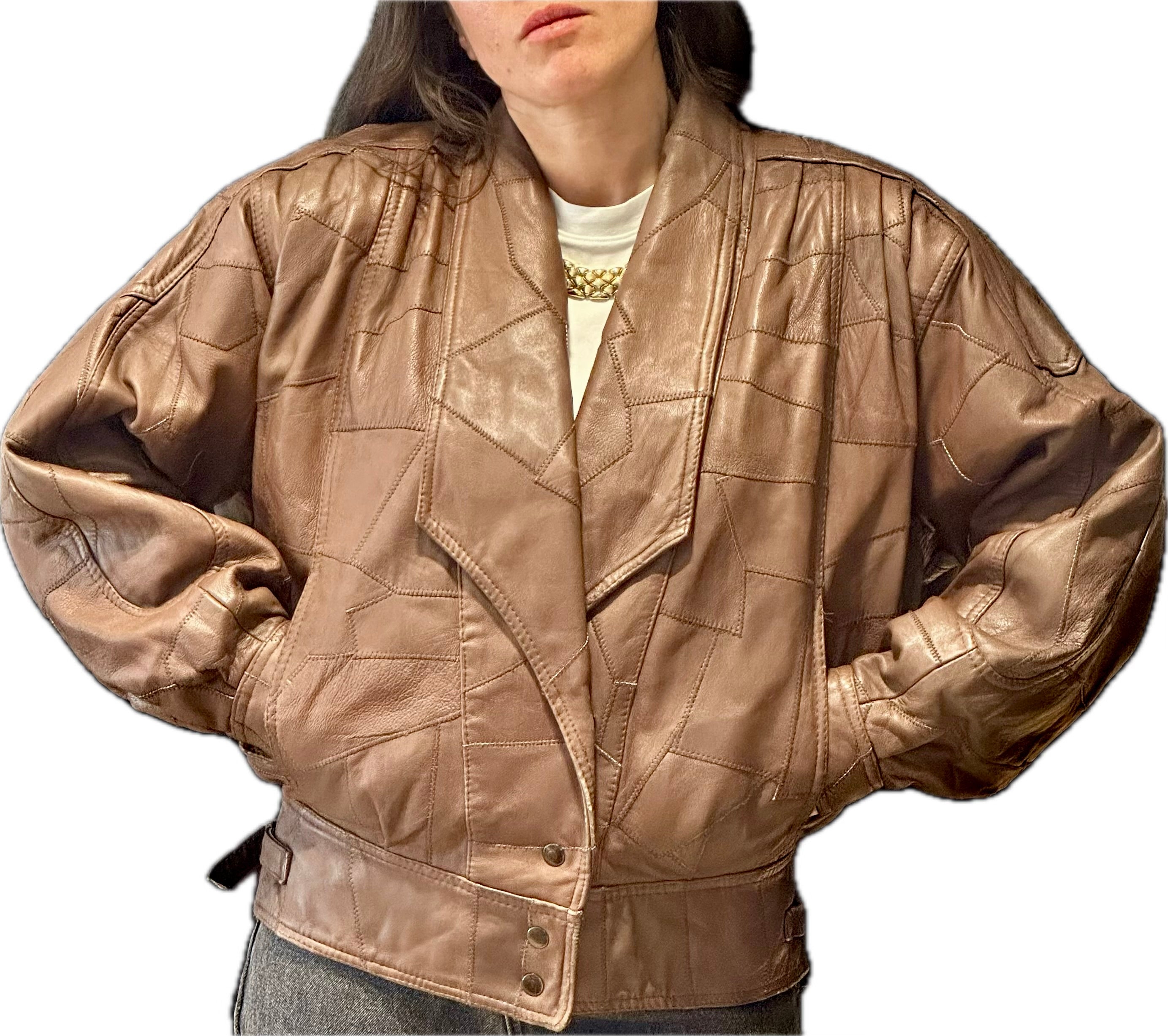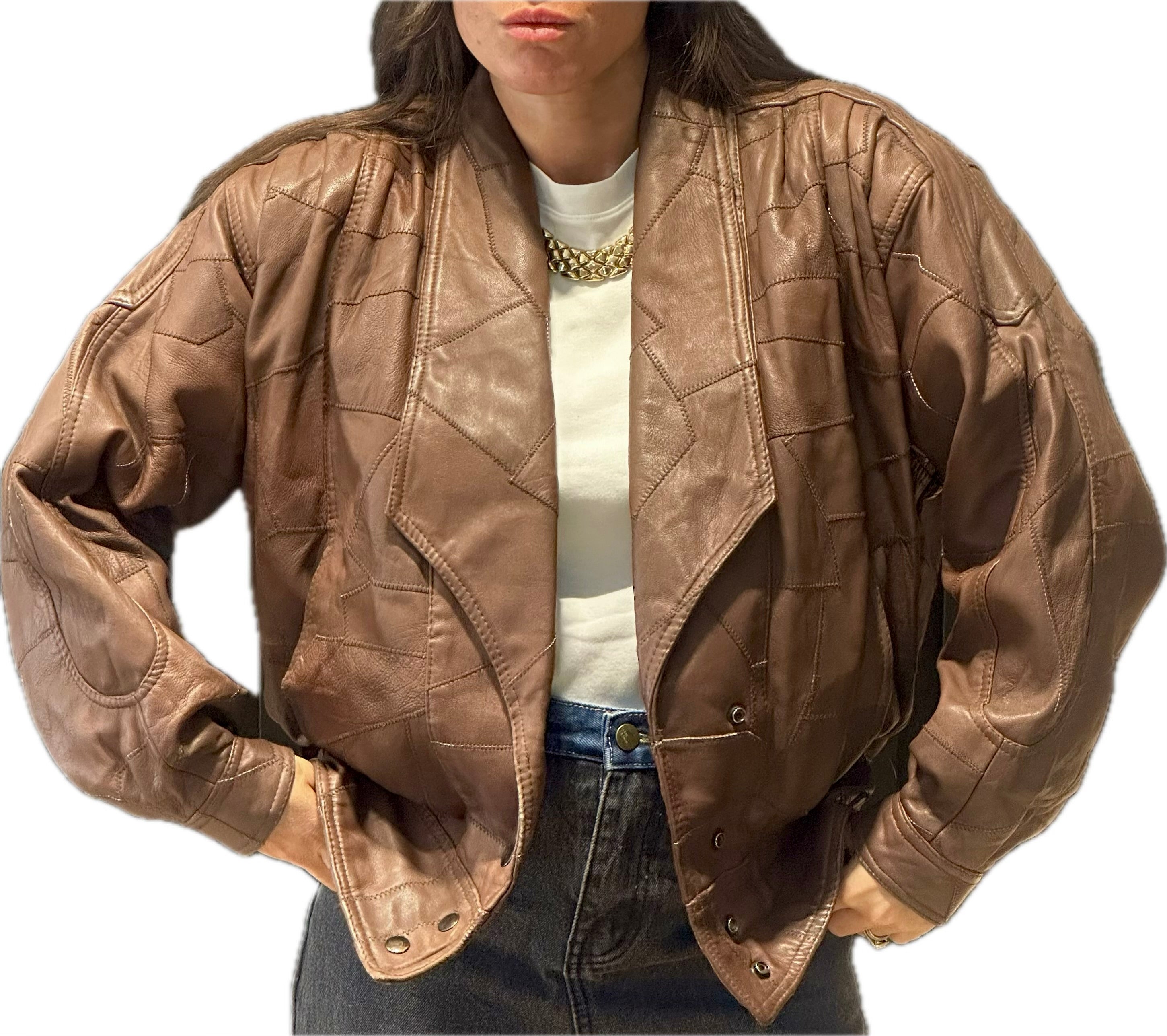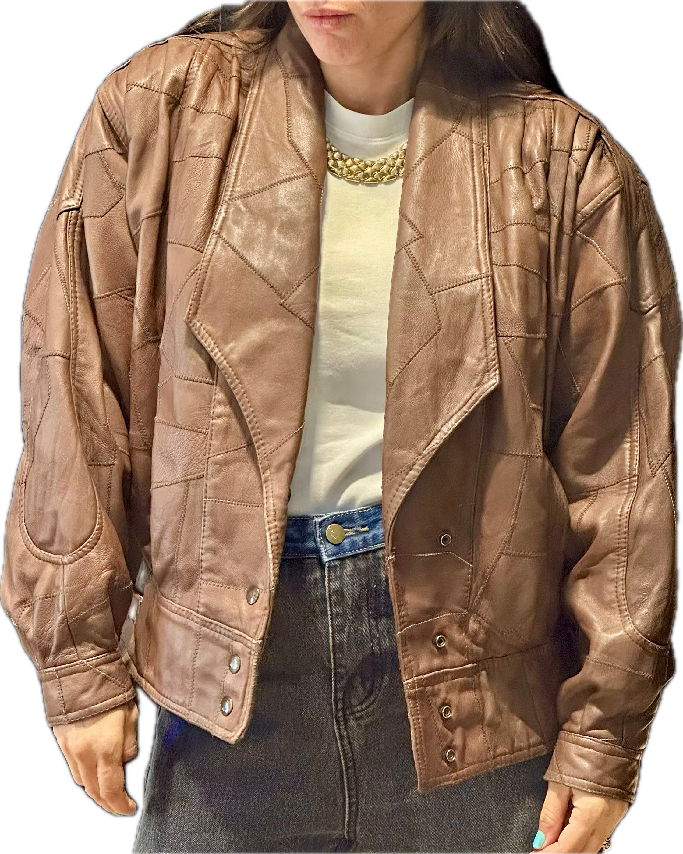 Blouson en Cuir Vintage – Patchwork Marron Texturé, Coupe Épaules Épaules, Taille Unique & Sublime !