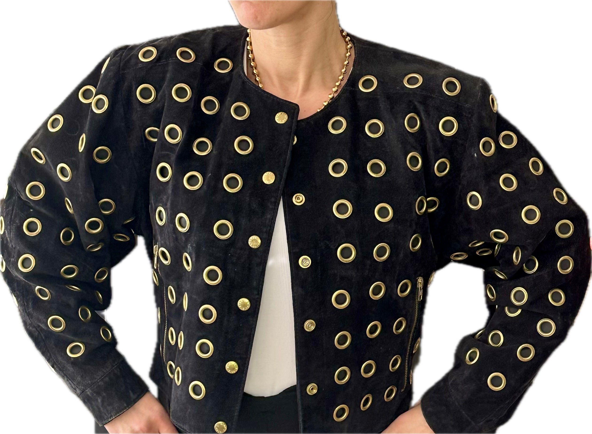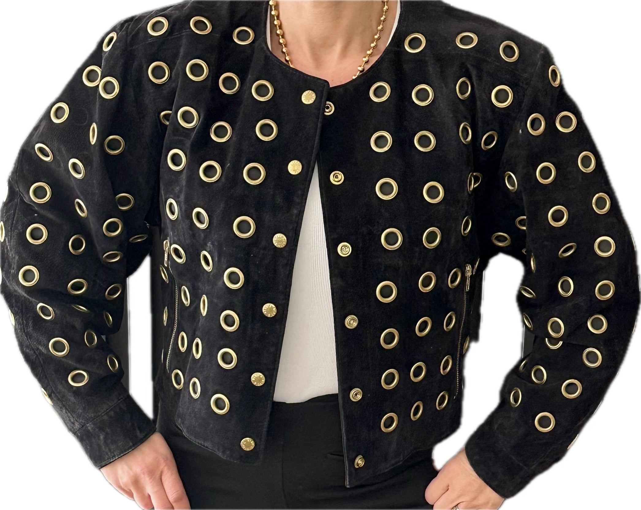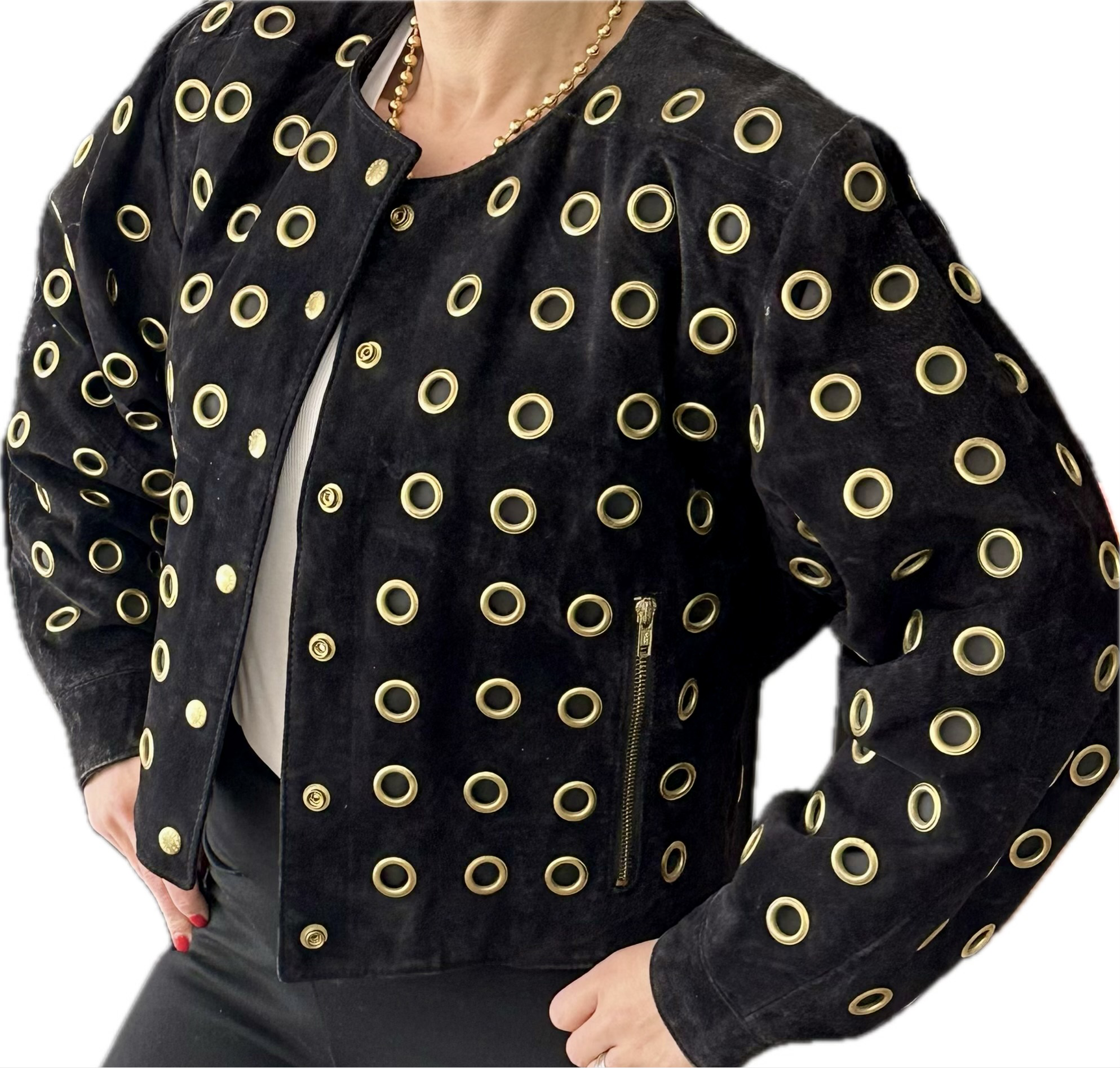 Blouson en Cuir Vintage Daim Noir et Œillets Dorés - Taille Unique - Merveille de Style