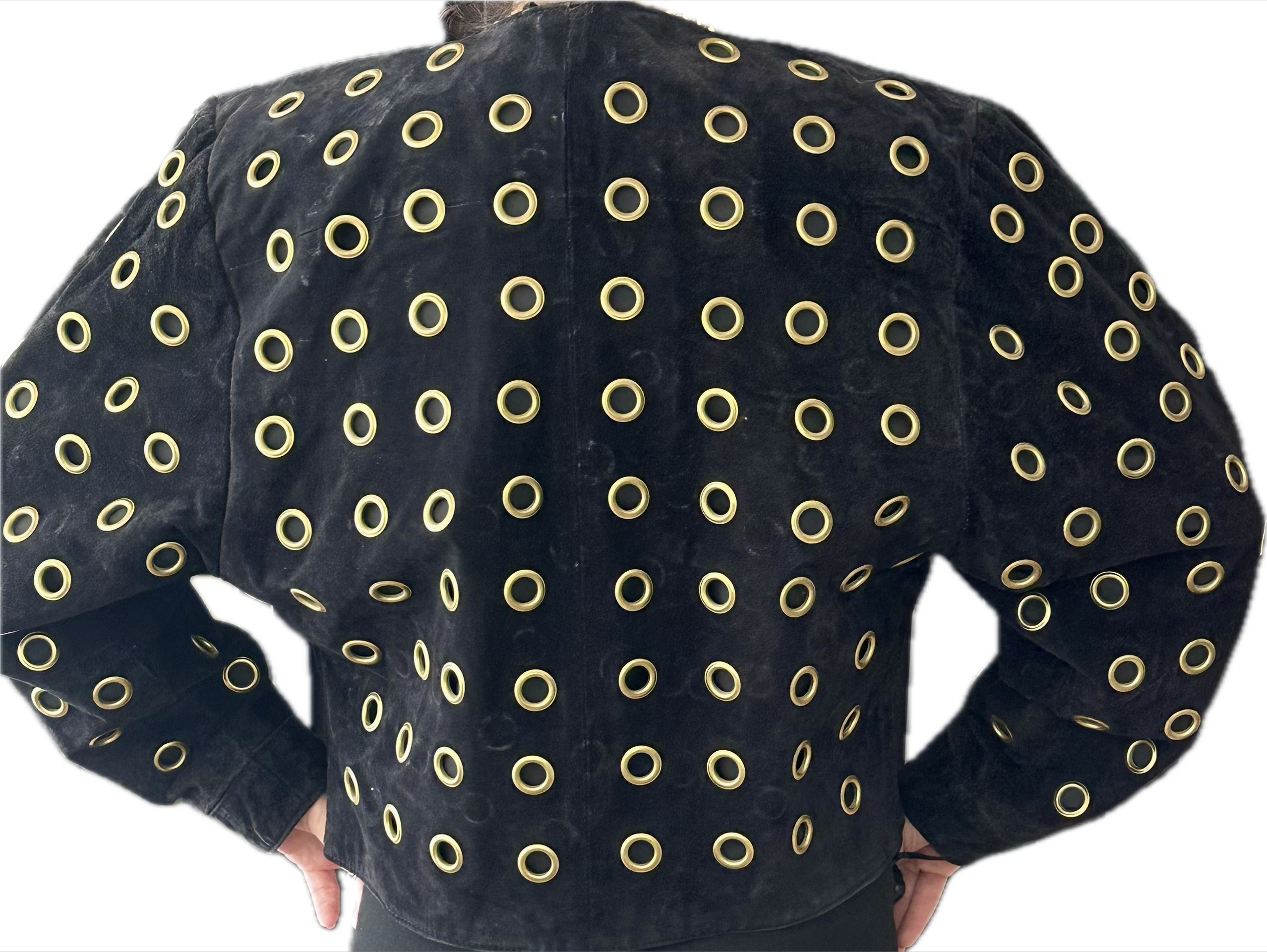 Succombez au charme unique de ce blouson en cuir vintage confectionné en daim noir d'une douceur exquise. Son allure audacieuse est magnifiée par une multitude d'œillets dorés, méticuleusement appliqués sur l'ensemble de la pièce, créant un contraste saisissant et un effet texturé captivant.