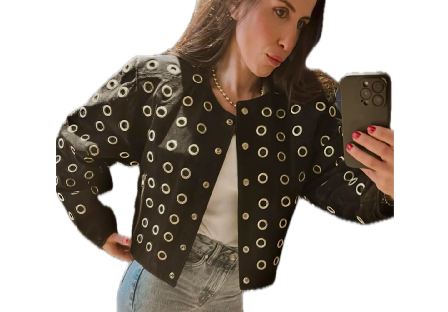 Ce blouson en daim noir orné d'œillets dorés est une pièce maîtresse qui apportera une touche d'éclat à toutes vos tenues. Portez-le sur un top uni et un jean pour un look rock et tendance, ou associez-le à une robe noire pour un contraste sophistiqué et audacieux. Les détails dorés apporteront une touche de lumière à votre allure.