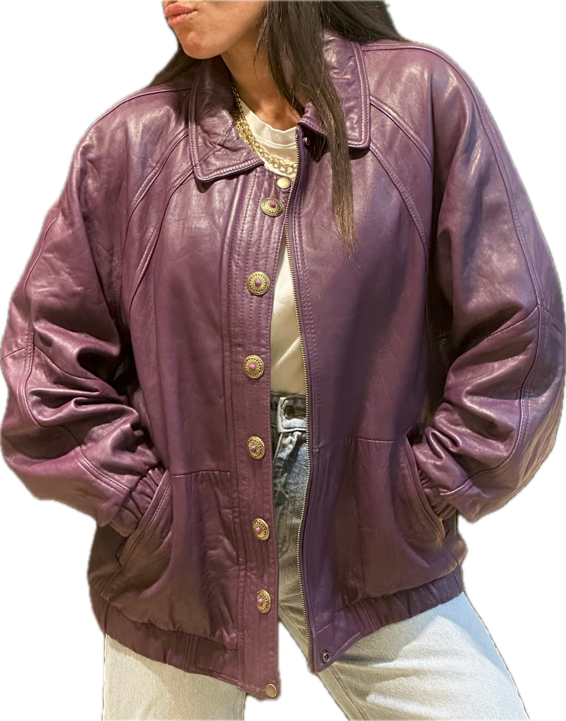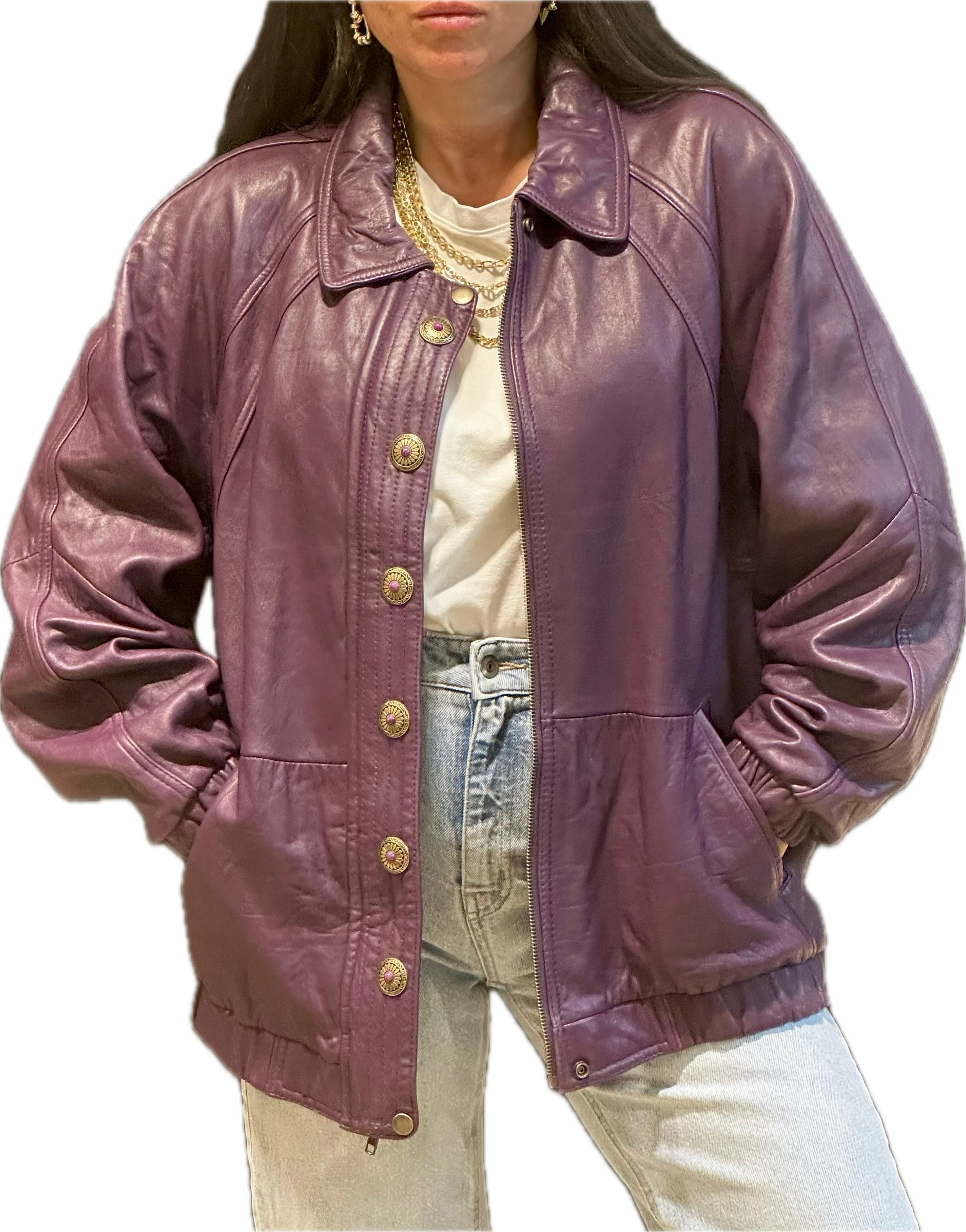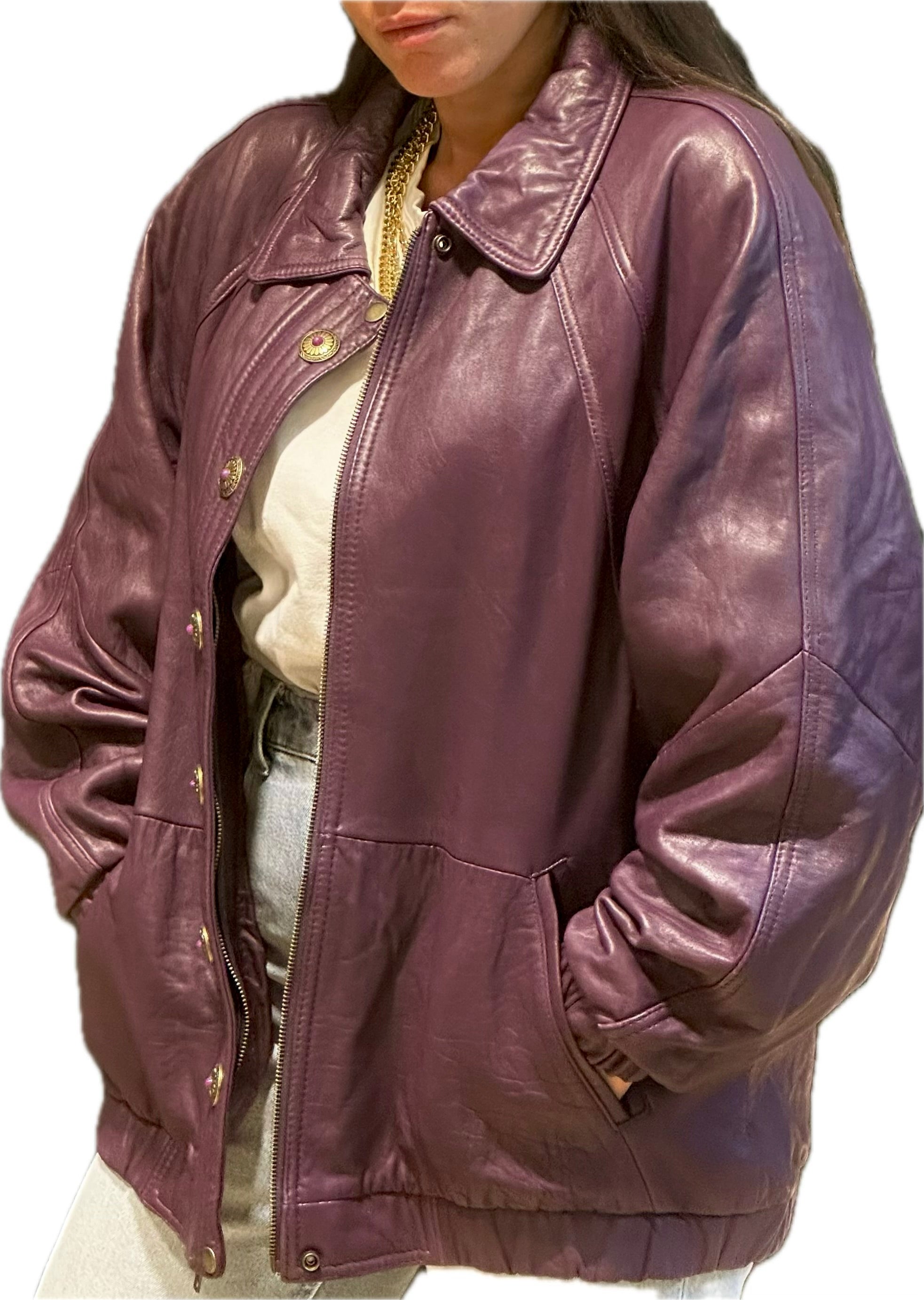 Affirmez votre style avec ce magnifique blouson bomber en cuir vintage, une pièce unique qui allie l'authenticité d'une époque passée à une touche de modernité personnalisée. Son cuir souple et de qualité supérieure, d'un violet profond et envoûtant, offre un look audacieux et sophistiqué qui ne passe pas inaperçu.
