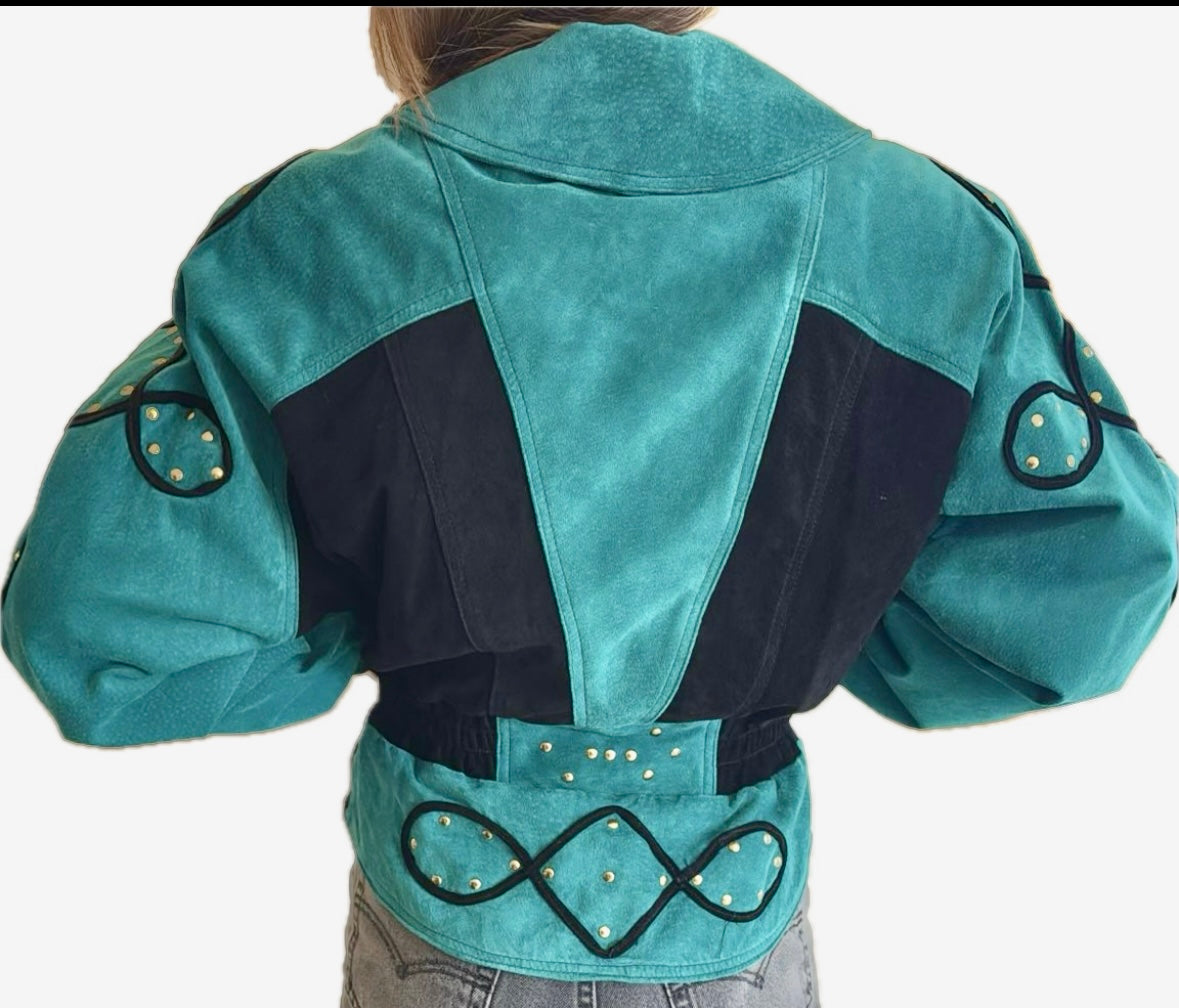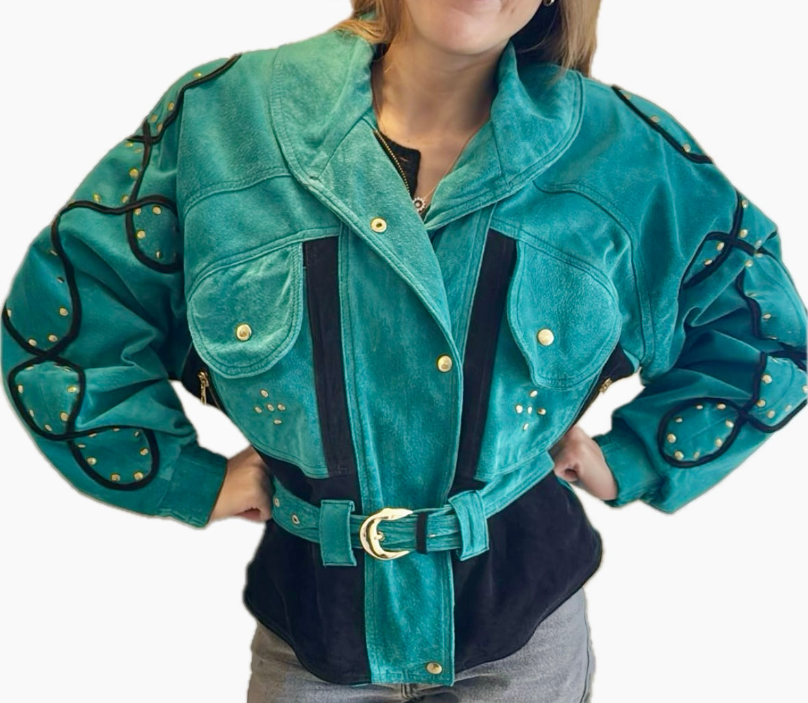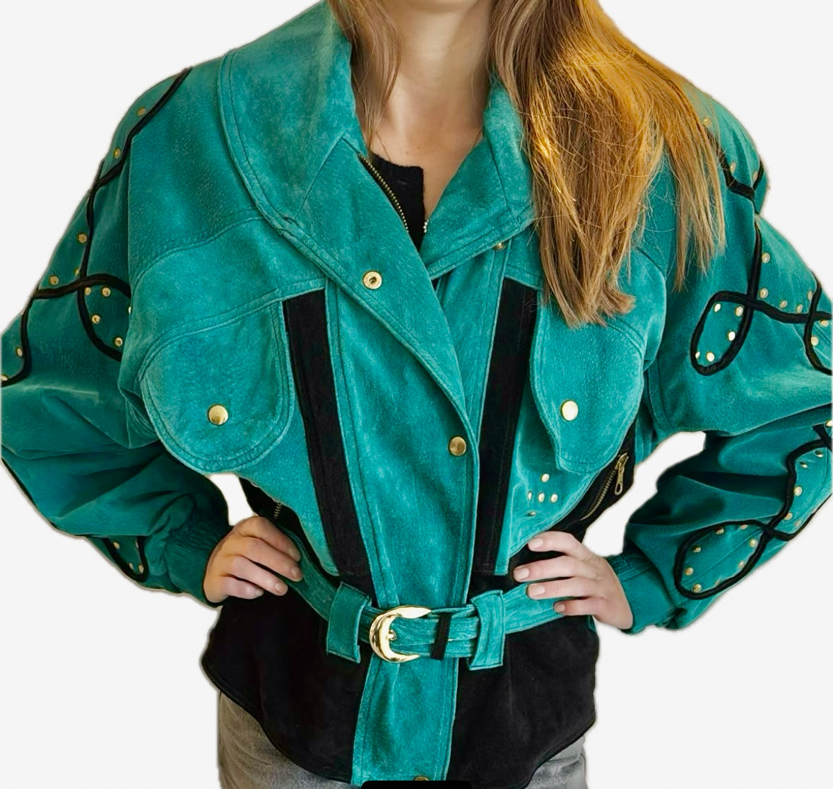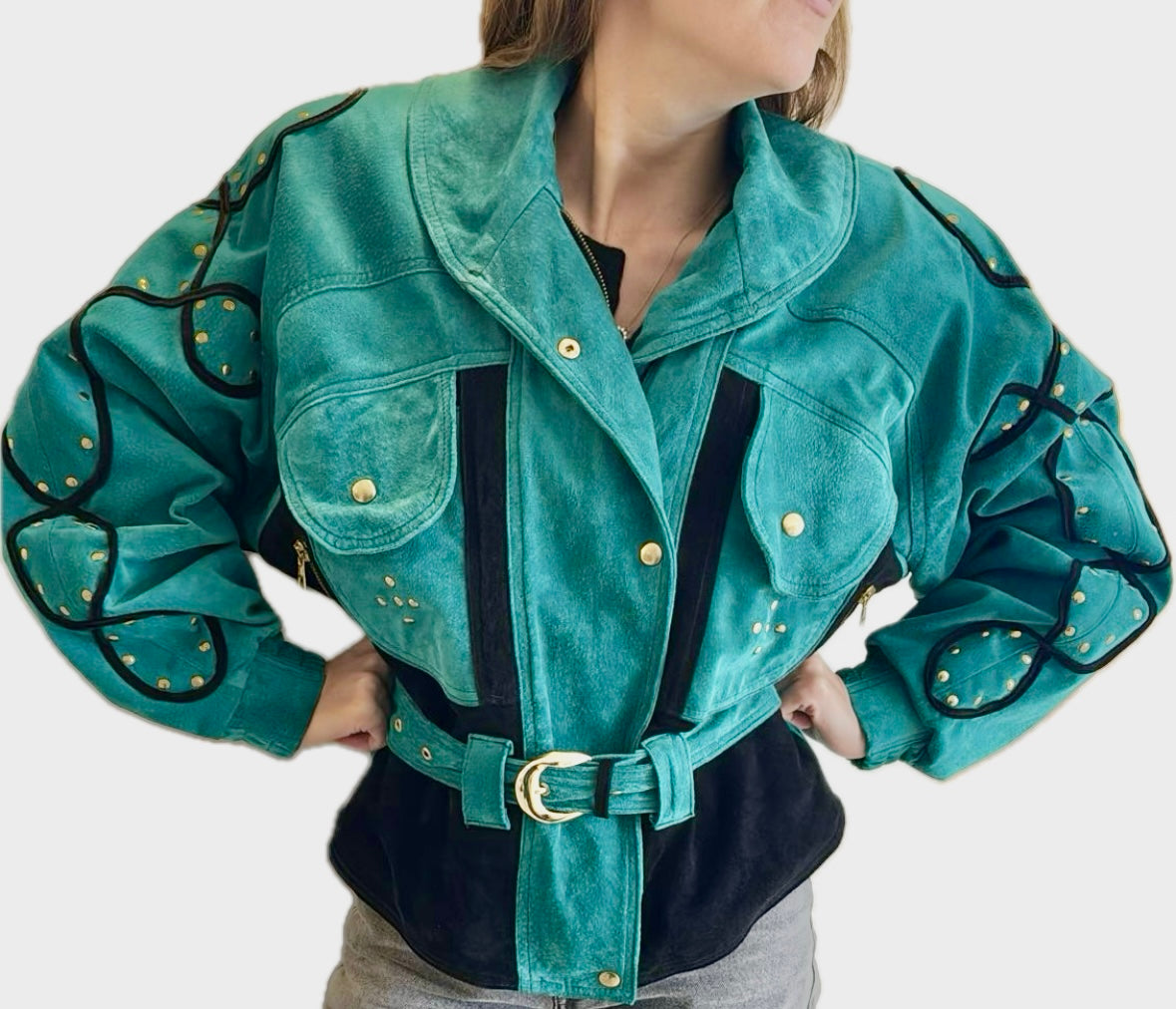 Pièce exceptionnelle et totalement customisée à la main, ce blouson en daim véritable mixe un vert intense et profond avec des empiècements noirs contrastés, dans un esprit 100% vintage rock-chic.
