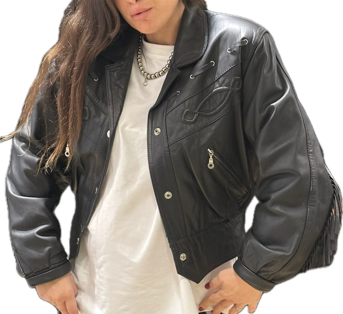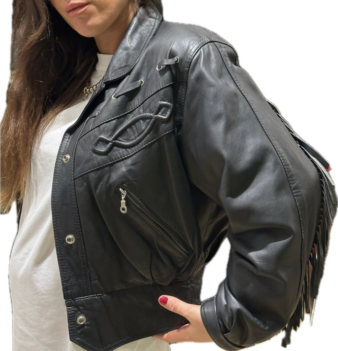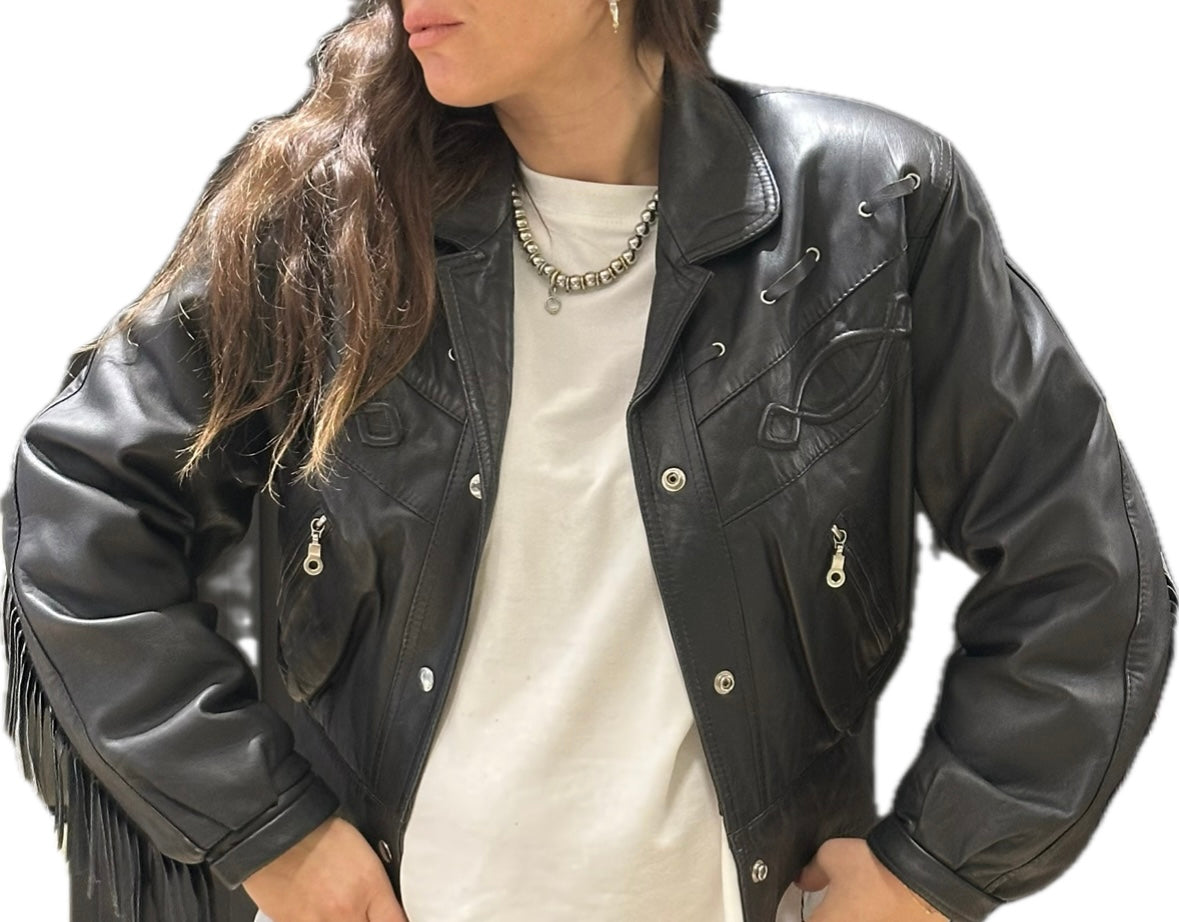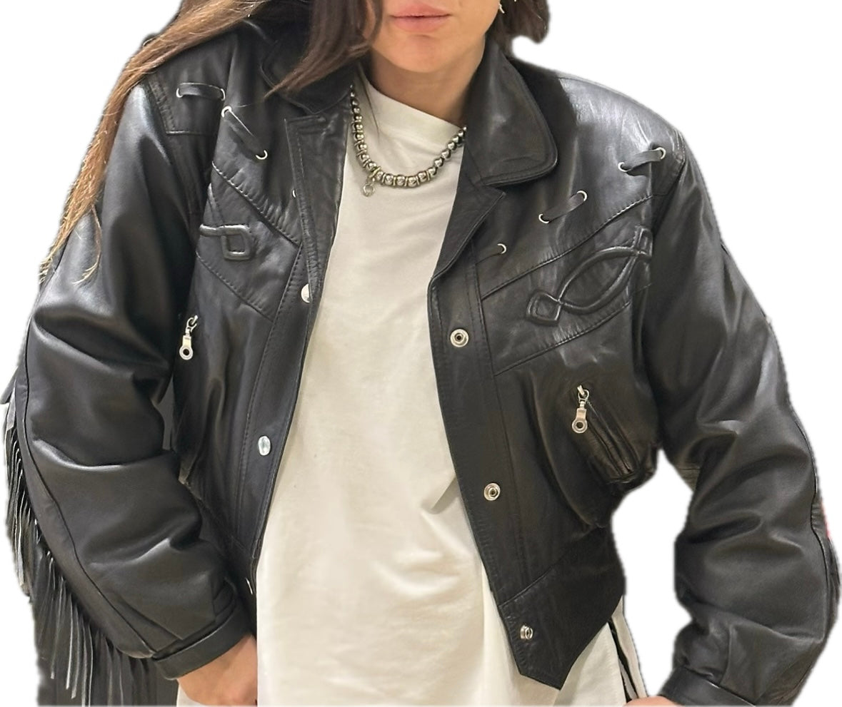Confectionné dans un cuir souple noir, il se distingue par ses franges placées avec soin sur les manches et le dos, offrant un mouvement fluide et une allure audacieuse.