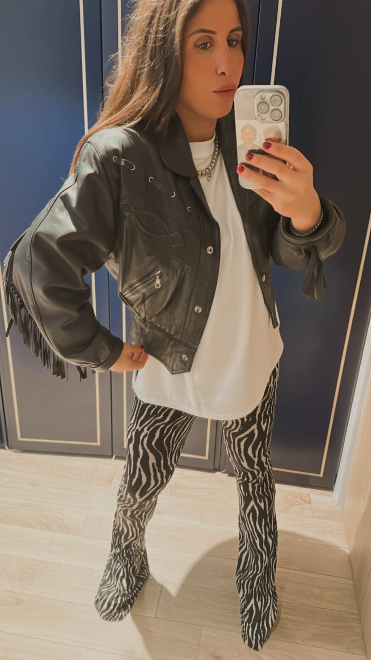 - Détails : franges au dos et sur les manches, œillets décoratifs, poches zippées
