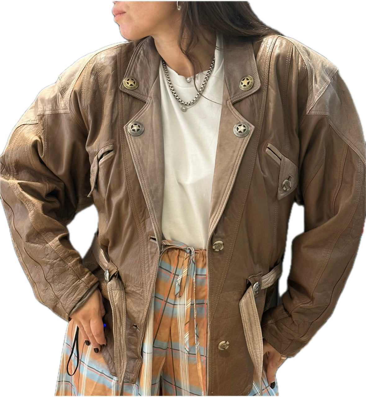 Customisé à la main, il se distingue par sa coupe oversize, ses détails western revisités et sa ceinture à nouer qui structure la silhouette.