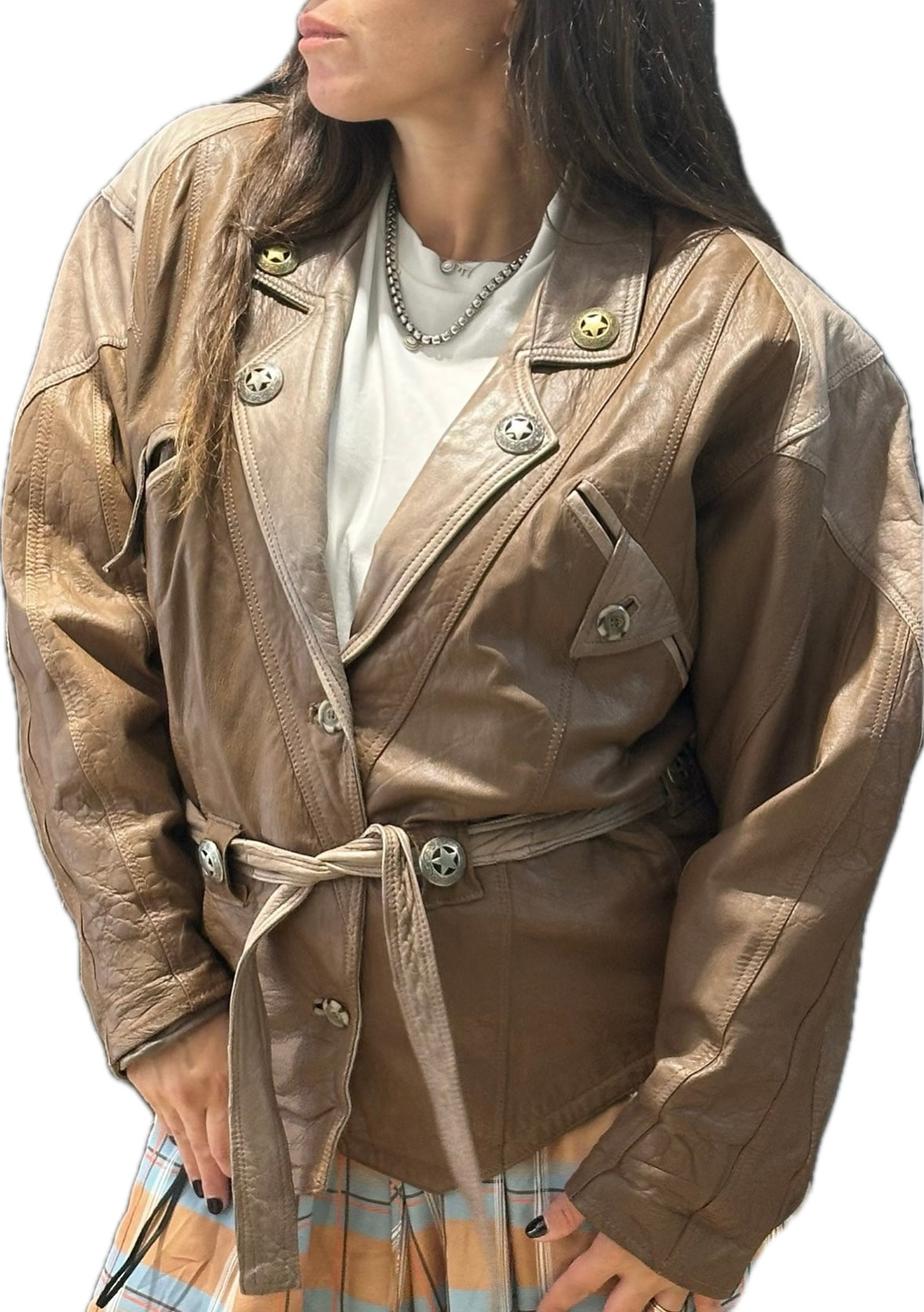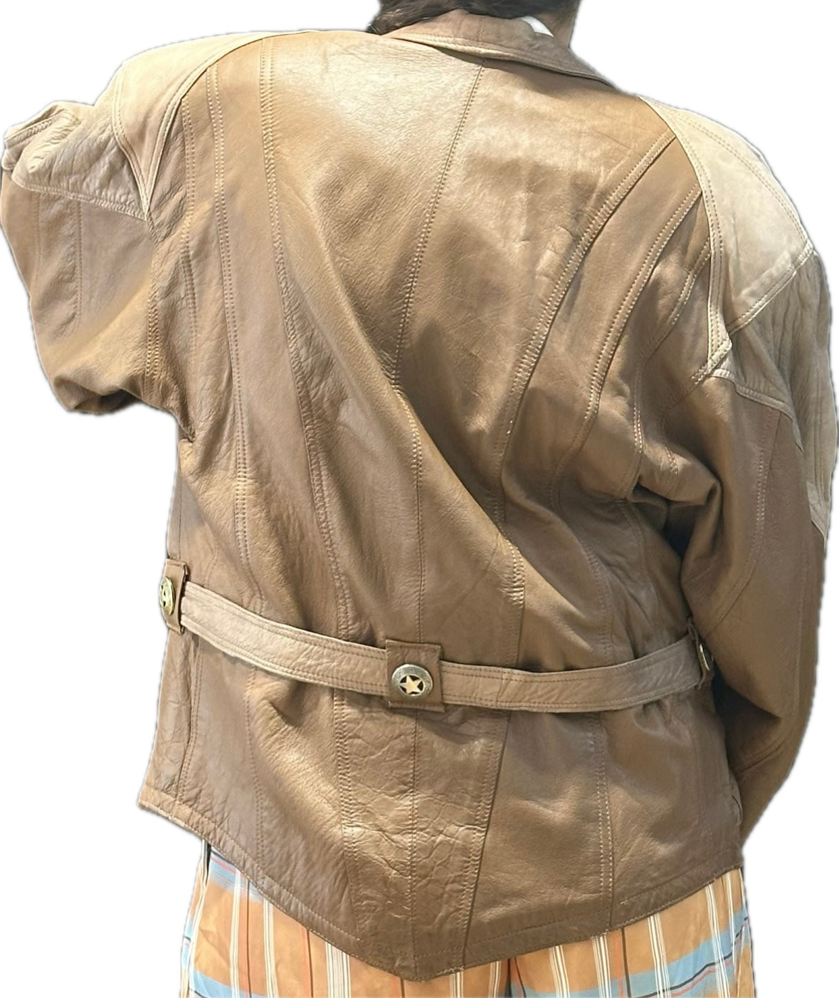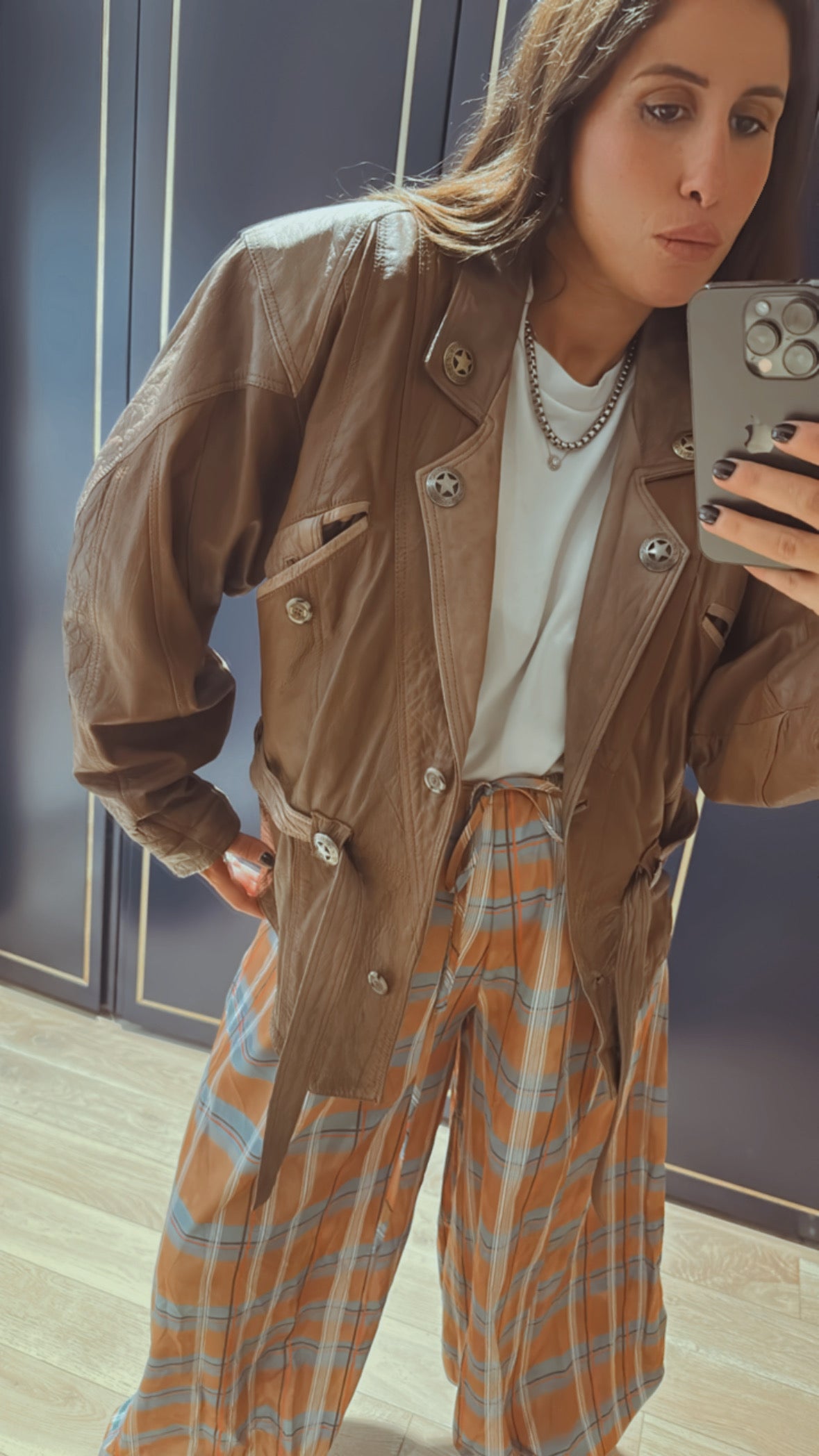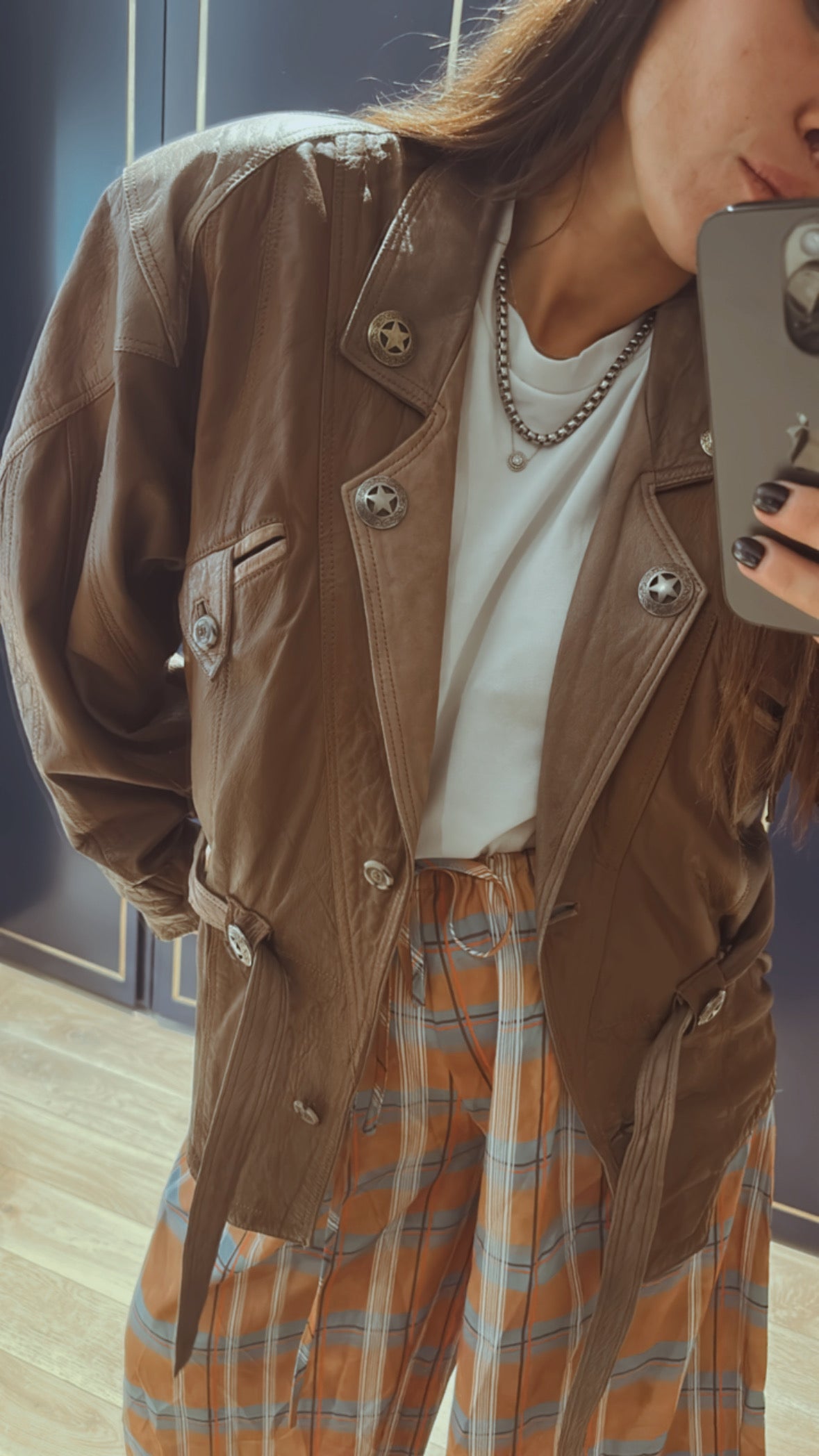 Pièce d’exception signée Luze Vintage, ce blouson en cuir camel et beige est un véritable bijou du vestiaire rétro.