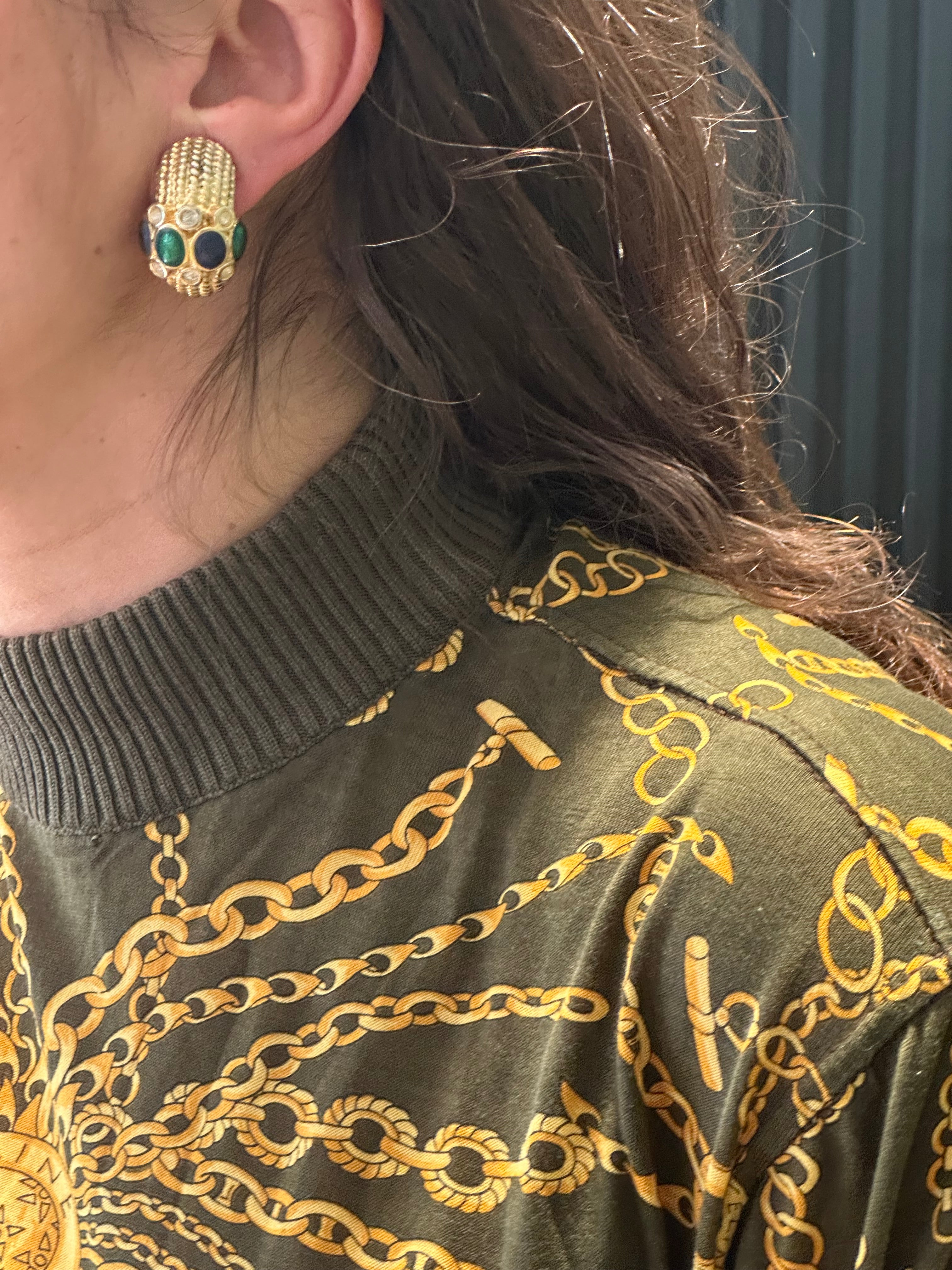 Sublimes boucles d’oreilles vintage à clips, au design riche et sophistiqué. Leur base dorée finement texturée est sublimée par de magnifiques pierres aux nuances bleu profond et vert émeraude, créant un contraste lumineux et ultra chic.