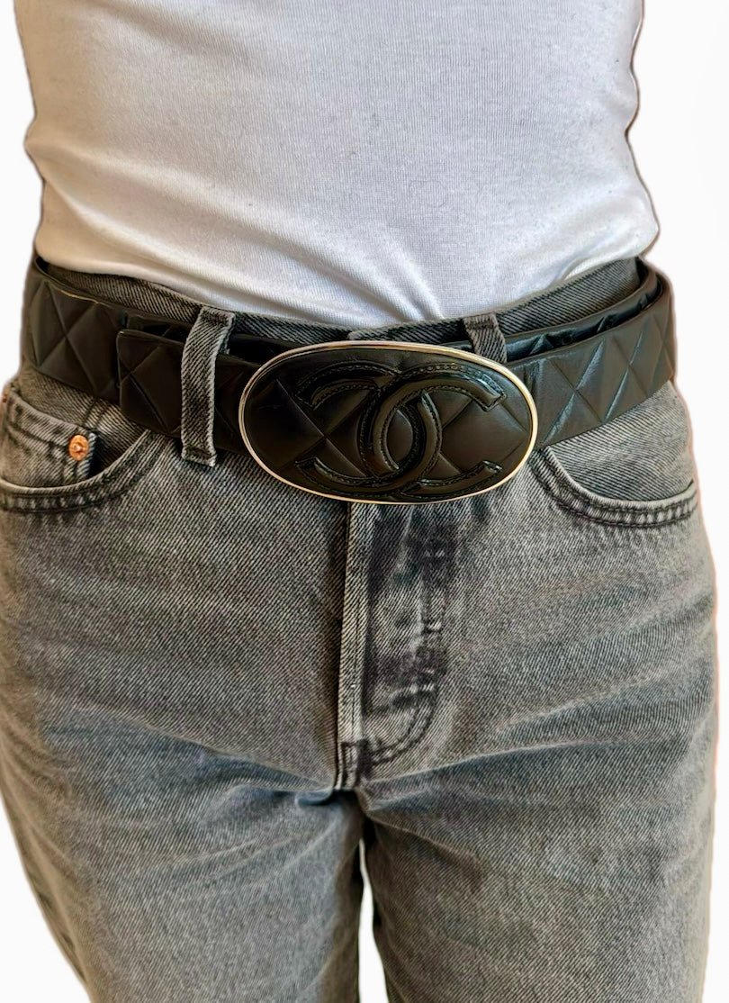 Cette ceinture Chanel Vintage est une pièce authentique en cuir véritable, incarnant l’élégance intemporelle et le caractère des accessoires de luxe d’époque. Sa couleur noire profonde et sa finition légèrement matelassée en losanges lui donnent un style iconique, à la fois chic, structuré et véritablement vintage.