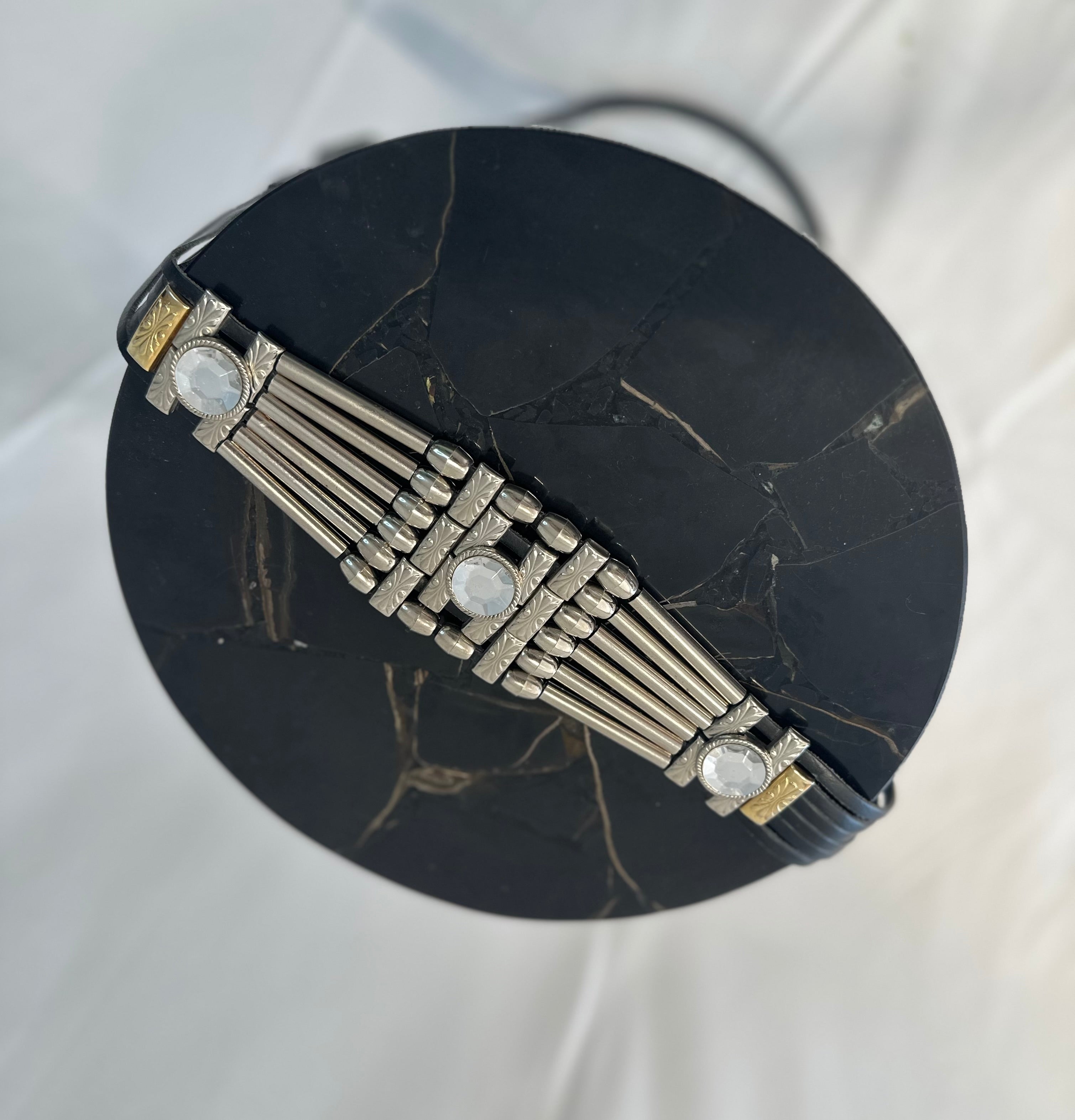 Cette ceinture vintage argentée à empiècements est idéale pour apporter une touche de glamour à une robe, un pantalon taille haute ou même une tunique. Son allure rétro chic ne manquera pas de vous faire remarquer.