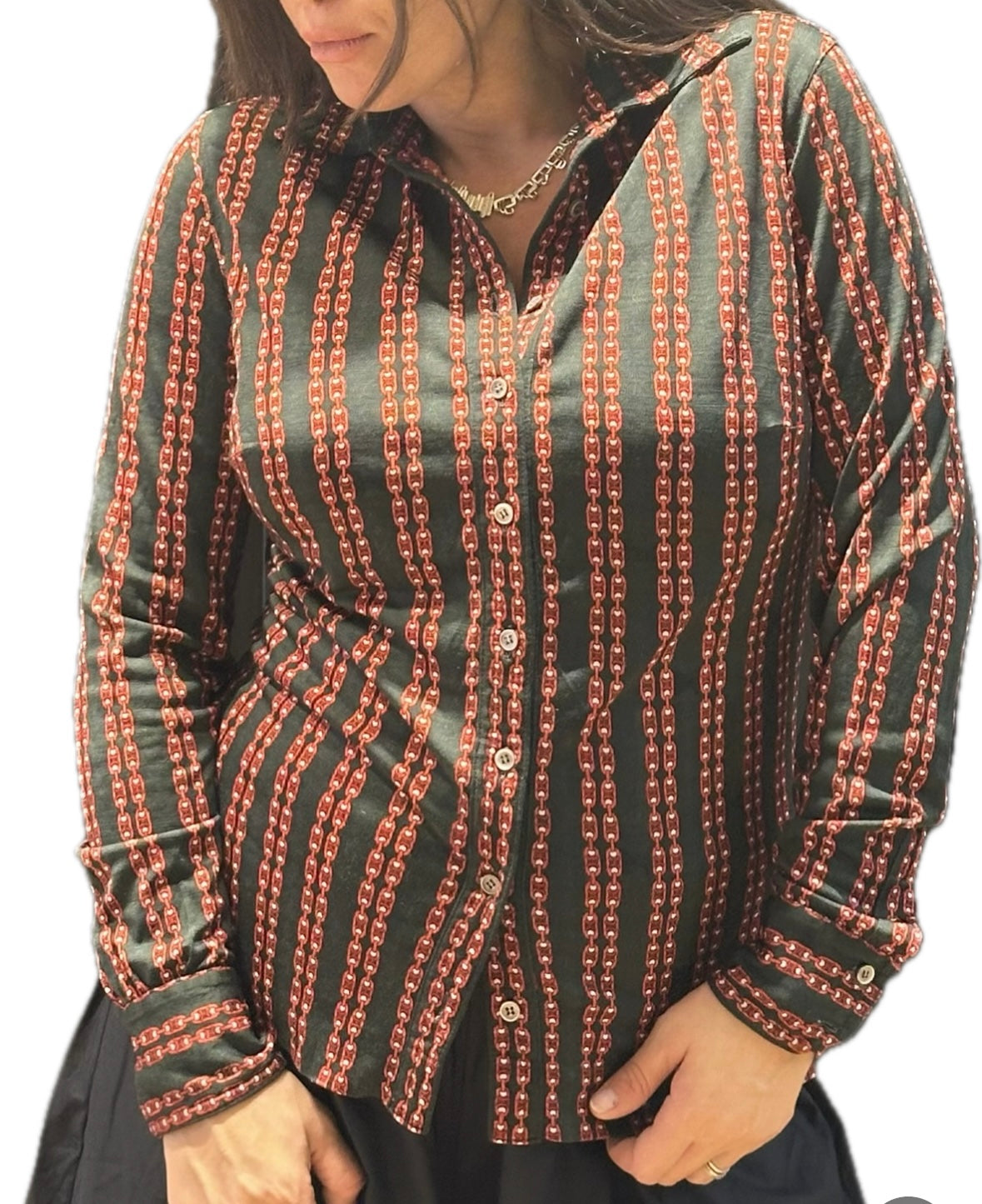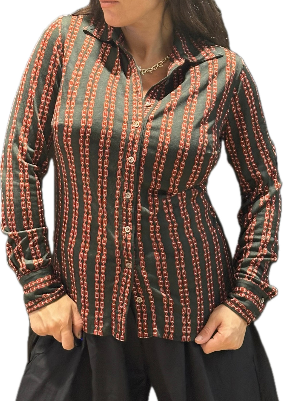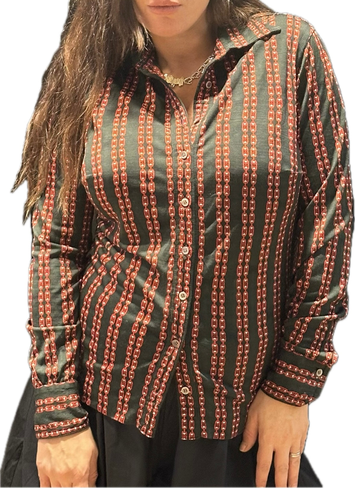 Élégante et raffinée, cette chemise Céline Vintage est une pièce d’exception issue de l’âge d’or de la maison parisienne. Confectionnée en coton de qualité, elle se distingue par sa teinte vert bouteille profonde et son imprimé à motifs Triomphe rouges, symbole intemporel de la marque.