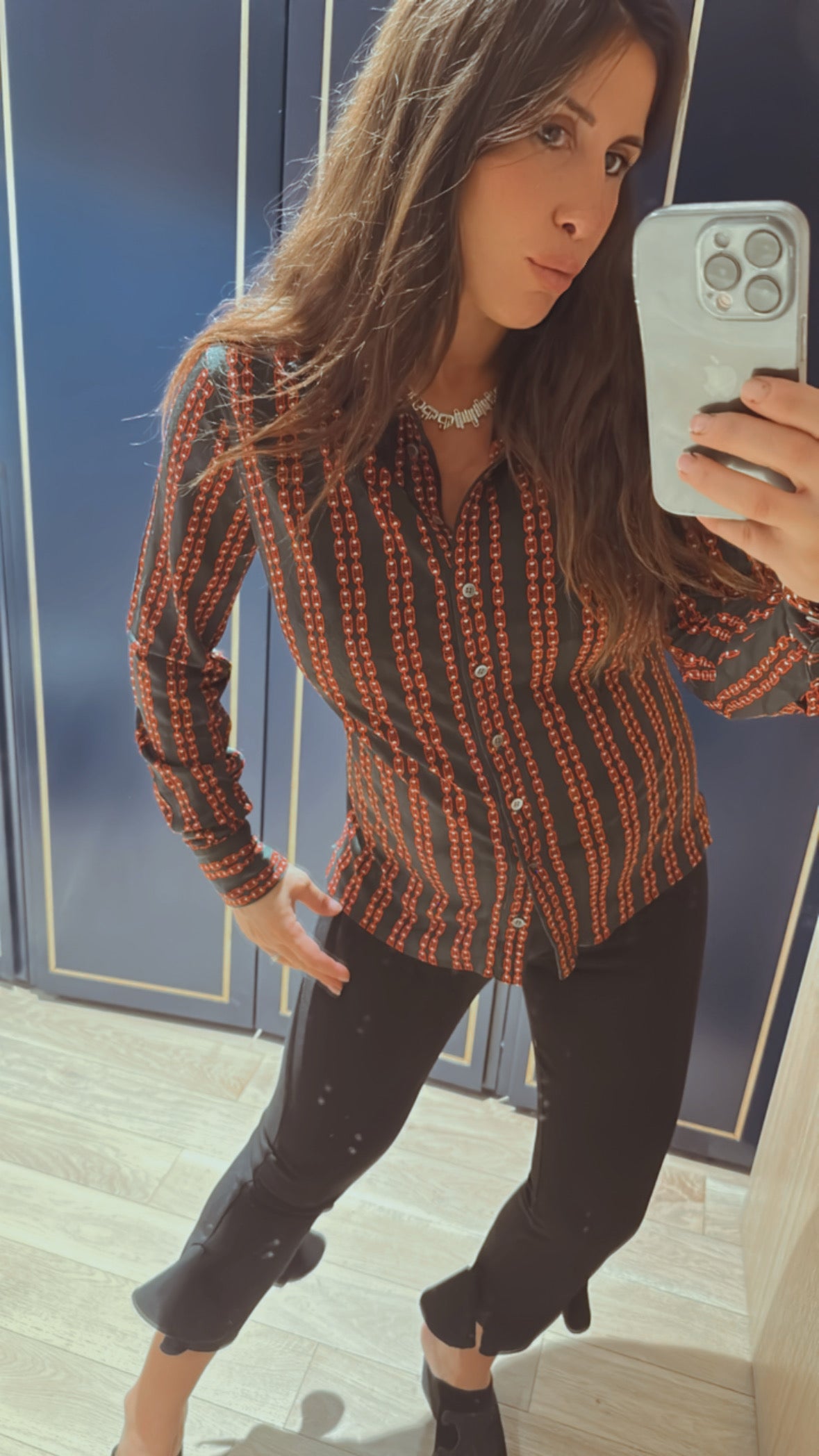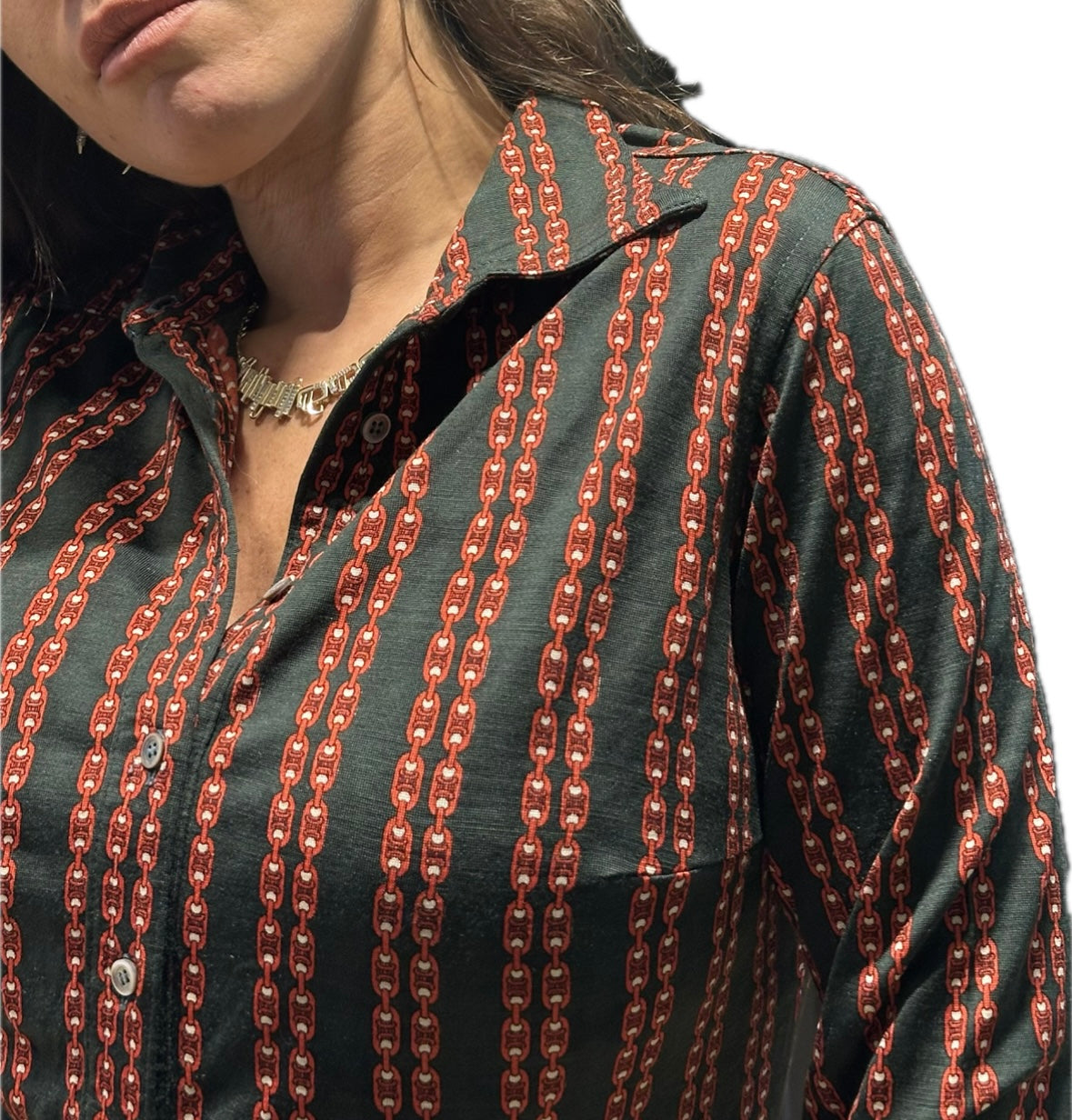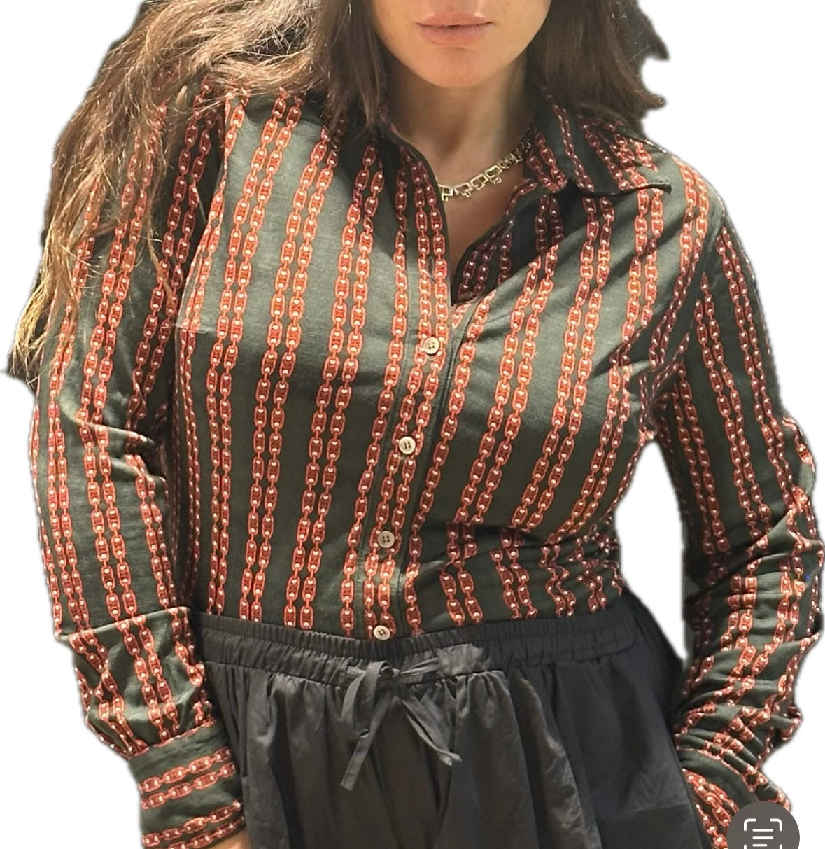 Élégante et raffinée, cette chemise Céline Vintage est une pièce d’exception issue de l’âge d’or de la maison parisienne. Confectionnée en coton de qualité, elle se distingue par sa teinte vert bouteille profonde et son imprimé à motifs Triomphe rouges, symbole intemporel de la marque.