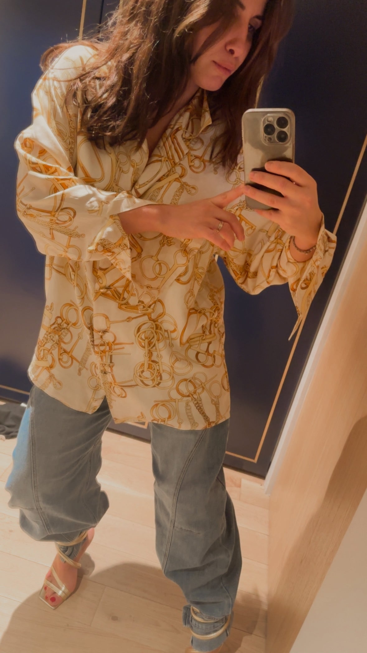Confectionnée dans une soie fluide et lumineuse, elle se distingue par son imprimé signature aux chaînes et étriers dorés sur fond ivoire, emblématique de l’univers équestre de la maison. Un motif raffiné, immédiatement reconnaissable, qui apporte élégance et caractère à n’importe quelle tenue.