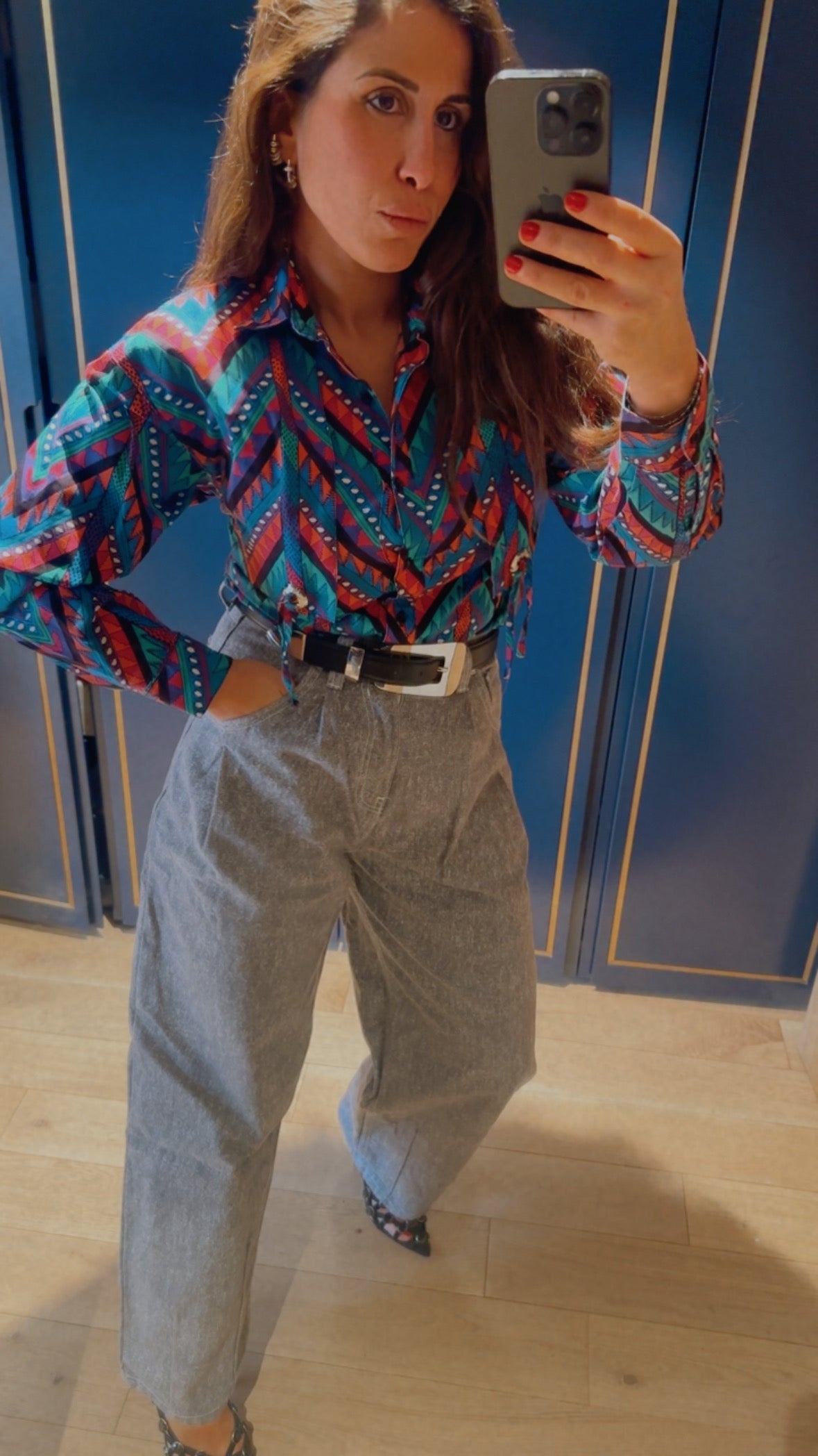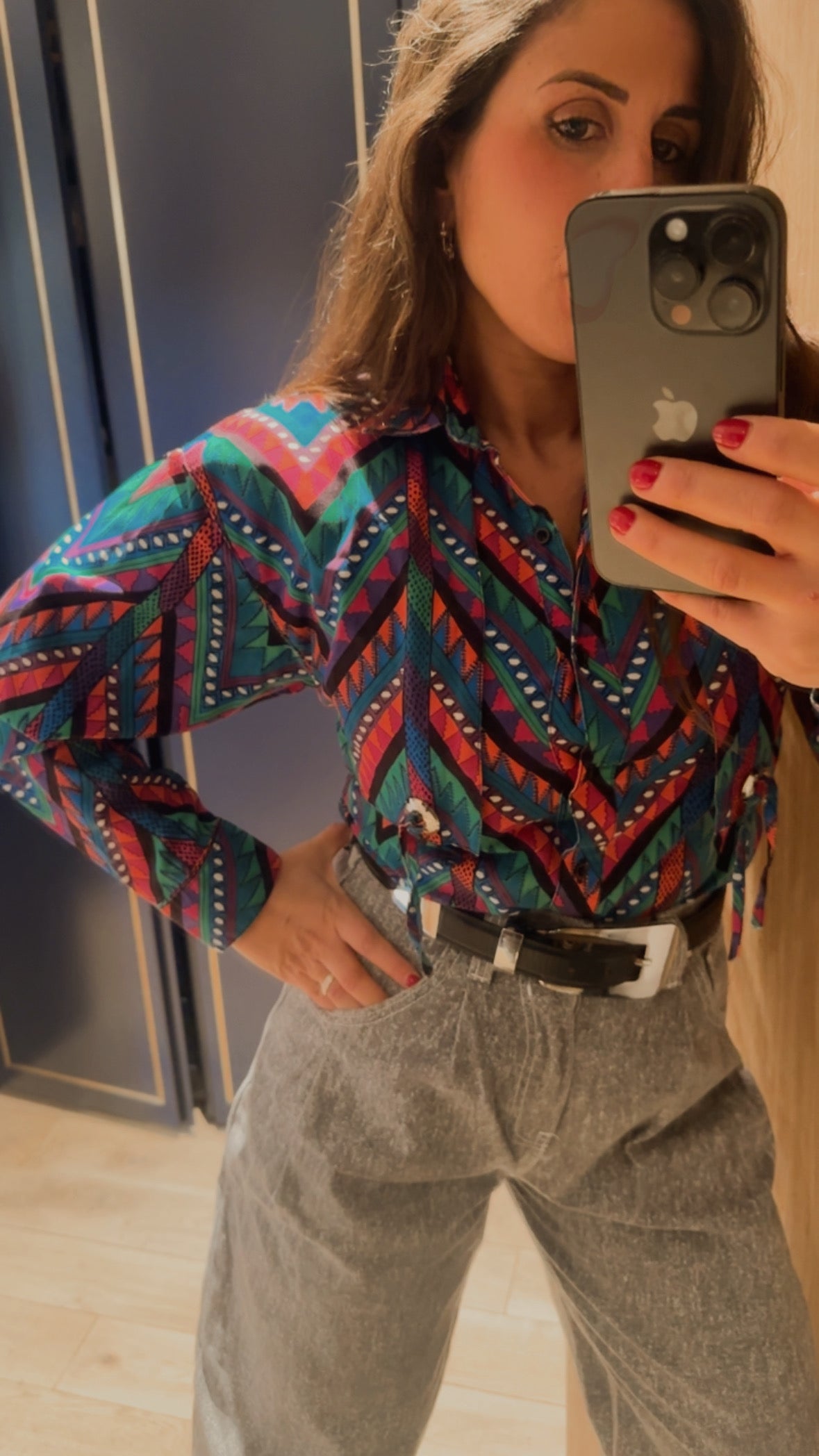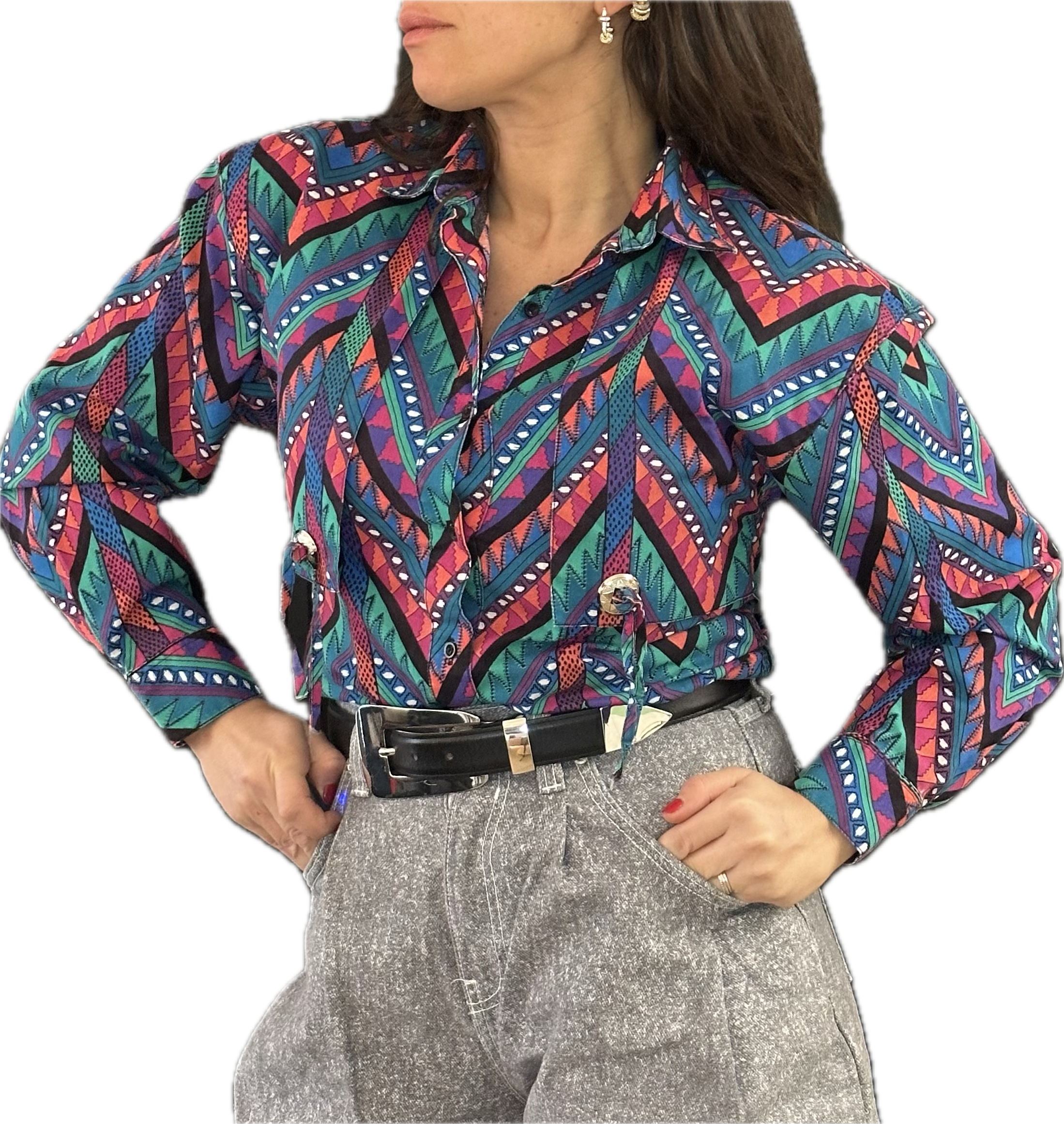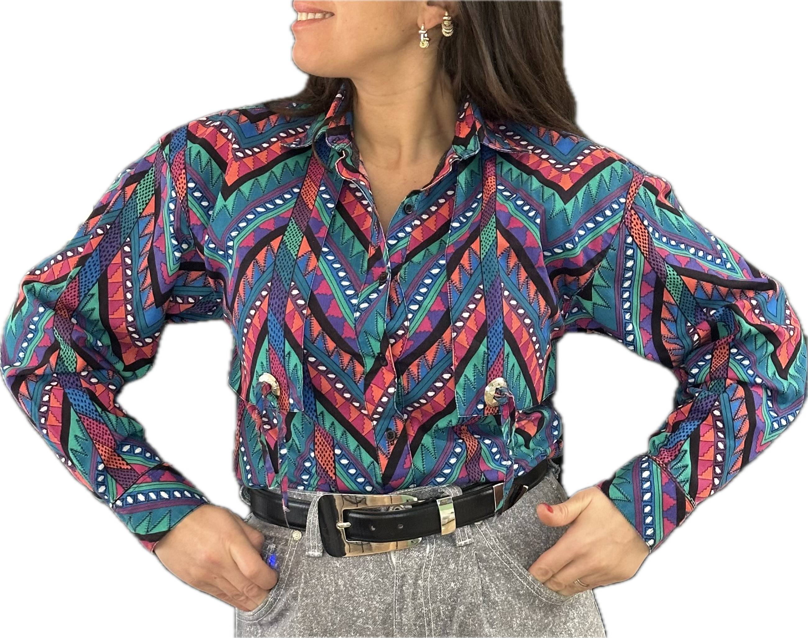 Craquez pour cette chemise vintage au motif graphique ultra coloré, entièrement customisée à la main avec des rivets argentés pour une touche rock et contemporaine. Son imprimé aux tons turquoise, violet, rose et noir apporte un style fort et affirmé, parfait pour dynamiser une tenue.