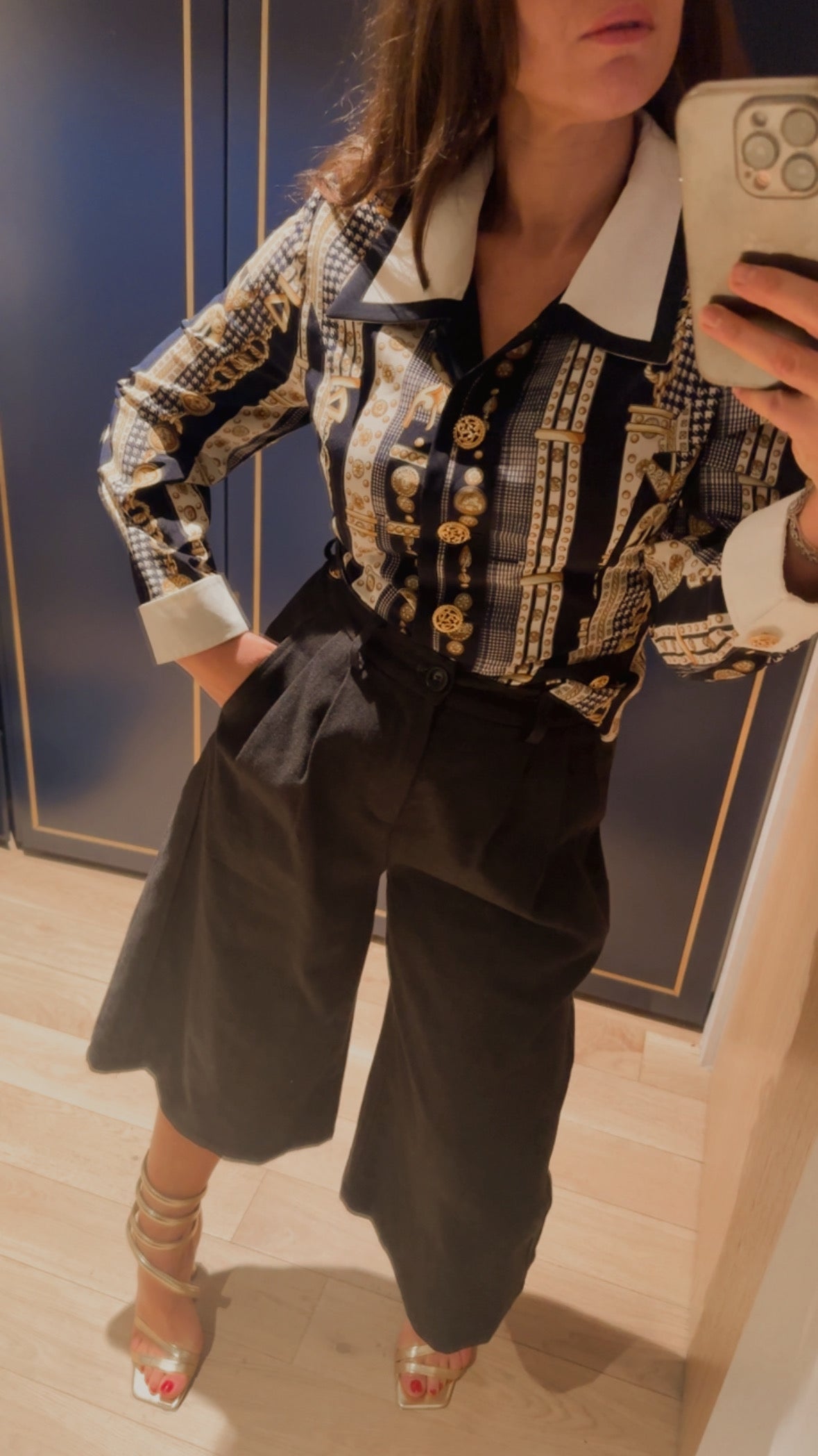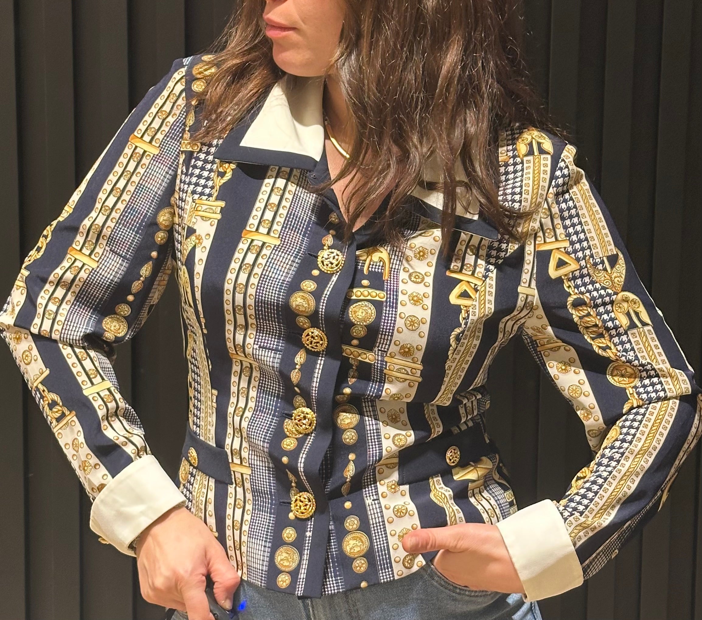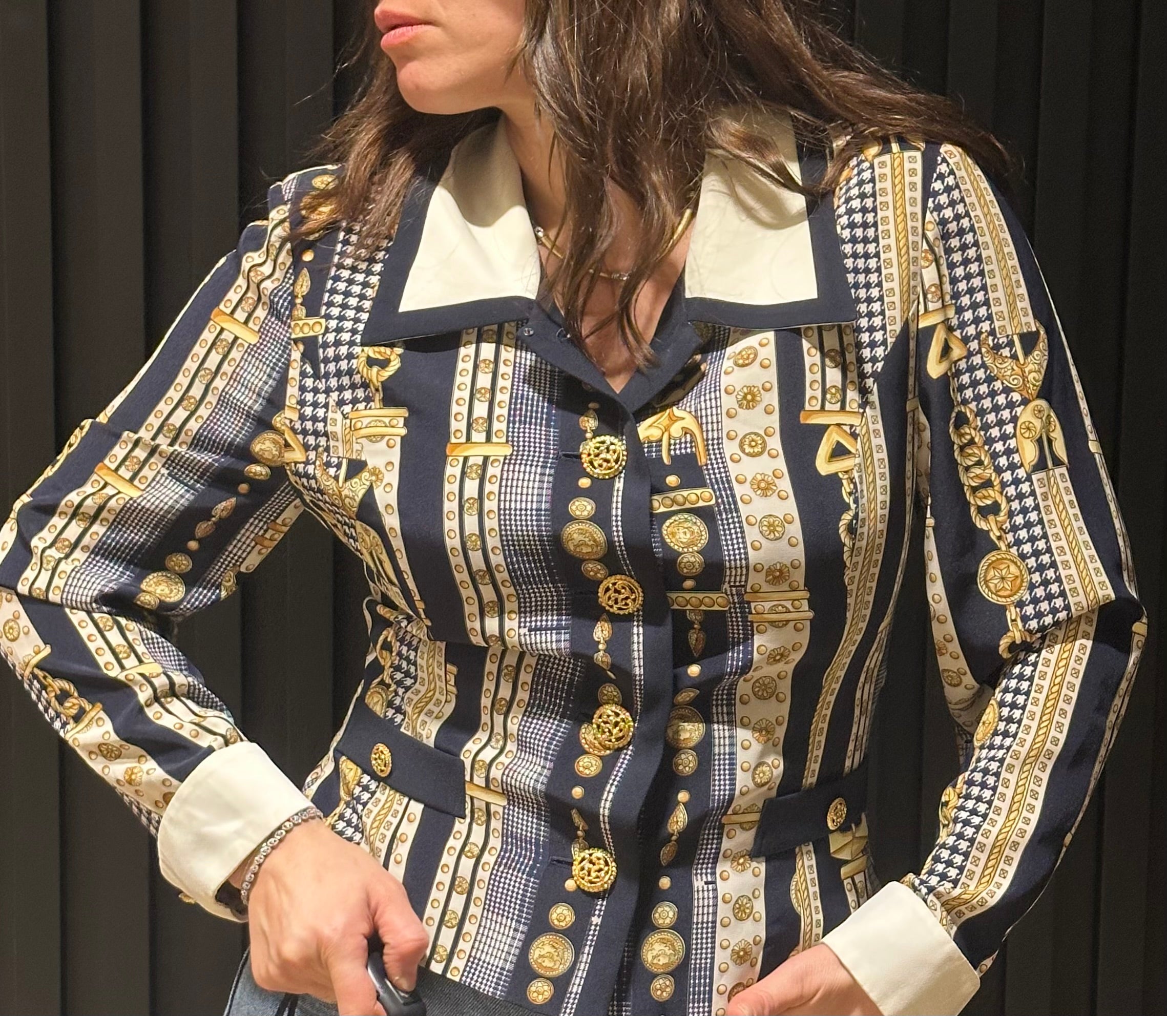 Son imprimé graphique mêle rayures structurées, détails façon chaînes et médaillons dorés sur fond marine et ivoire. Un jeu de contrastes sophistiqué qui rappelle les inspirations couture des années 80/90. Les boutons bijoux dorés viennent sublimer l’ensemble et apportent une touche précieuse supplémentaire.