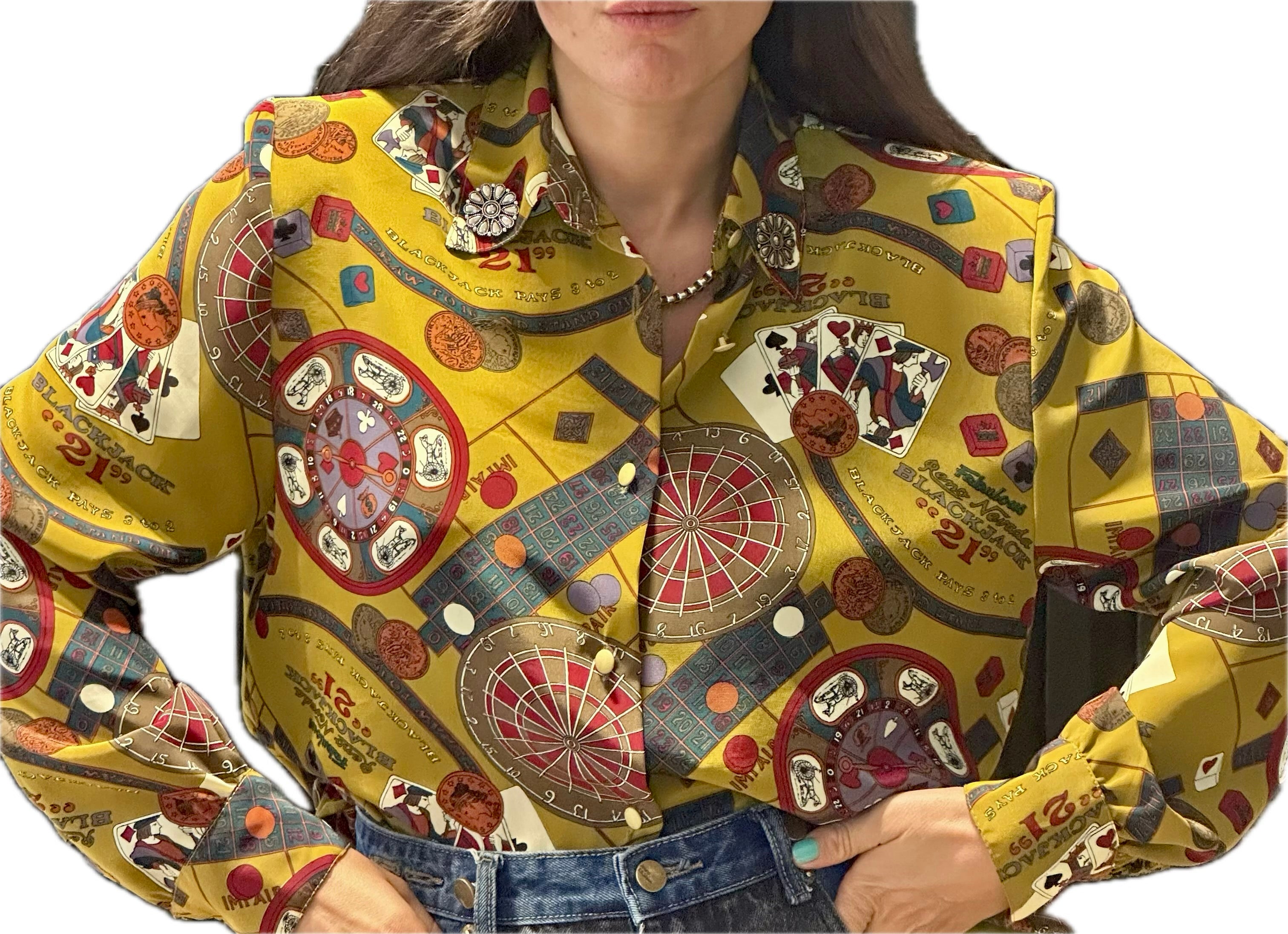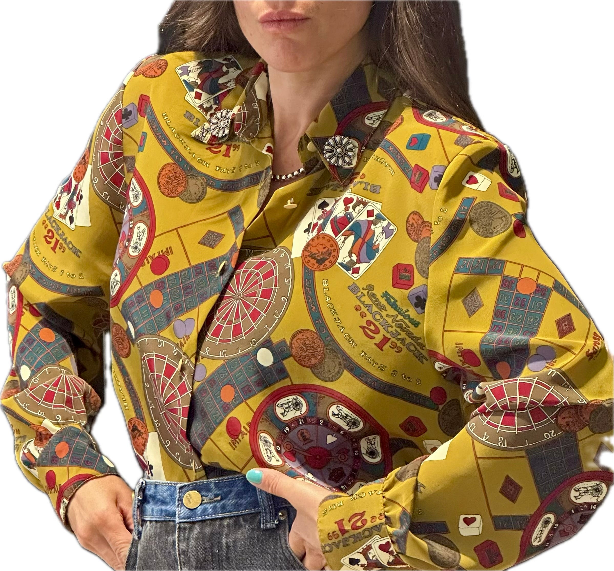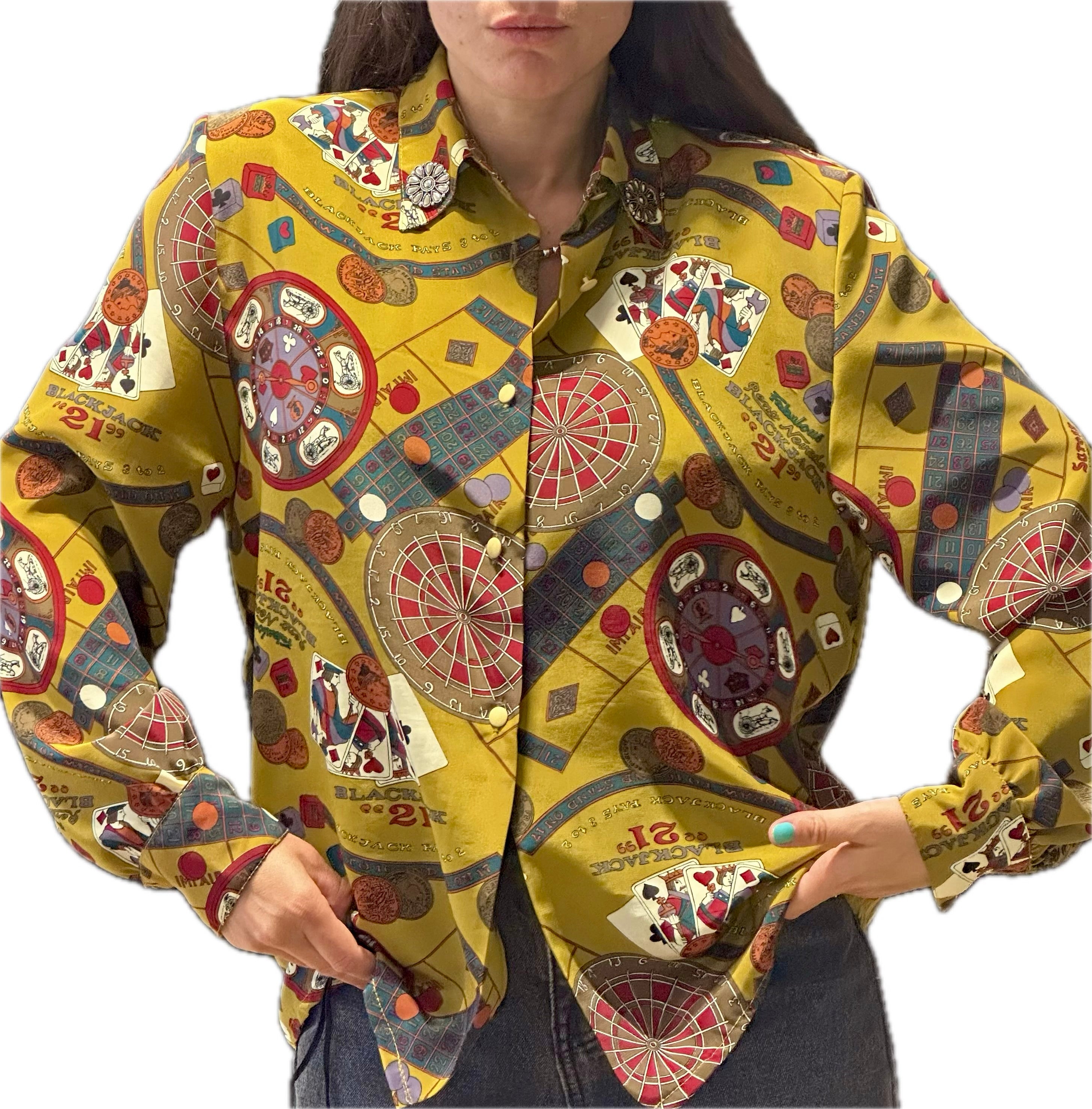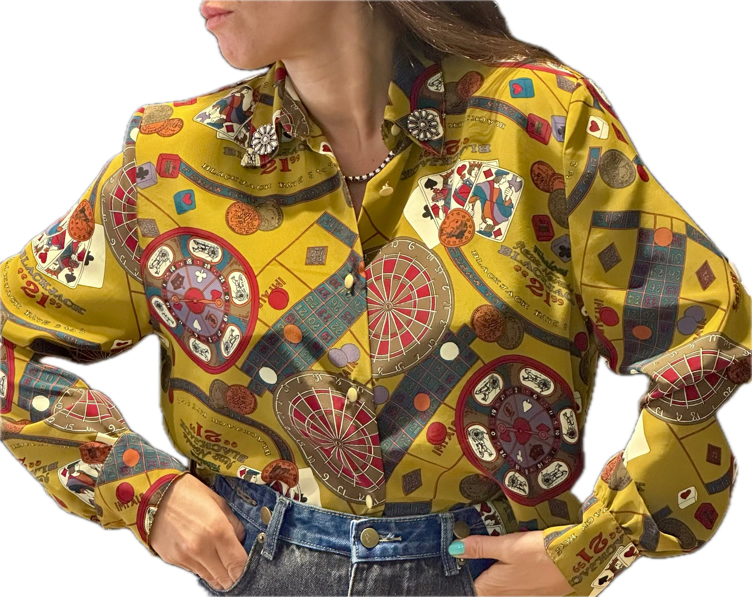Découvrez un véritable bijou de mode avec ce sublime chemisier vintage en soie, une pièce rare qui incarne l'élégance et l'originalité. Sur un fond moutarde éclatant et riche, ce chemisier déploie des motifs uniques et détaillés, créant une véritable composition artistique (précisez le thème des motifs si vous le souhaitez, par exemple : "inspirés de l'univers du jeu et du casino", "abstraits", "géométriques", etc.).