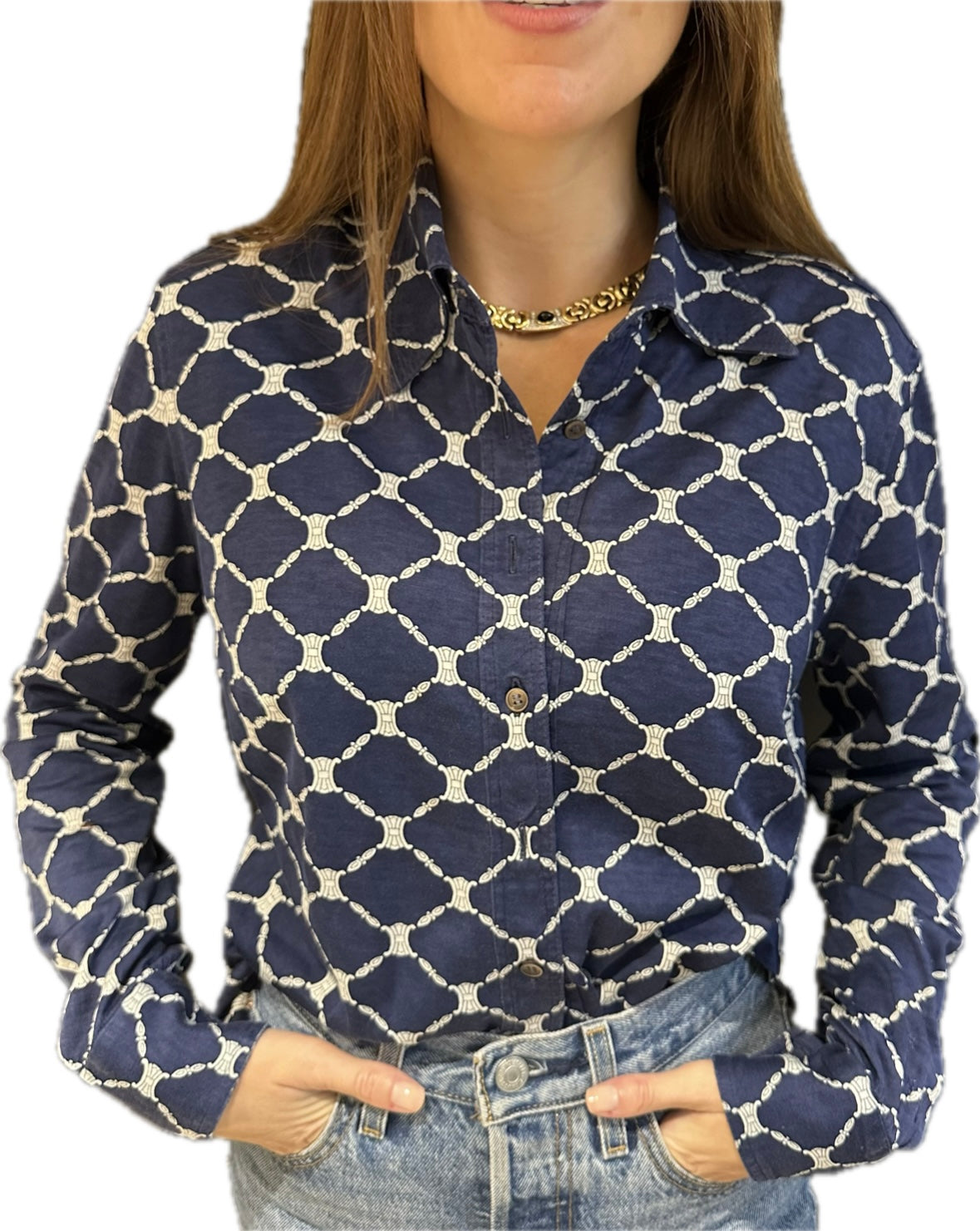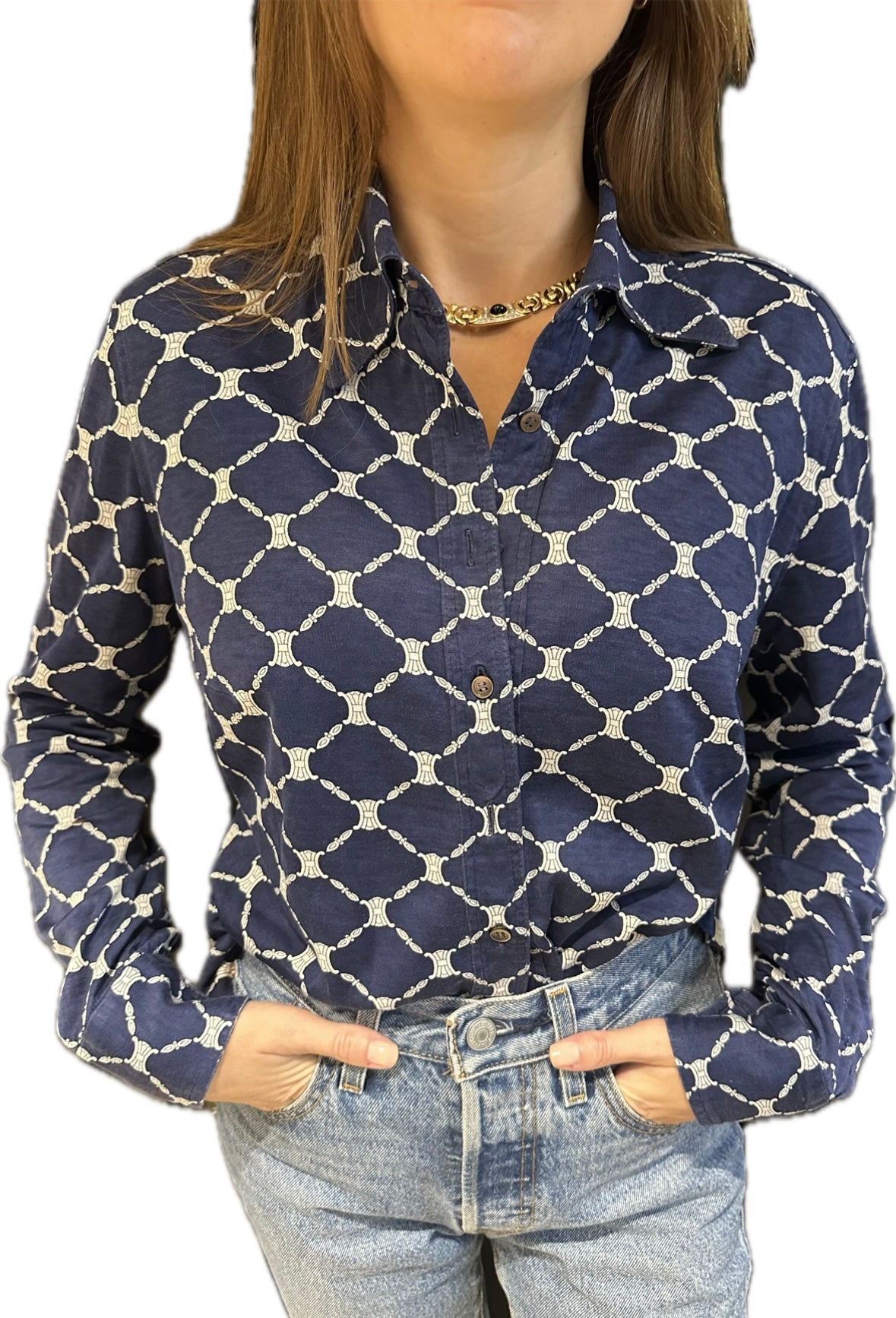 Dans un bleu marine profond, il est orné du célèbre logo Triomphe imprimé en all-over, créant un motif graphique raffiné et reconnaissable entre mille. Le col classique, la coupe légèrement ajustée et les boutons discrets renforcent son allure chic et sophistiquée.