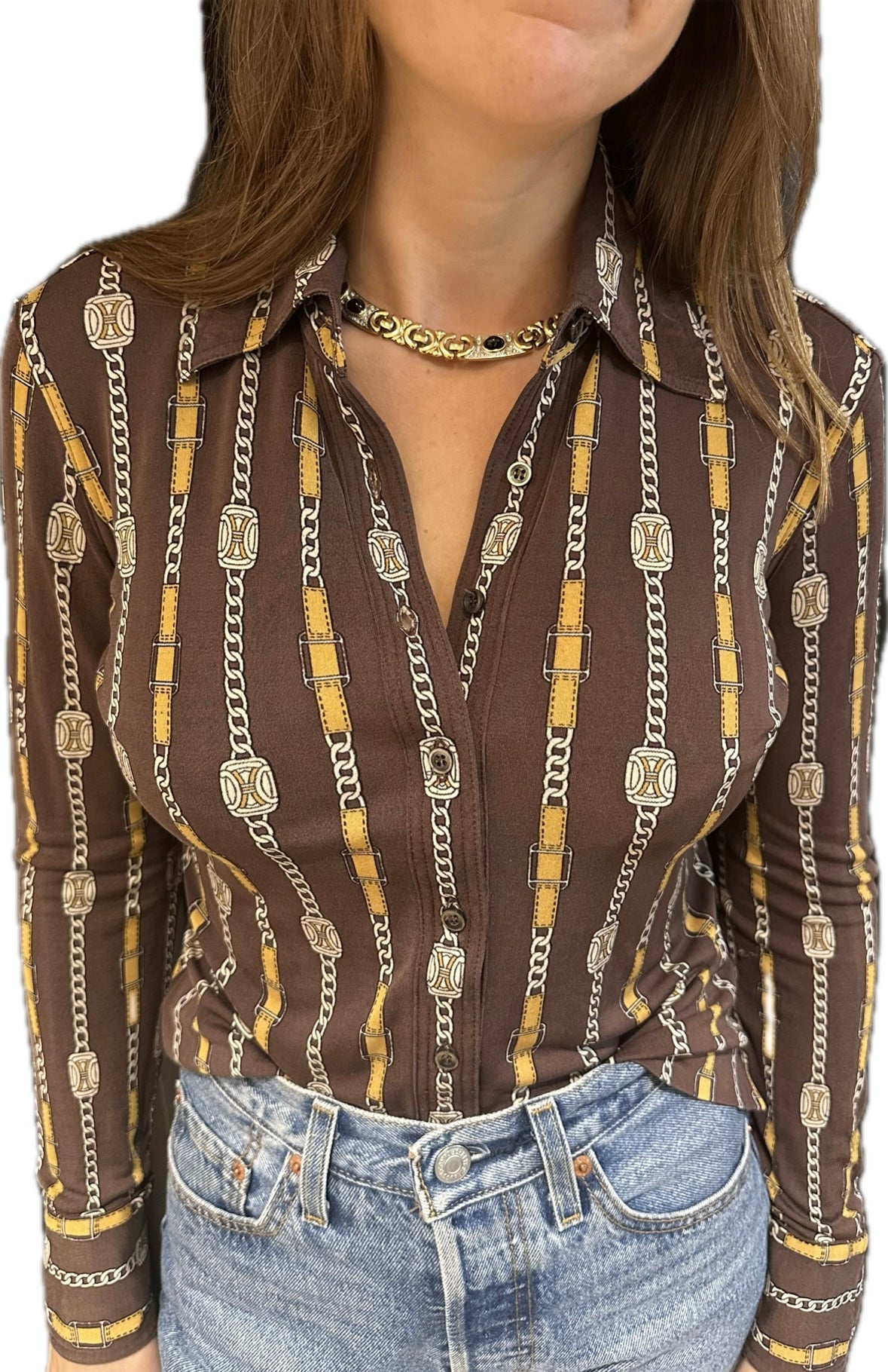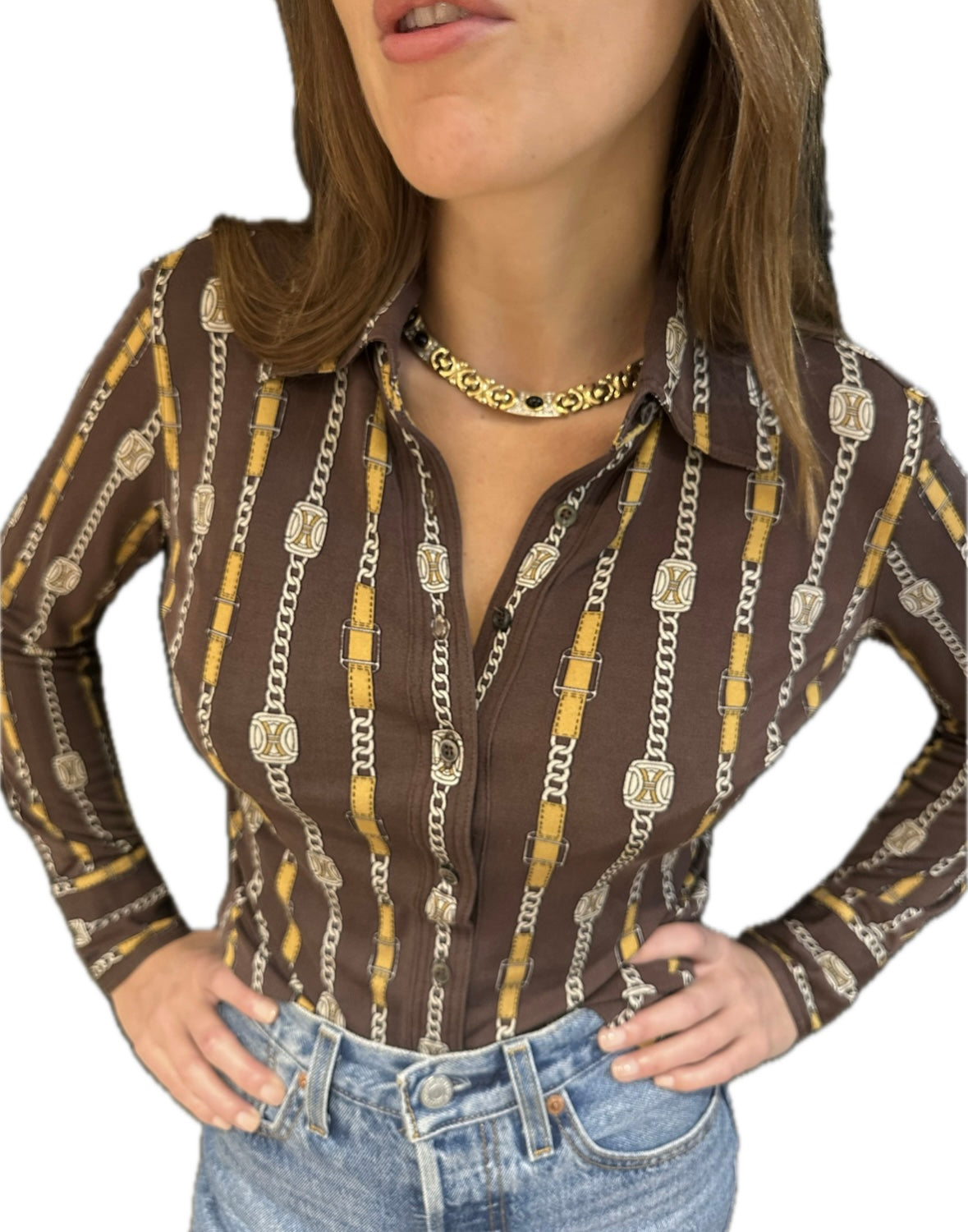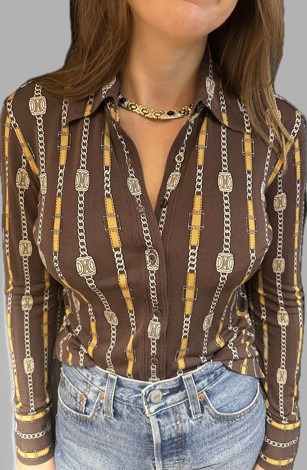 Ce chemisier vintage Céline en soie est une véritable merveille : une pièce rare, luxueuse et emblématique de l’élégance française. Dans un marron profond très chic, il est orné d’un motif de maillons, chaînes et boucles façon cuir, sublimé par le logo Triomphe, signature historique de la maison.