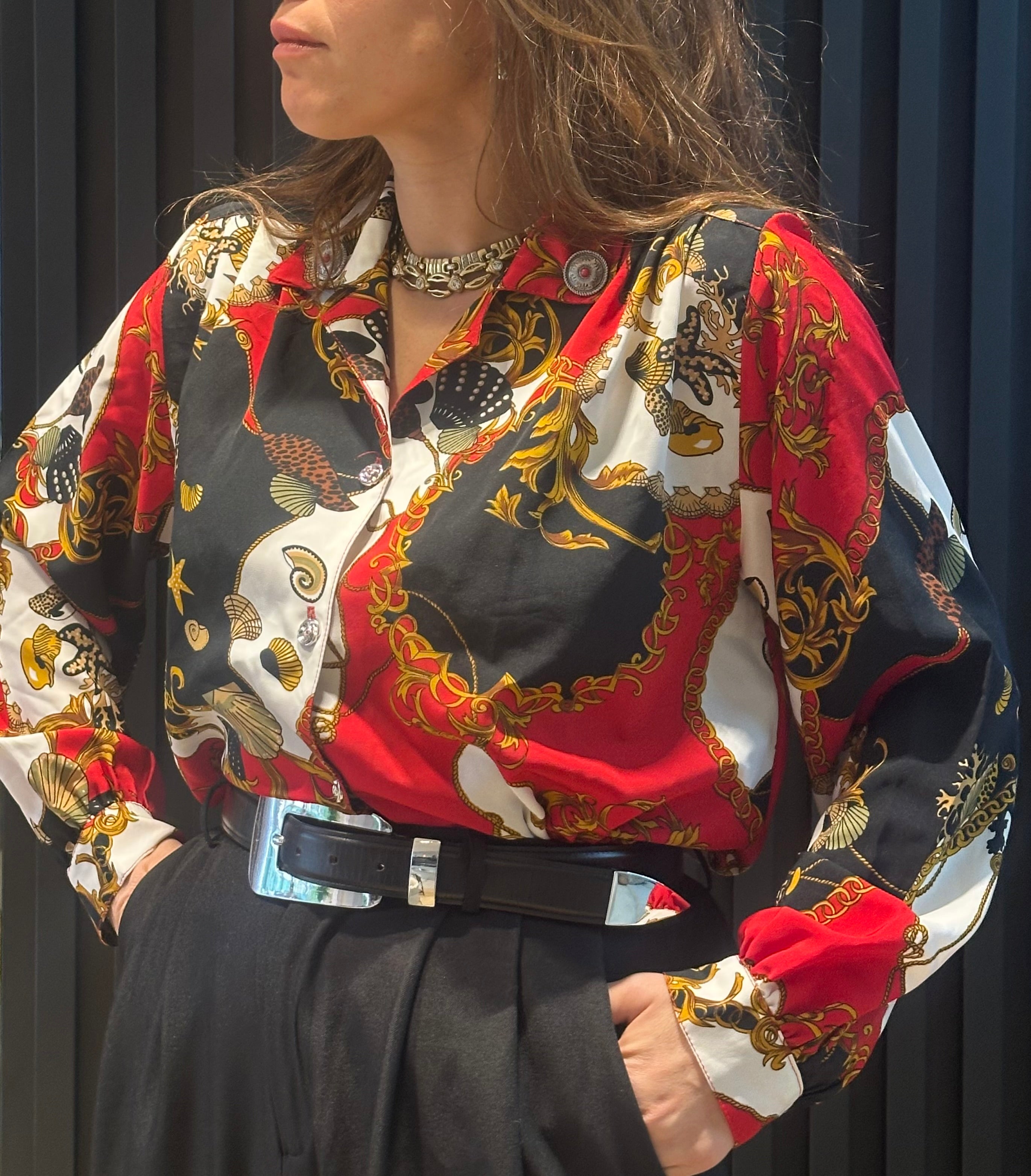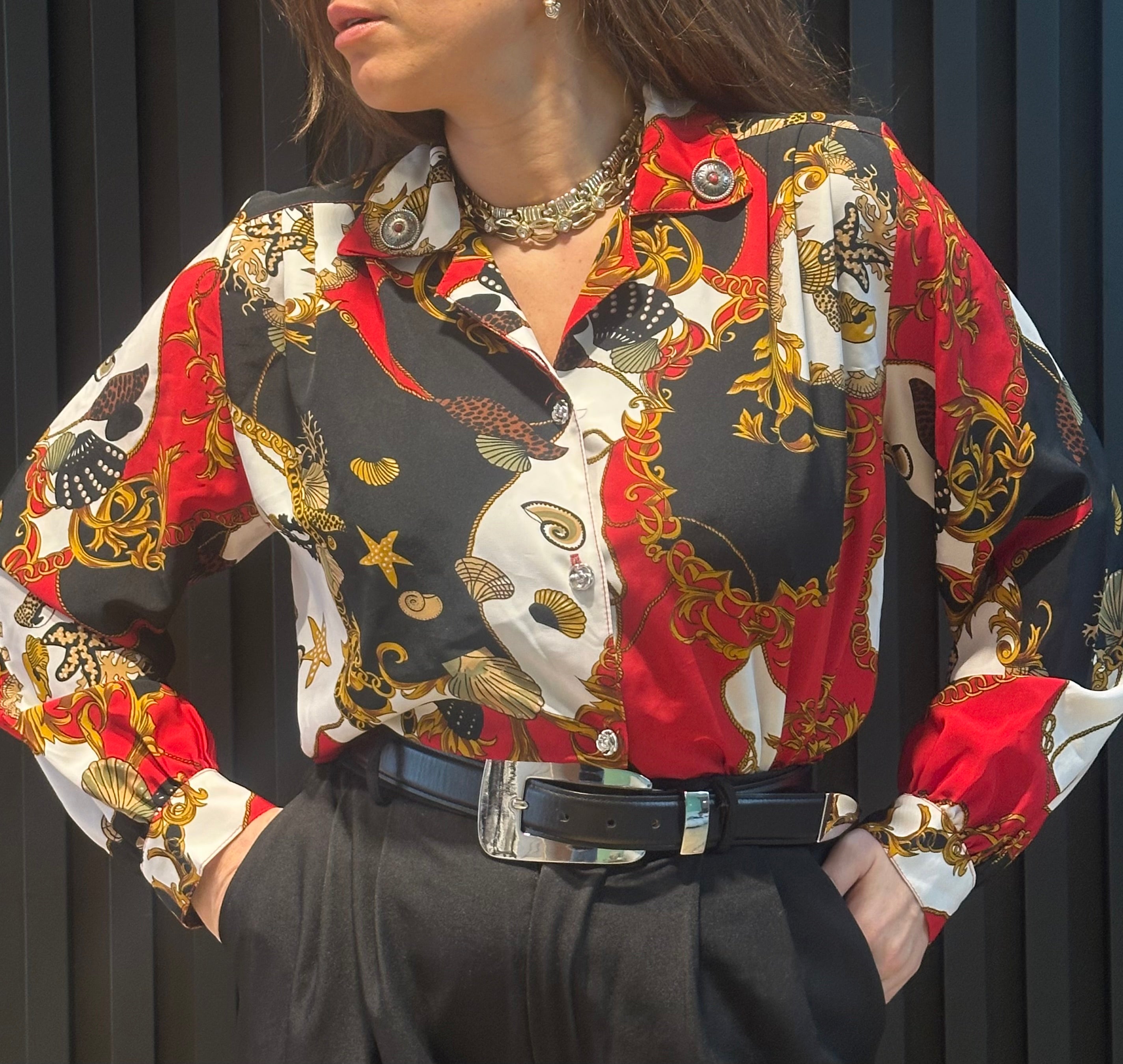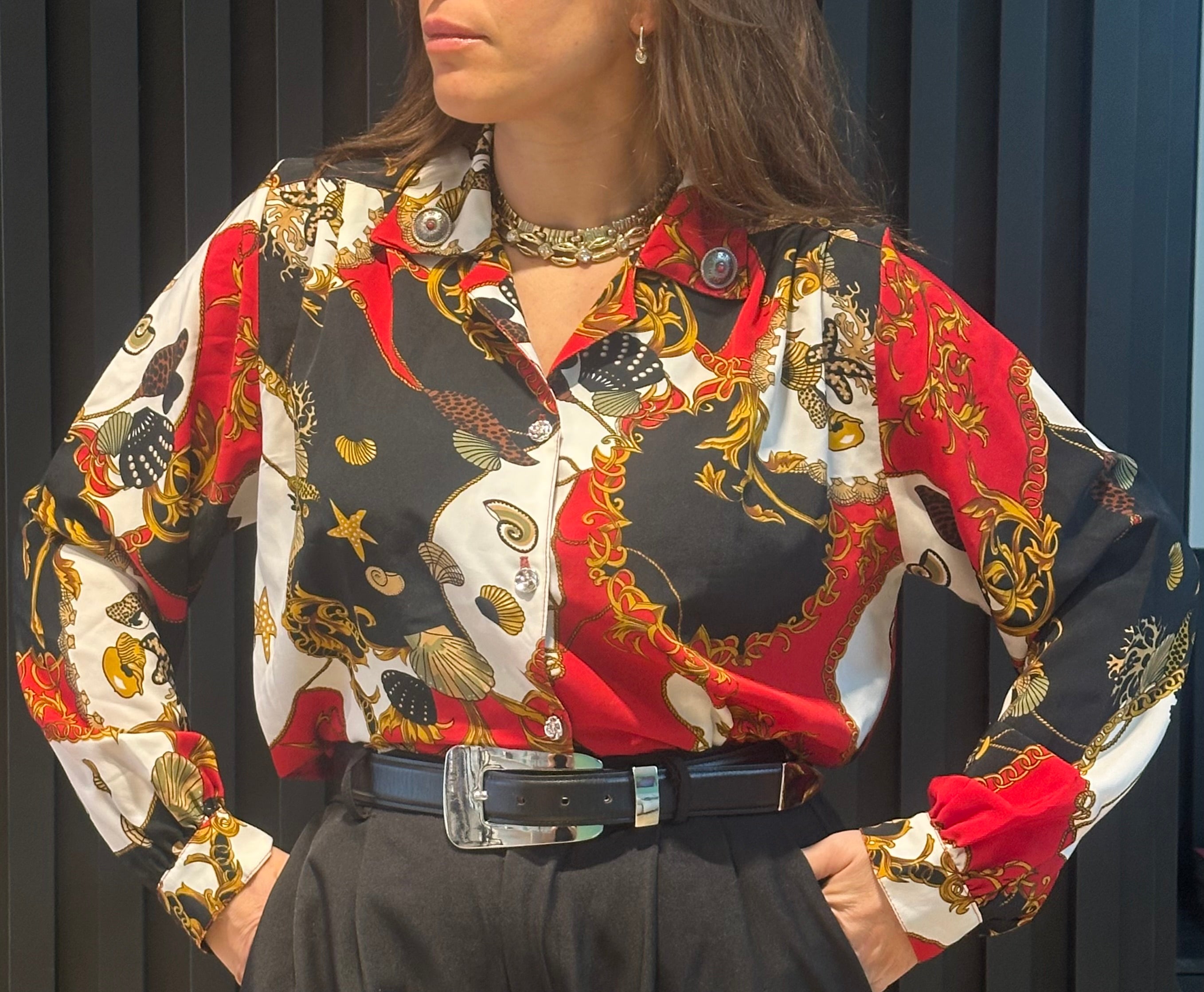 Véritable pépite rétro, ce chemisier vintage à l’imprimé emblématique des années 80–90 est une pièce au caractère affirmé. Son mélange audacieux de rouge, noir, blanc et touches dorées, inspiré des motifs baroques et chaînes iconiques de l’époque, en fait un vêtement spectaculaire et intemporel.