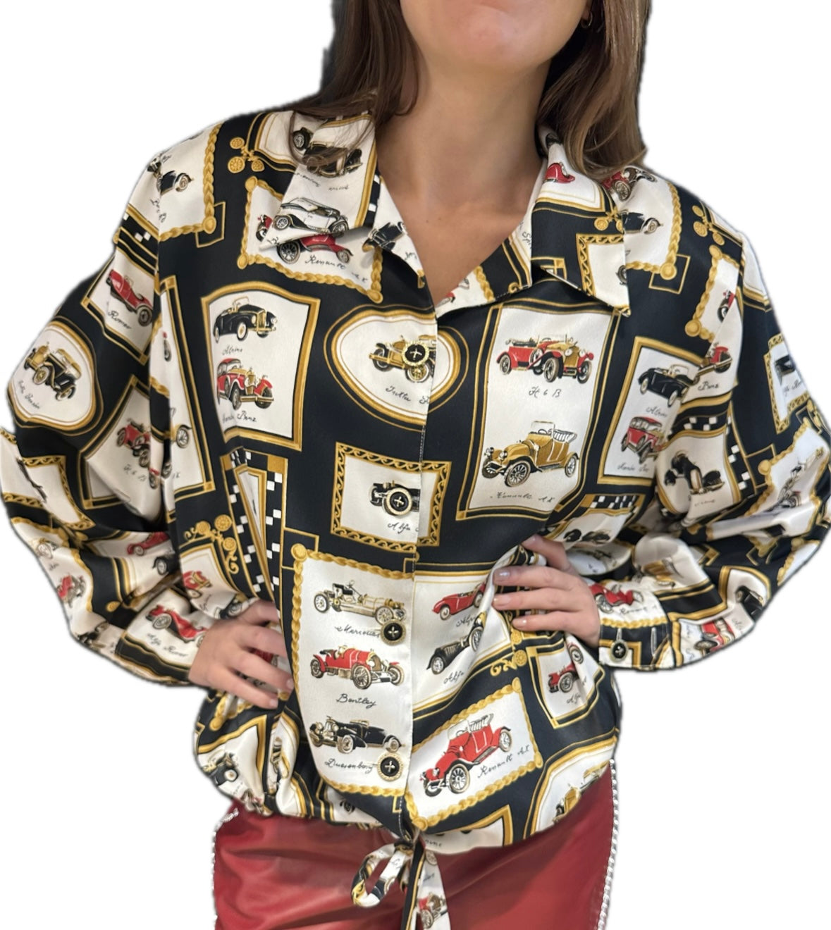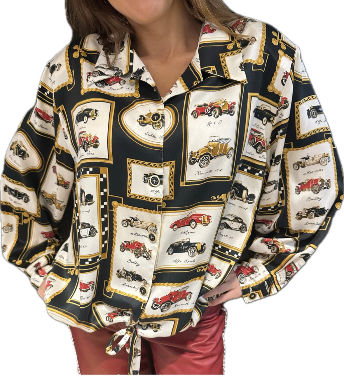 Ce chemisier vintage est une pièce forte, originale et ultra-stylée. Avec son imprimé rétro représentant de voitures anciennes encadrées de motifs dorés, il apporte instantanément du caractère à n’importe quelle tenue. Un vrai bijou pour celles qui aiment les pièces uniques qui racontent une histoire.