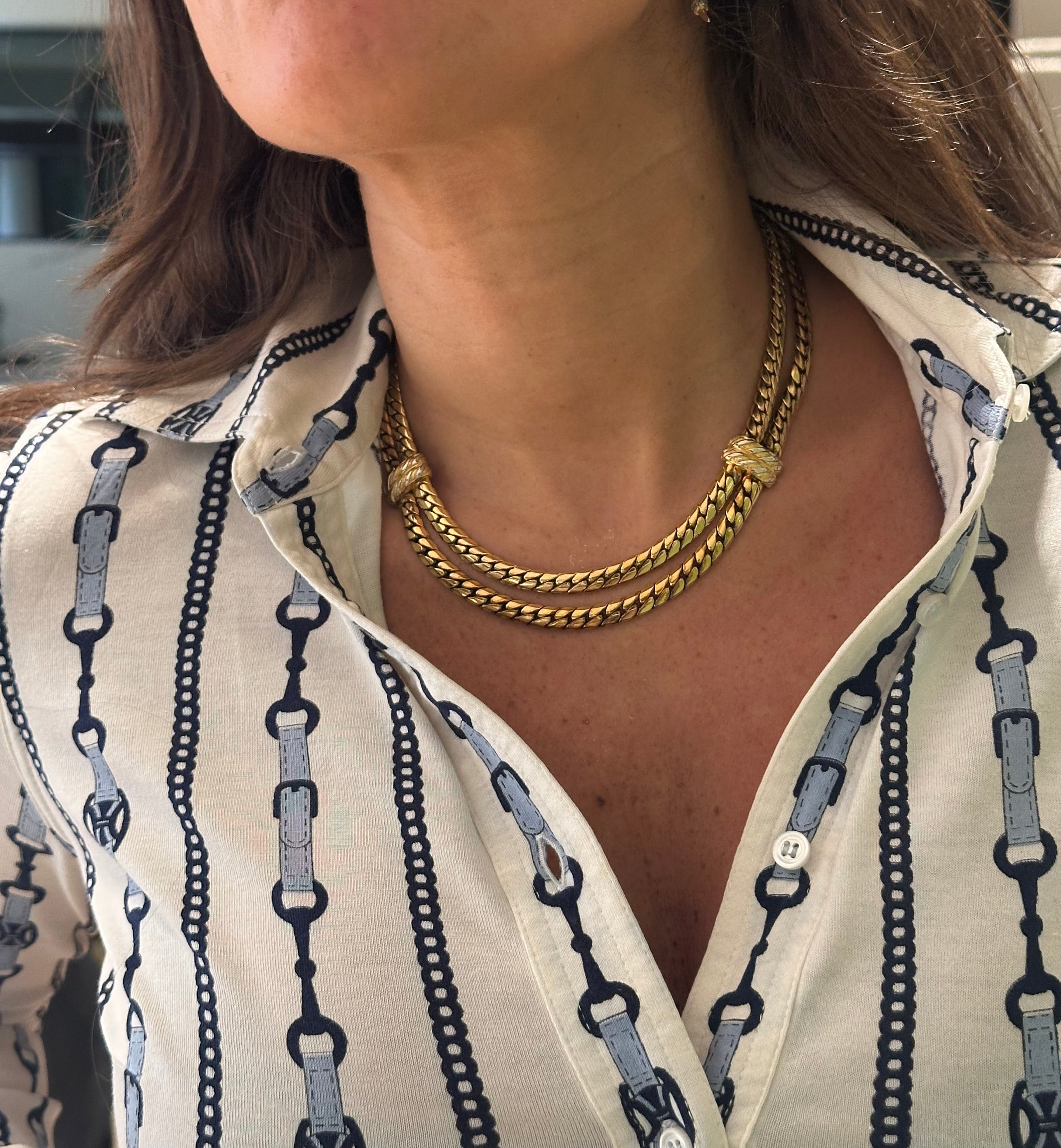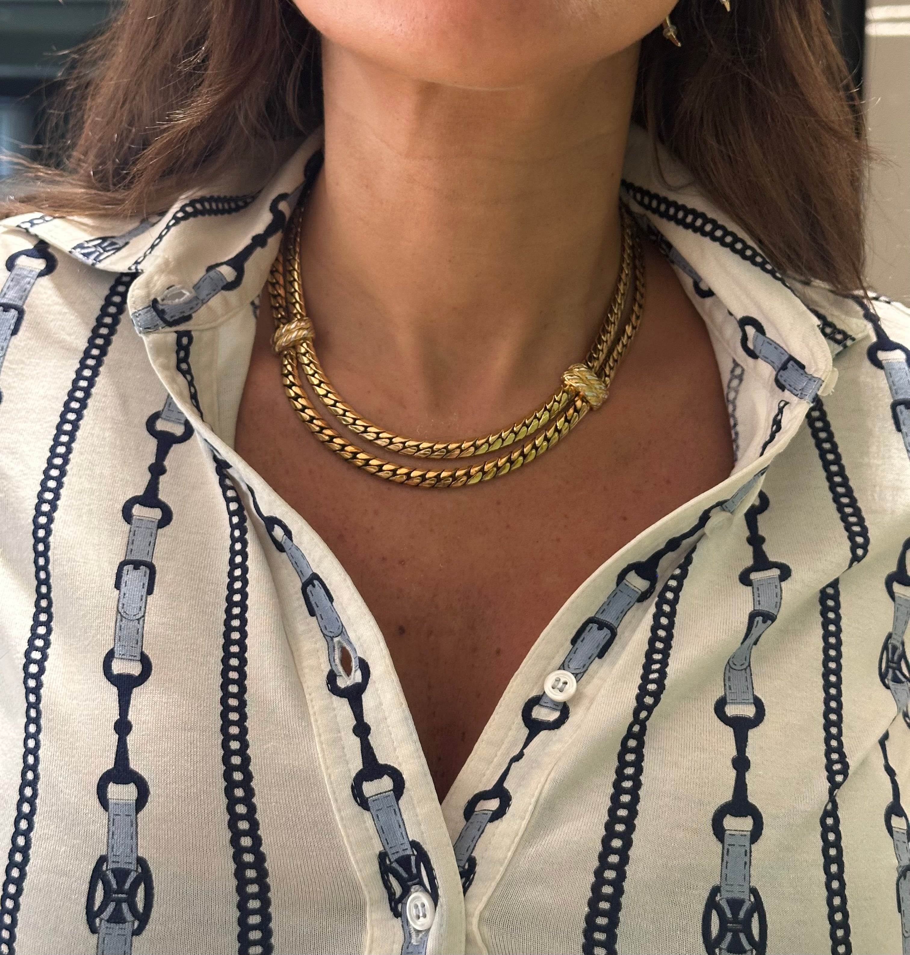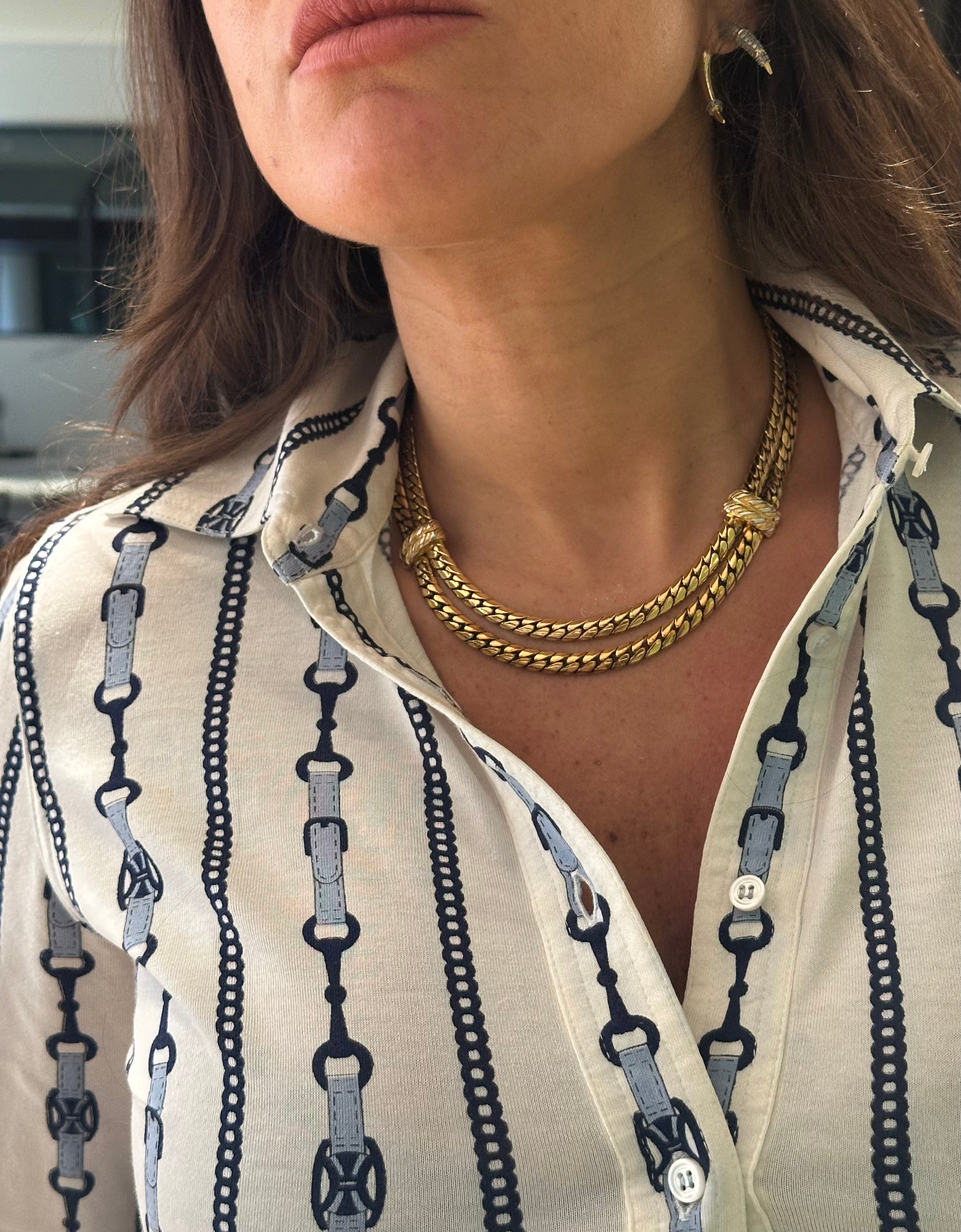 Son design en double maille tressée se distingue par une brillance délicate et un tombé parfait autour du cou. Les détails noués au centre ajoutent une touche de sophistication inspirée des bijoux haute couture des années 80.