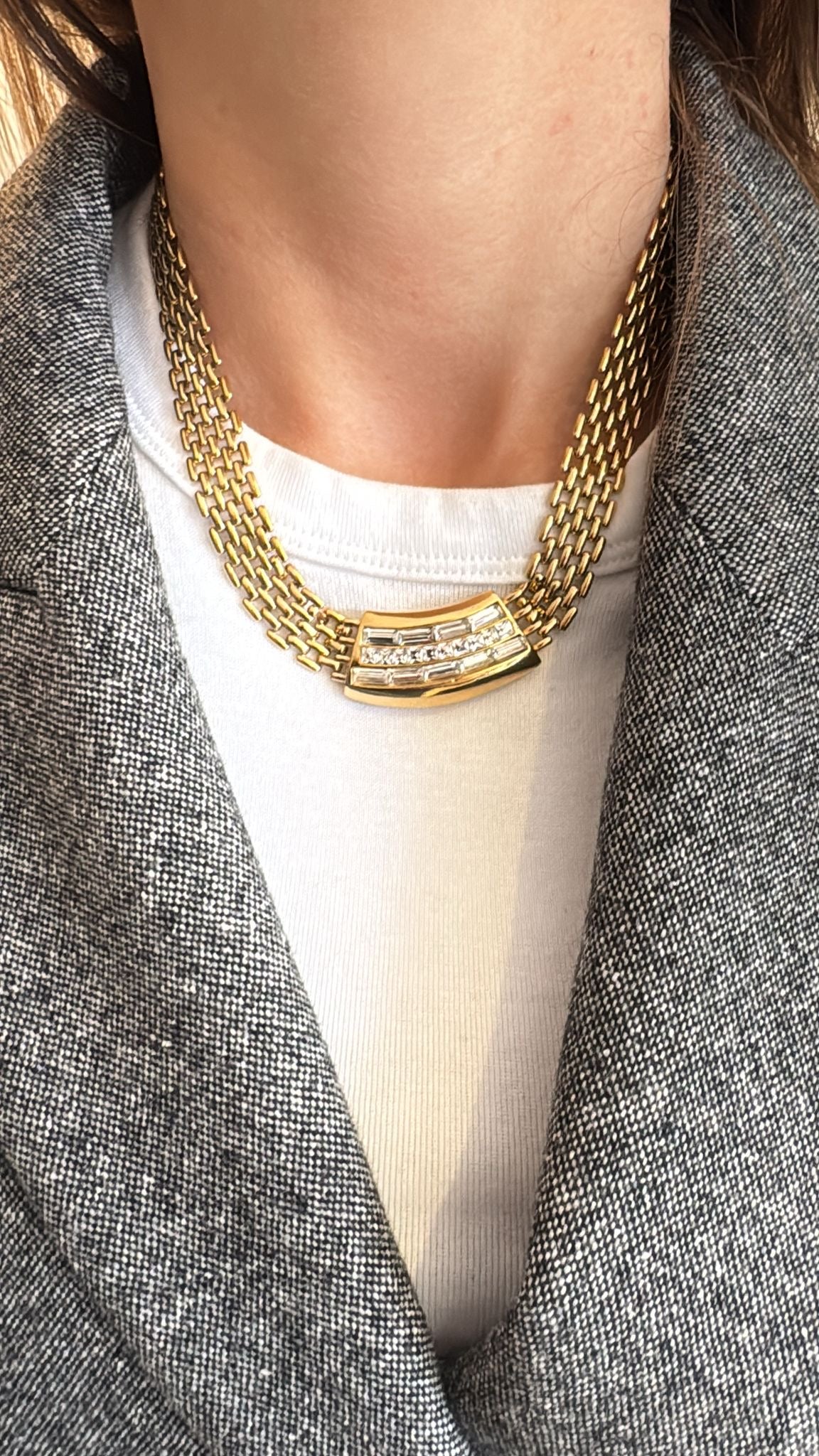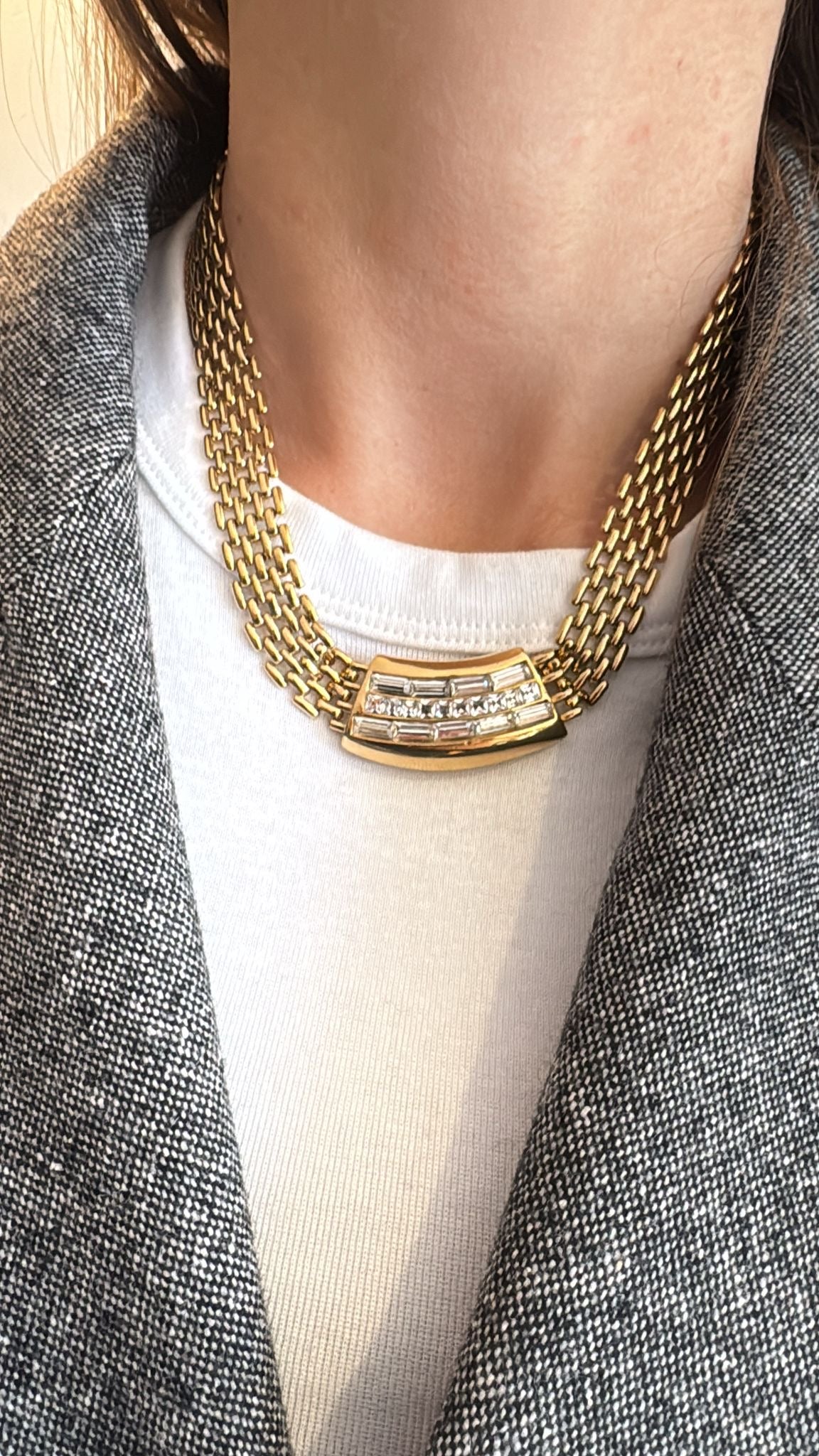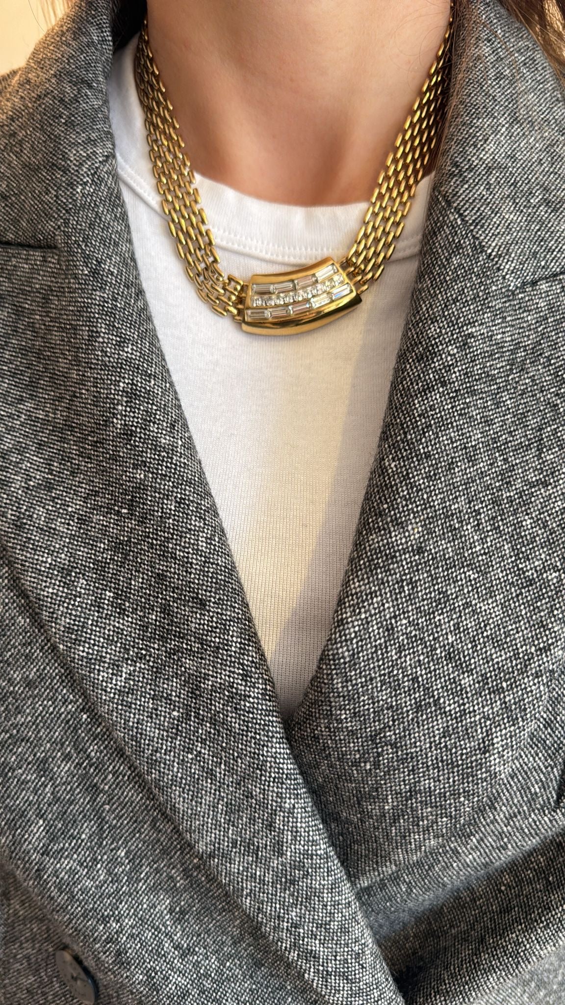 Ce collier vintage à double rang se distingue par ses mailles dorées soigneusement assemblées, offrant un volume affirmé et un tombé élégant sur le décolleté. Sa structure en chaînes multiples crée un effet relief raffiné, caractéristique des bijoux vintage couture, à la fois lumineux et intemporel.