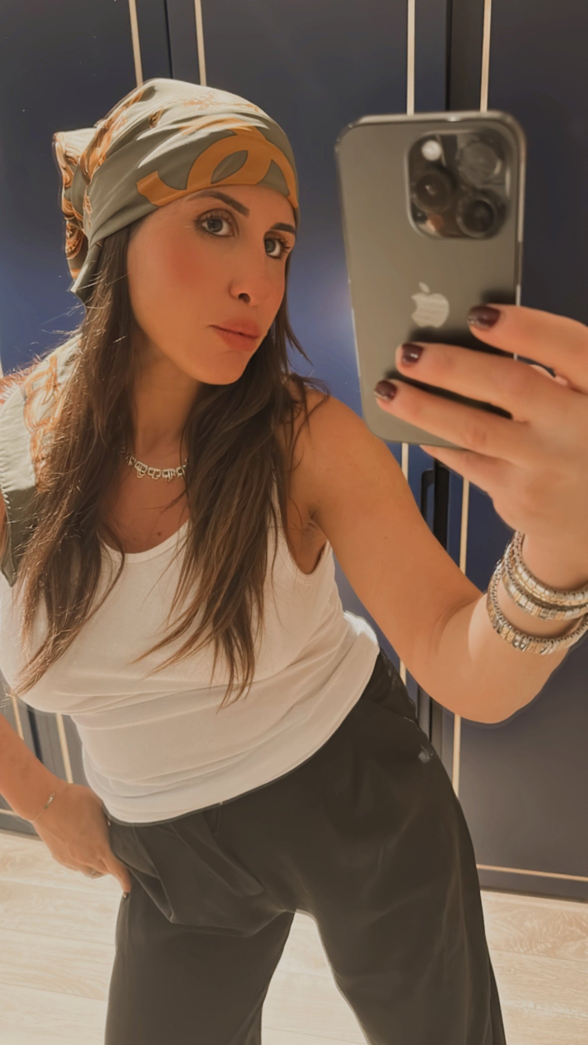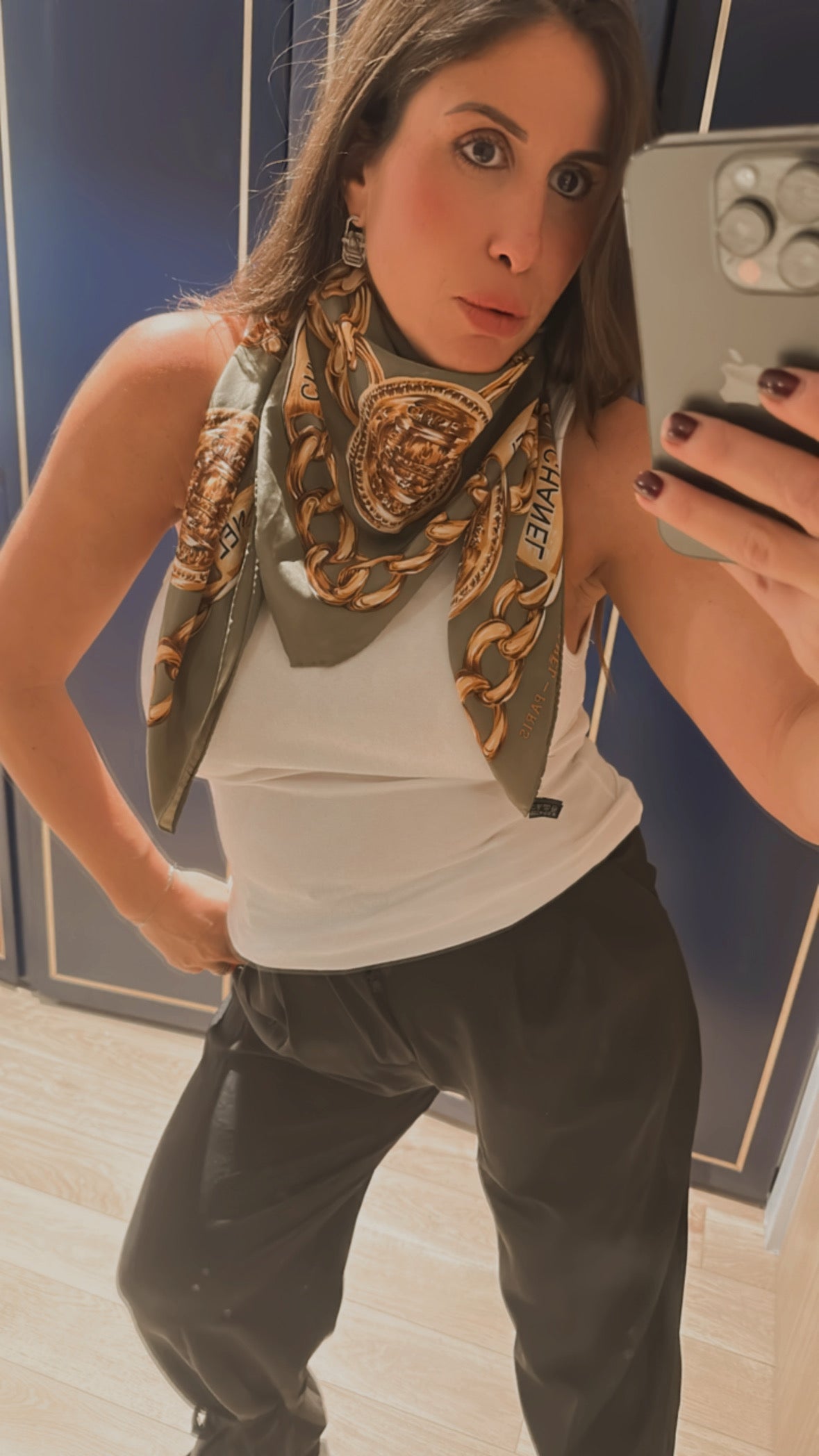 Pièce d’exception signée Chanel, ce foulard vintage en soie allie élégance intemporelle et allure couture. Son fond kaki sophistiqué est sublimé par un motif emblématique de chaînes dorées et du double C iconique, pour un style à la fois raffiné et audacieux.