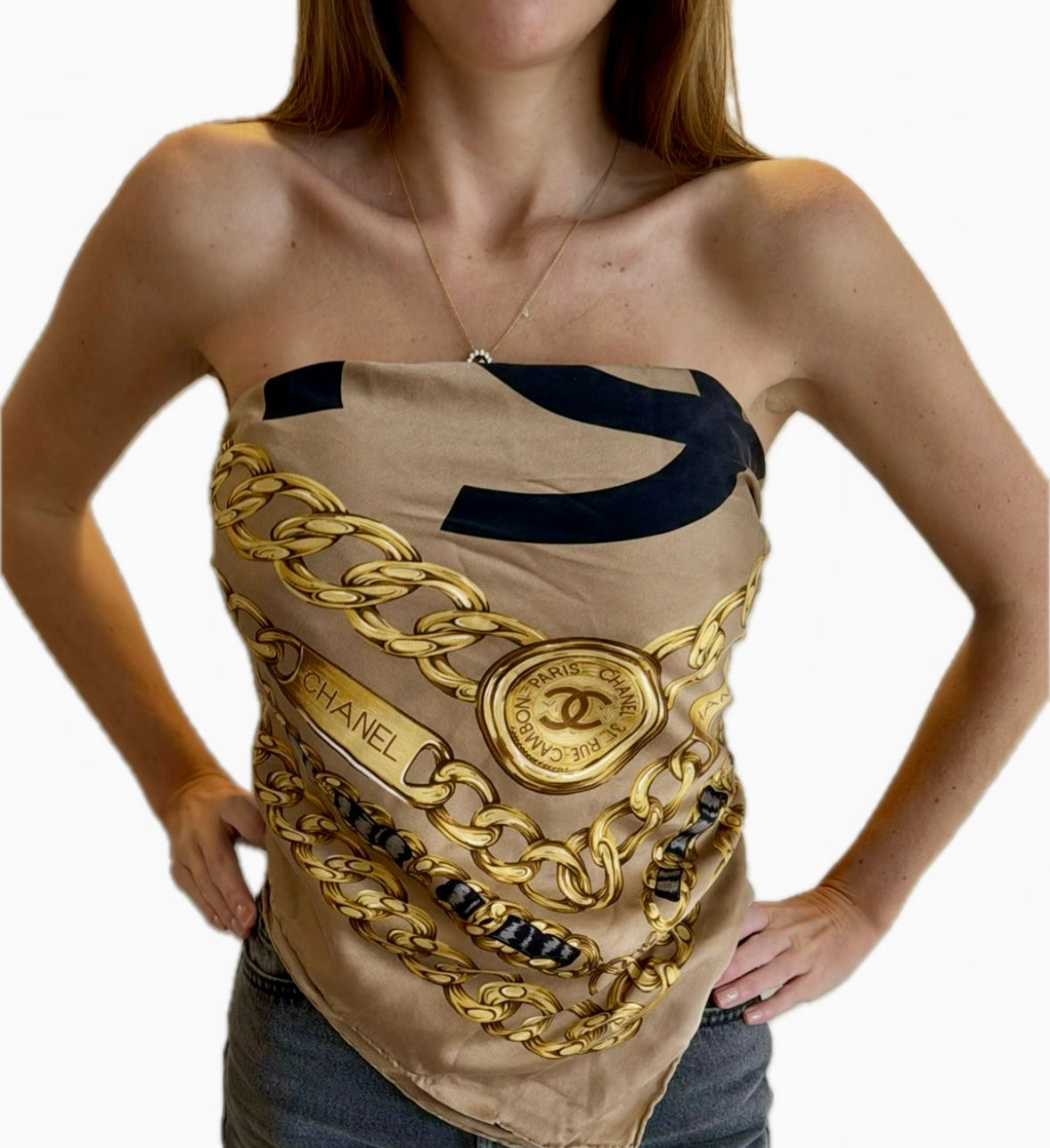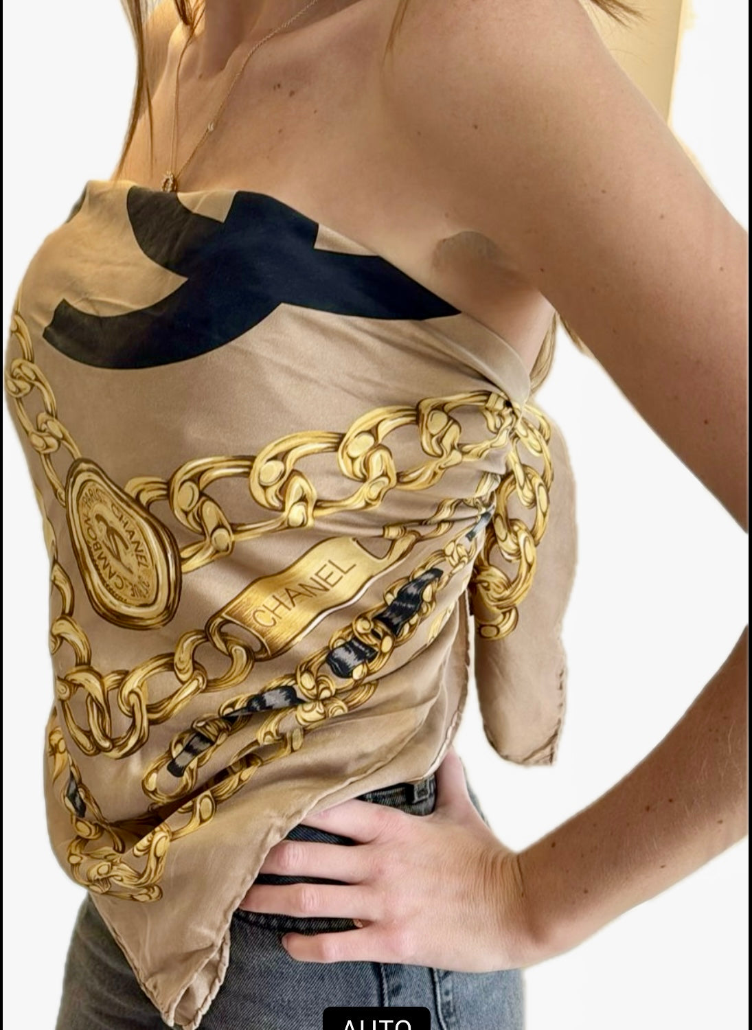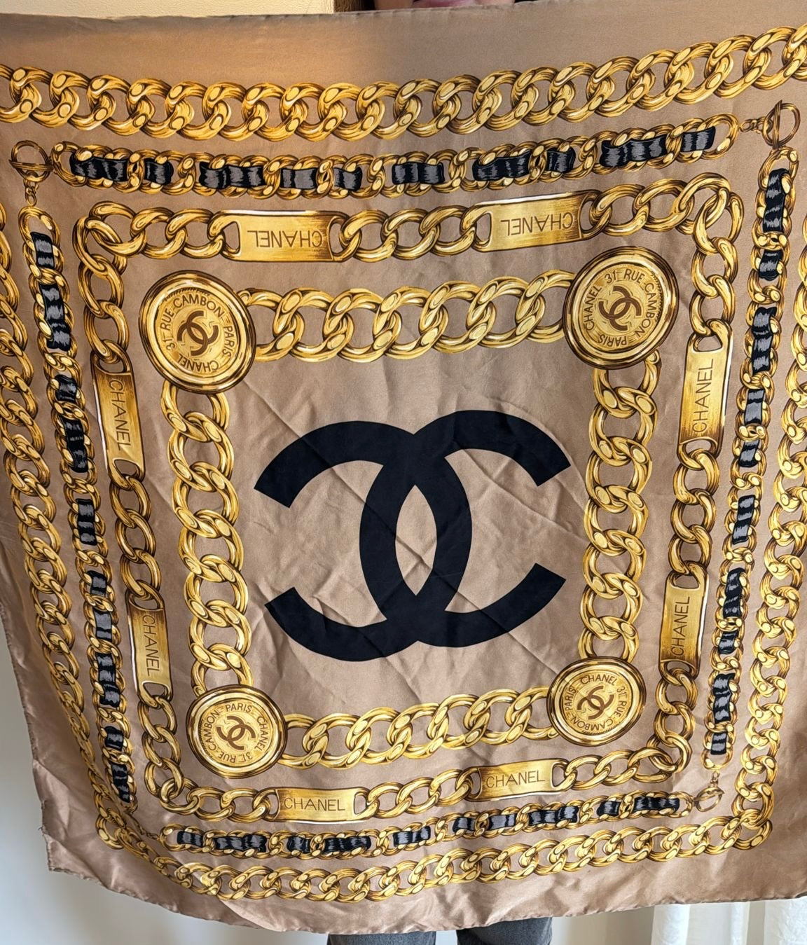 Ce foulard Chanel Vintage est une pièce authentique en soie naturelle, dénichée avec amour et entièrement ancrée dans l’héritage iconique du vintage de luxe.