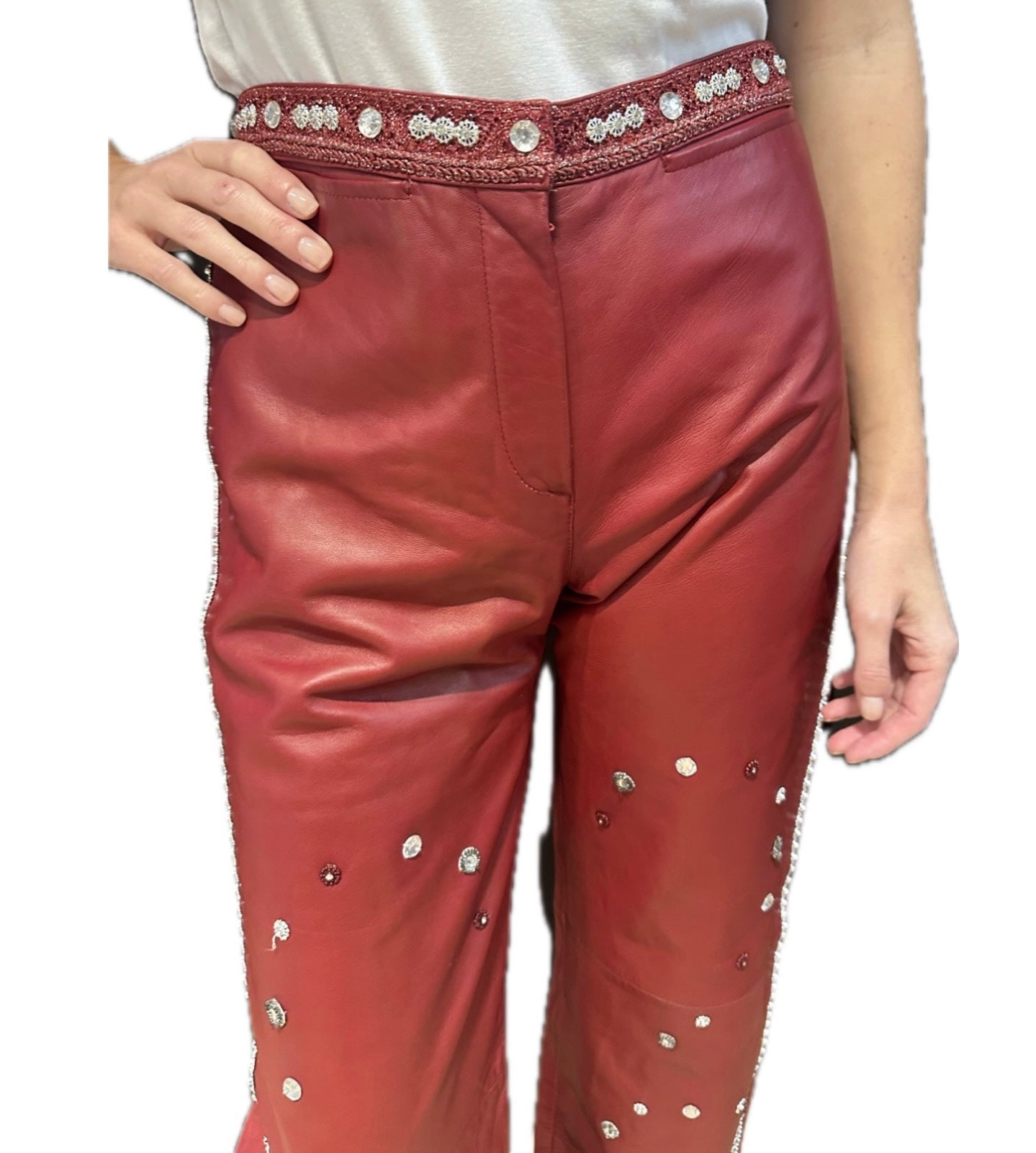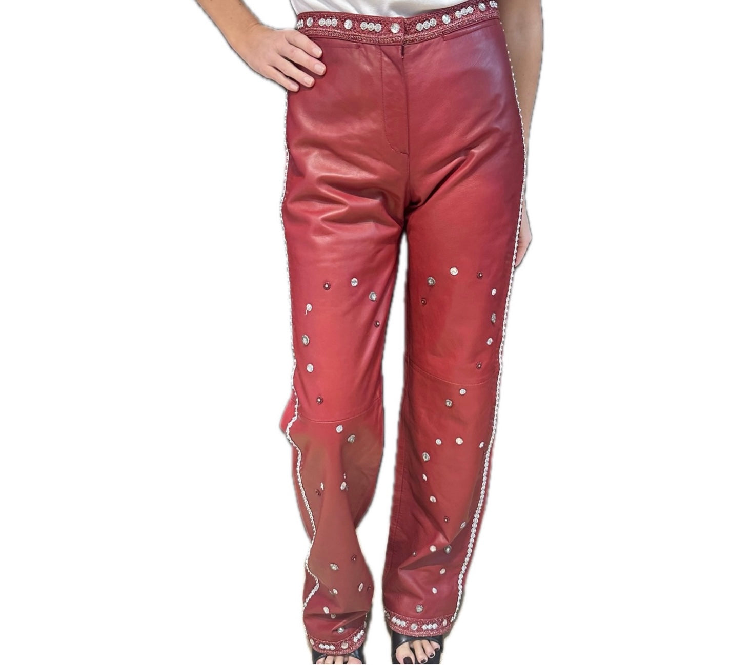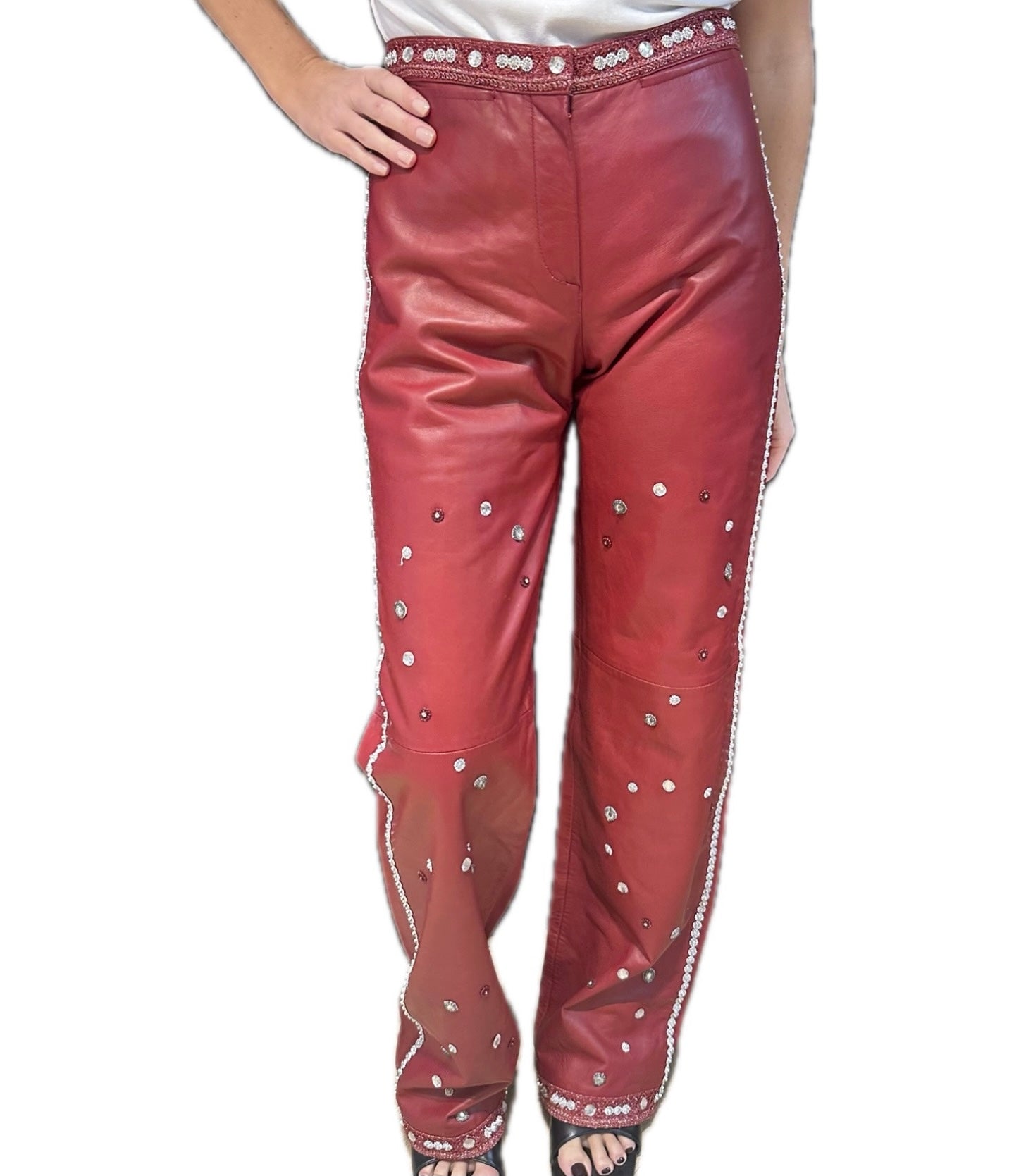 Pièce unique réalisée à la main, ce pantalon en cuir véritable rouge bordeaux est une pépite vintage entièrement customisée. Sa coupe taille haute met en valeur la silhouette, tandis que le cuir souple offre un tombé flatteur et confortable.