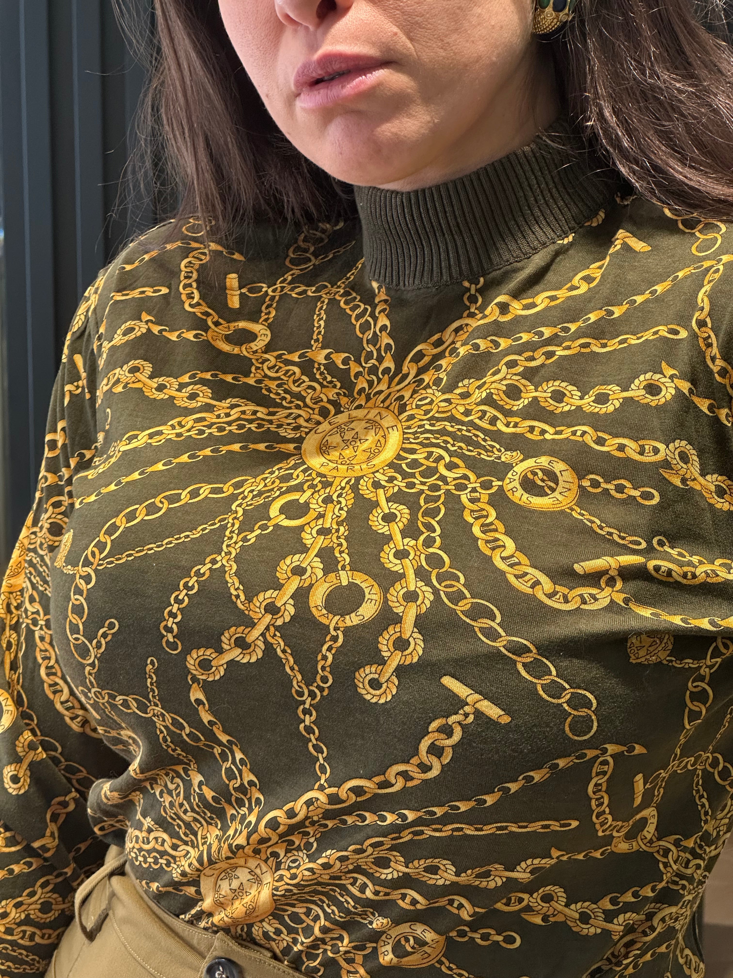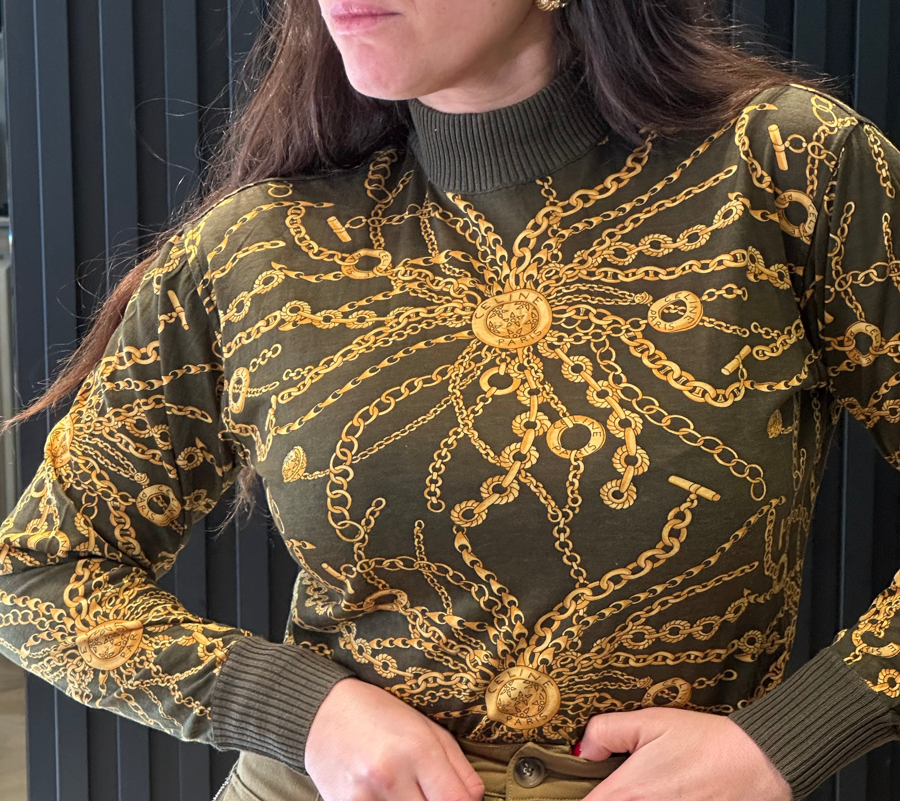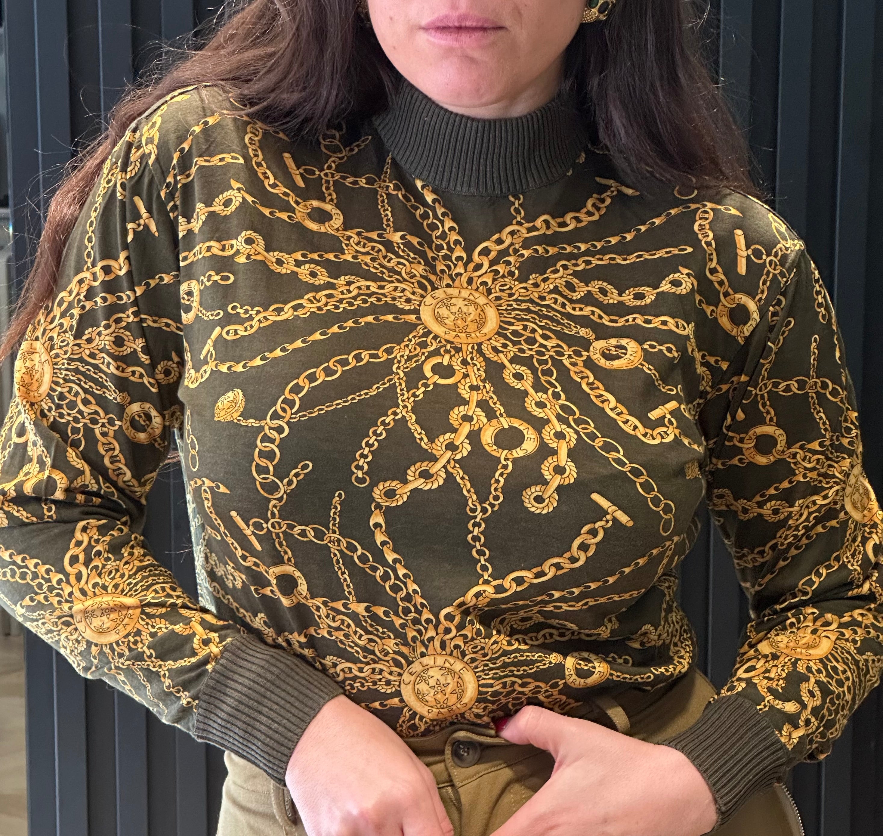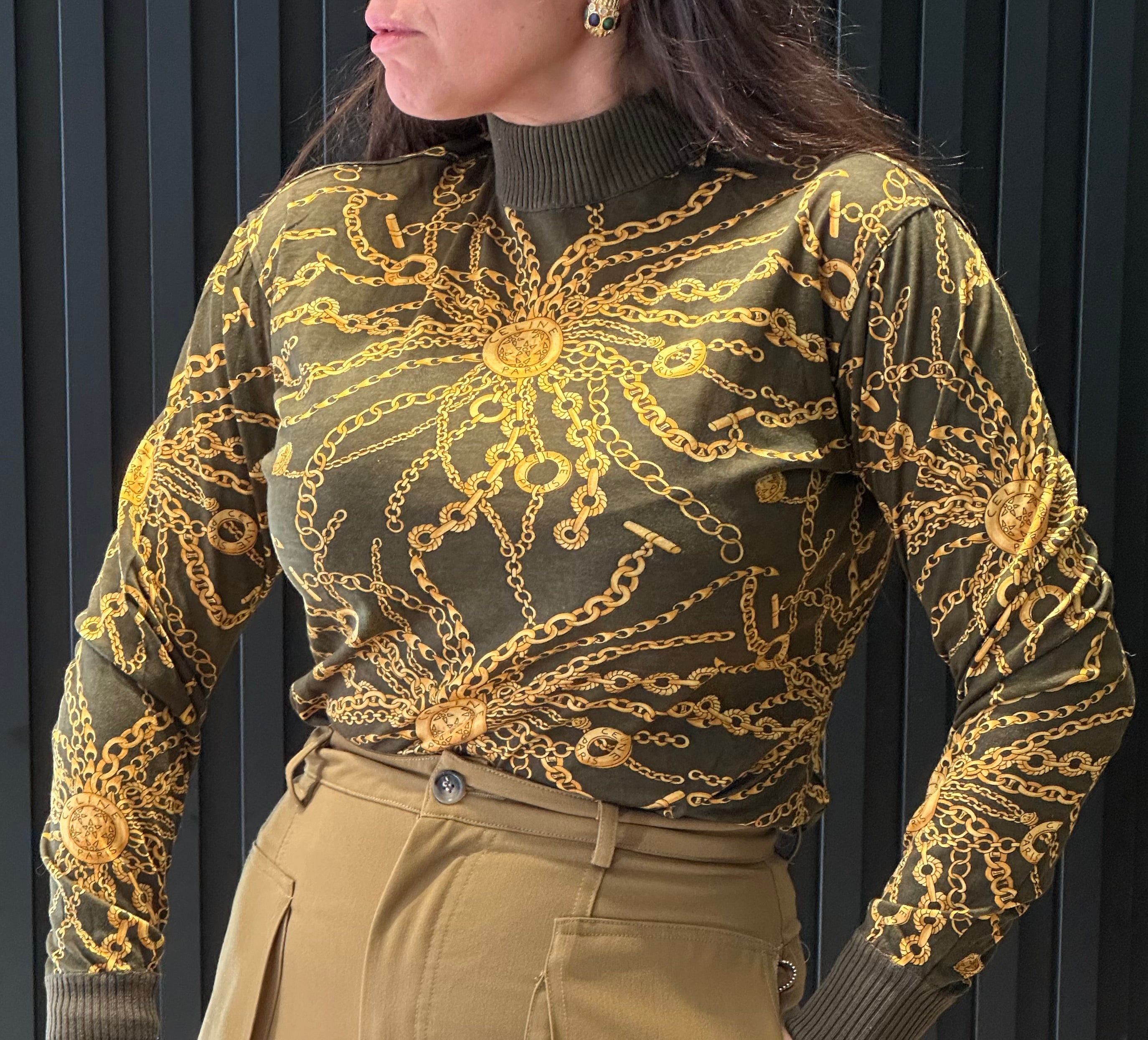 Splendide pull Céline vintage en laine, orné du motif emblématique de chaînes de ceinture, signature intemporelle de la maison. Son imprimé sophistiqué aux tons kaki profond et doré crée une allure chic, forte et immédiatement reconnaissable.
