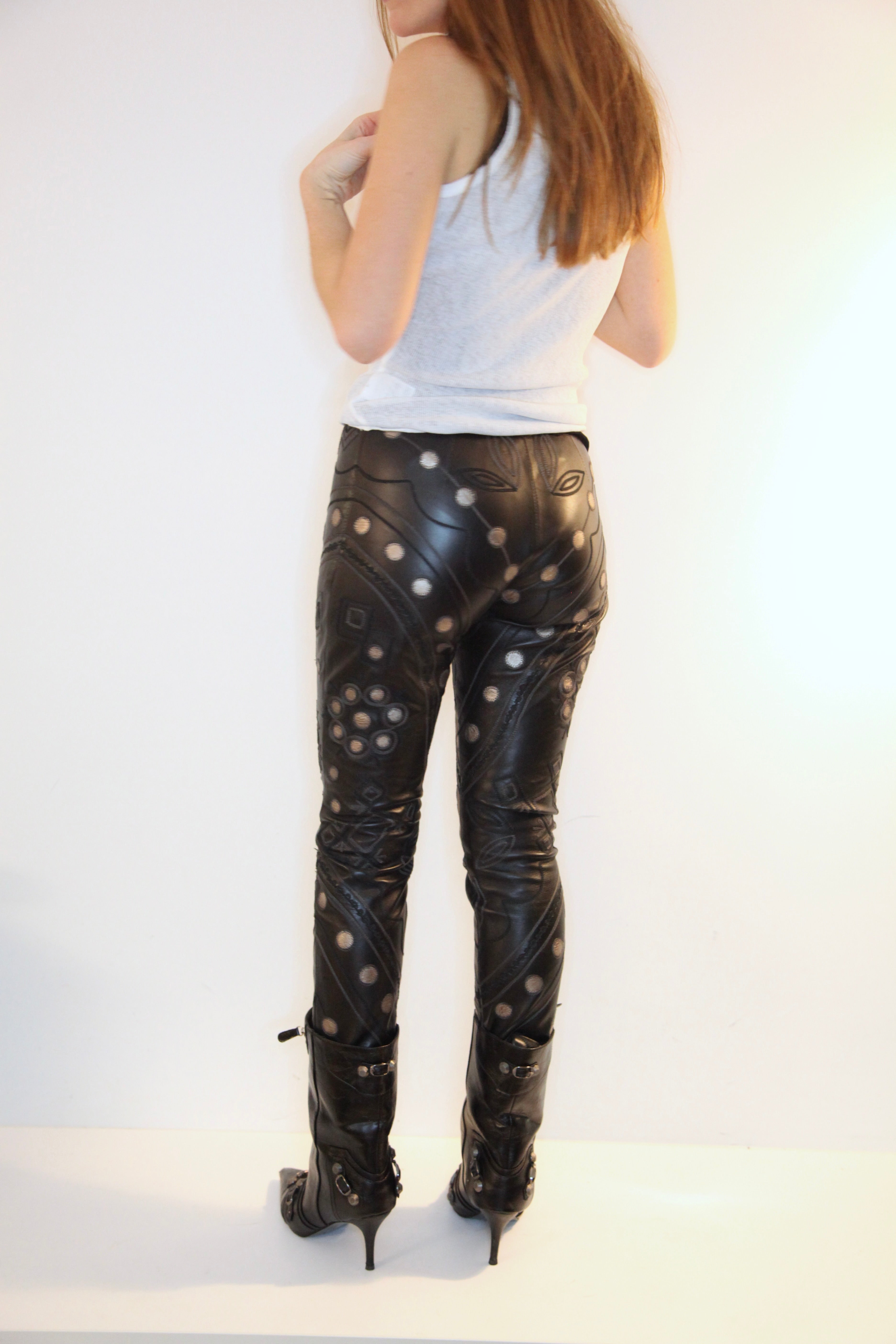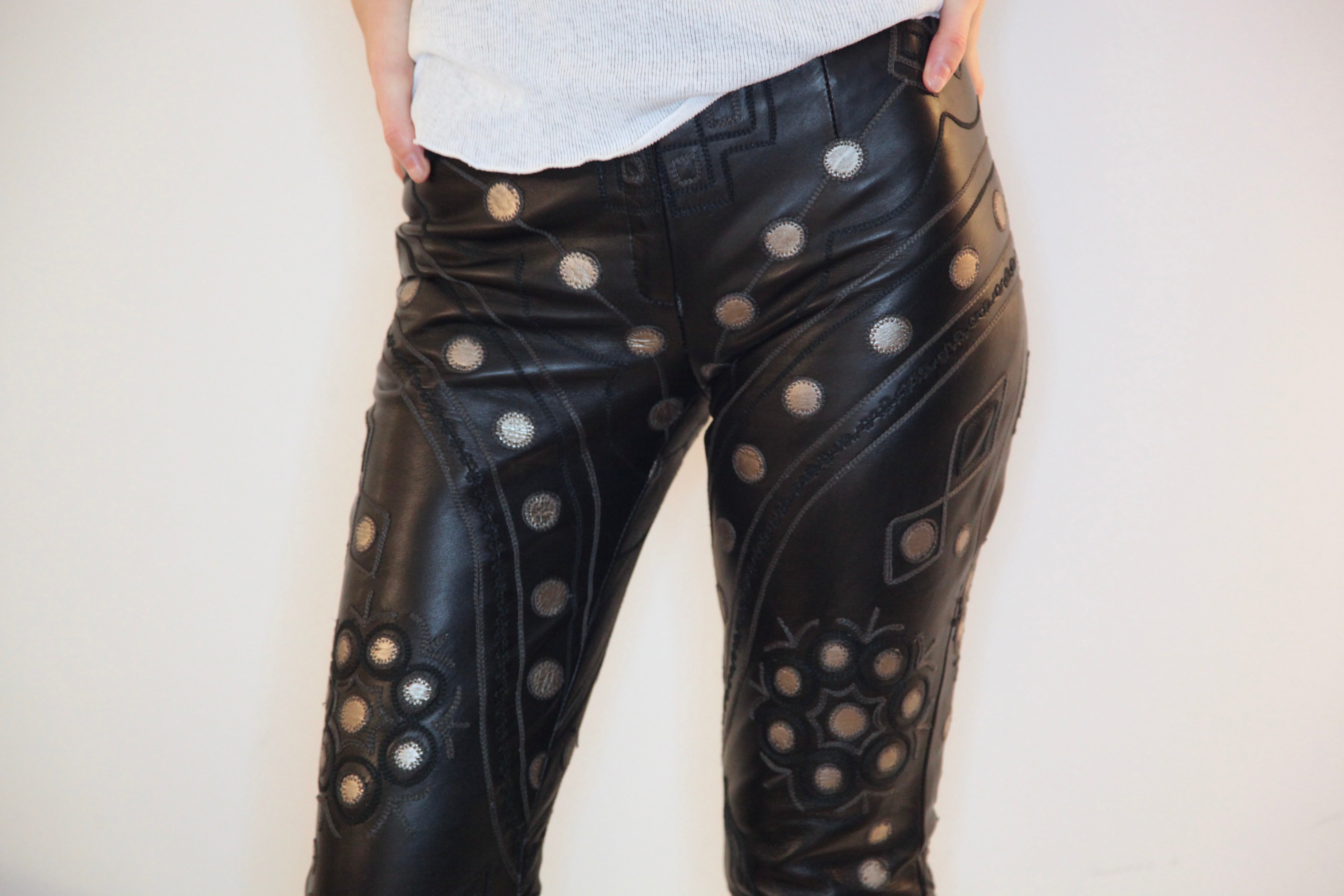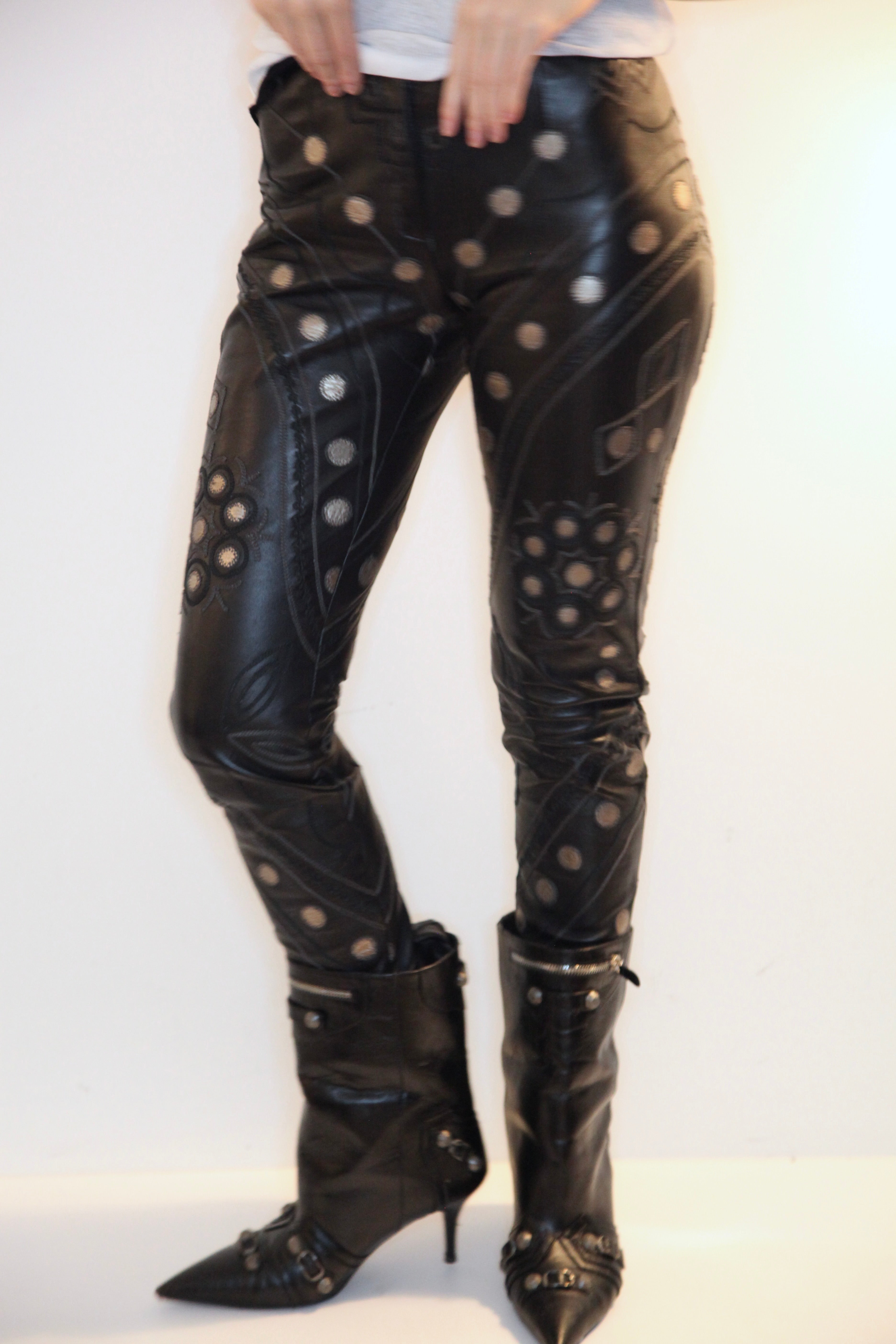 Le cuir souple et de qualité épouse la silhouette, offrant un confort inégalé tout en affirmant un style audacieux. Ce qui rend ce pantalon véritablement spécial, ce sont ses ornements uniques : des motifs incrustés et des applications de ronds argentés brillants. Ces détails graphiques créent un contraste saisissant avec le noir profond du cuir, capturant la lumière et attirant tous les regards.