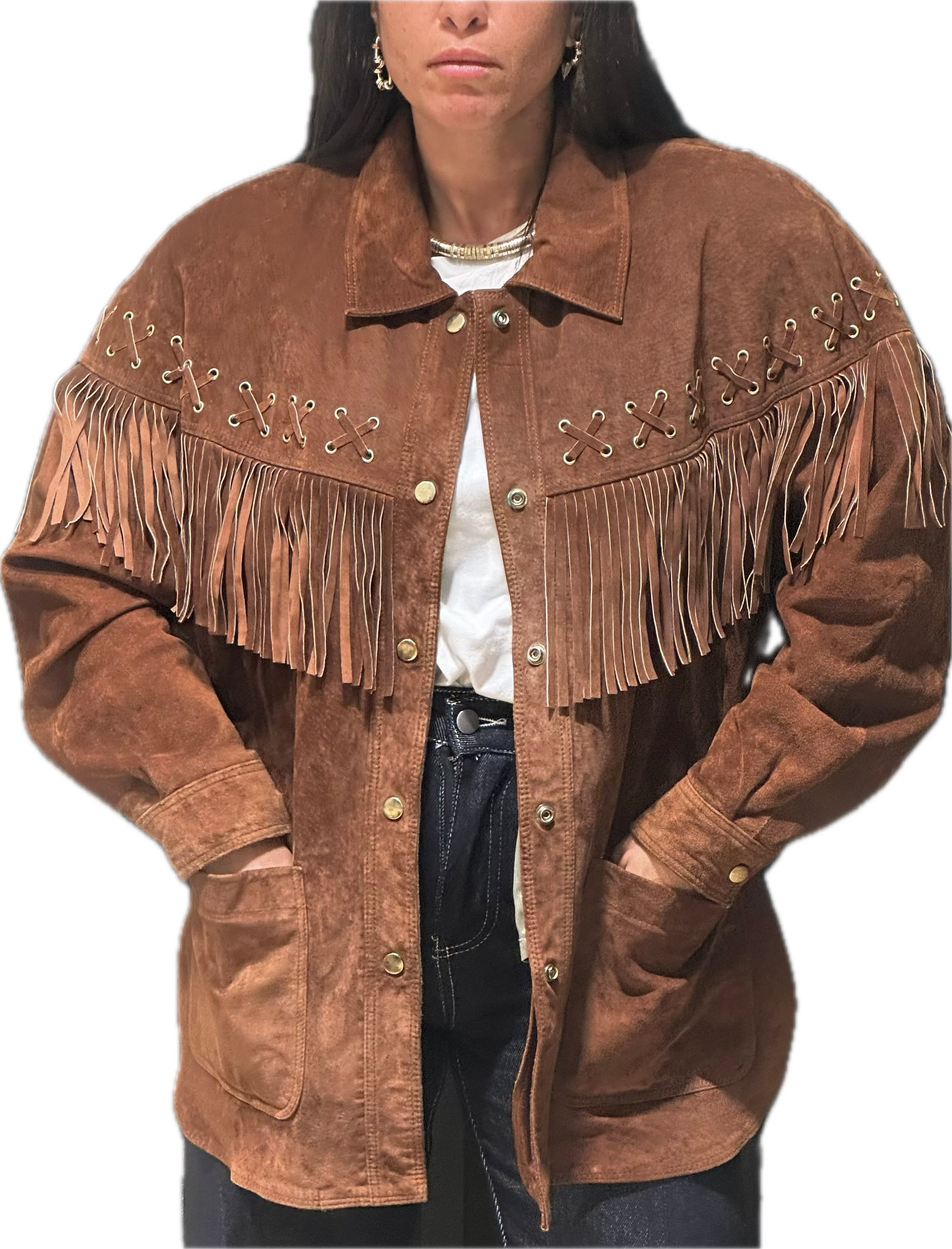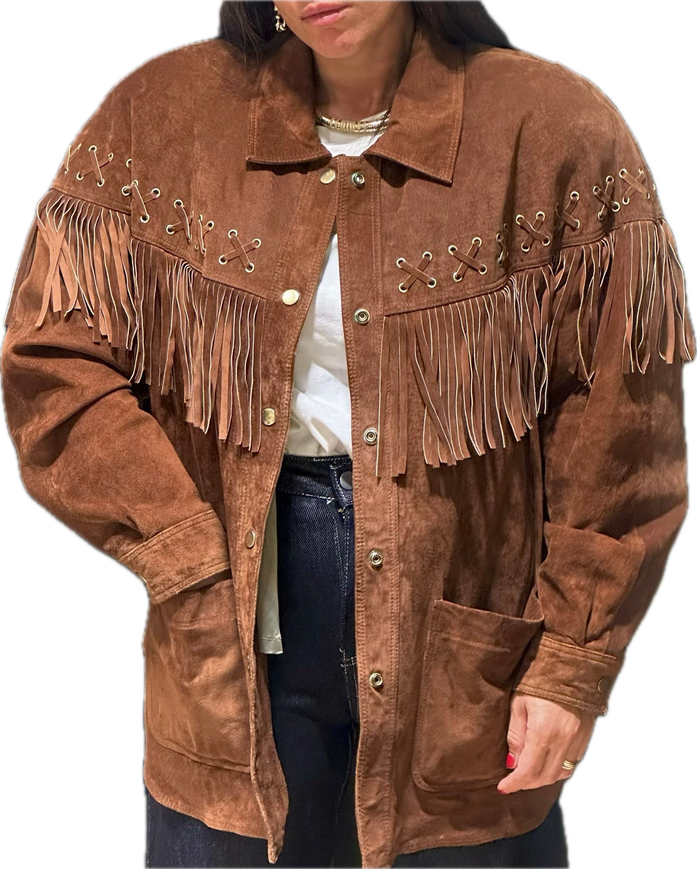 Ce qui la rend irrésistible ? Ses longues franges façon cowgirl qui ondulent sur la poitrine et dans le dos, associées à des détails lacés en œillets dorés pour une touche artisanale et résolument stylée. Chaque détail est pensé pour créer une pièce forte, mais facile à porter.