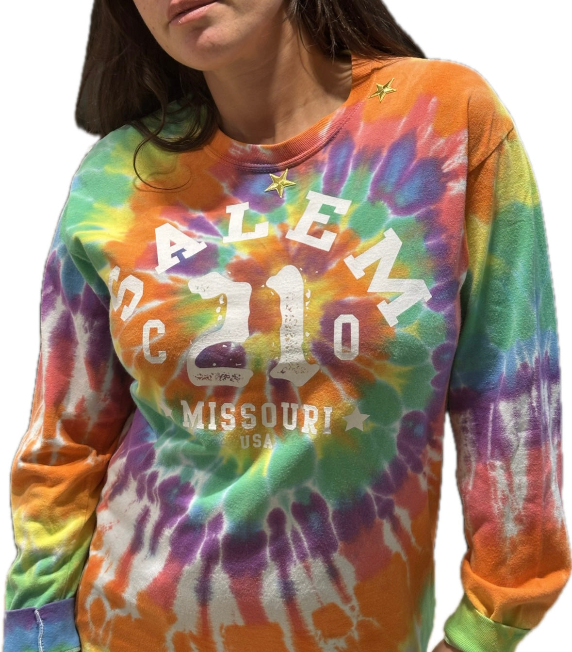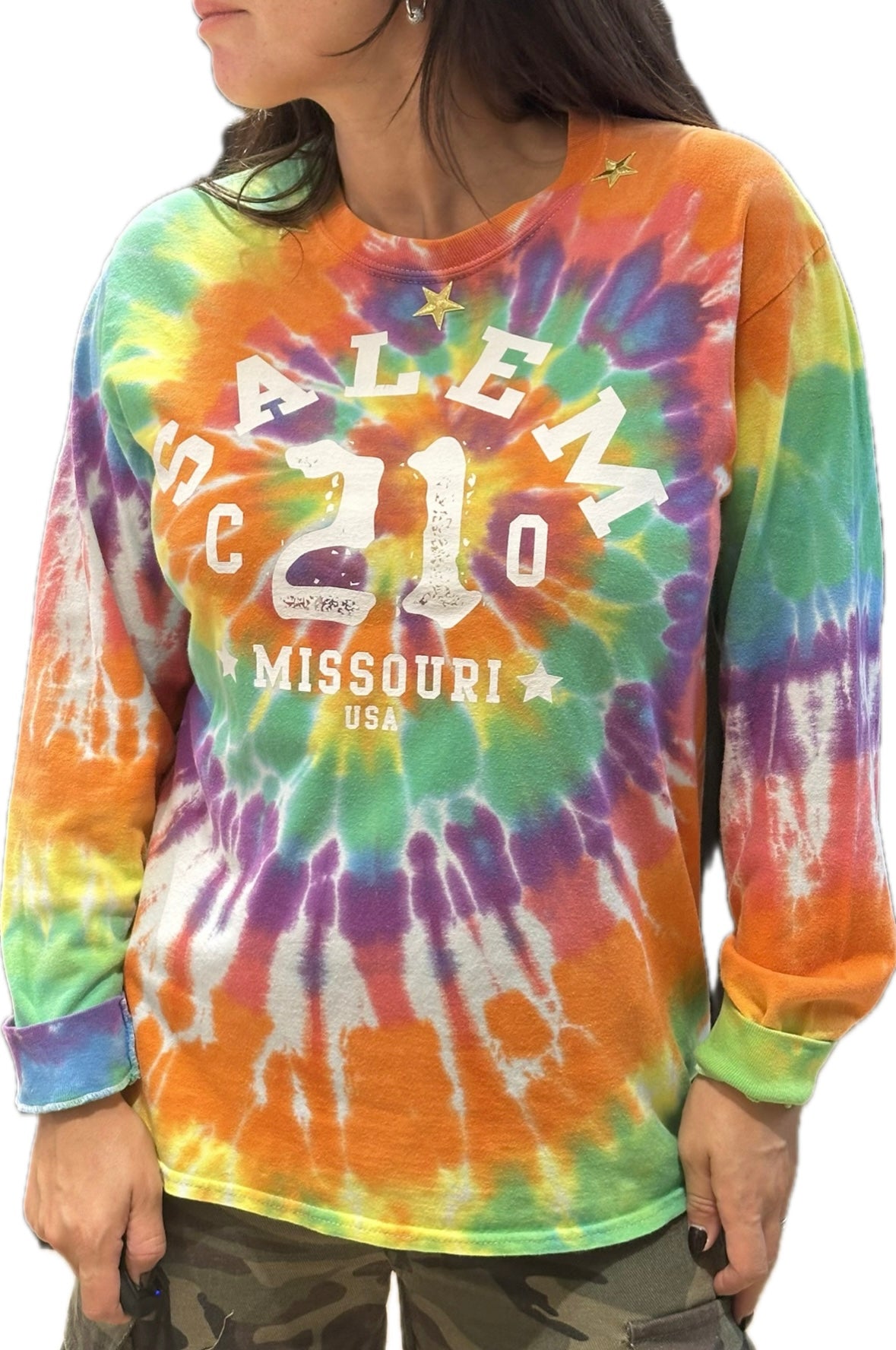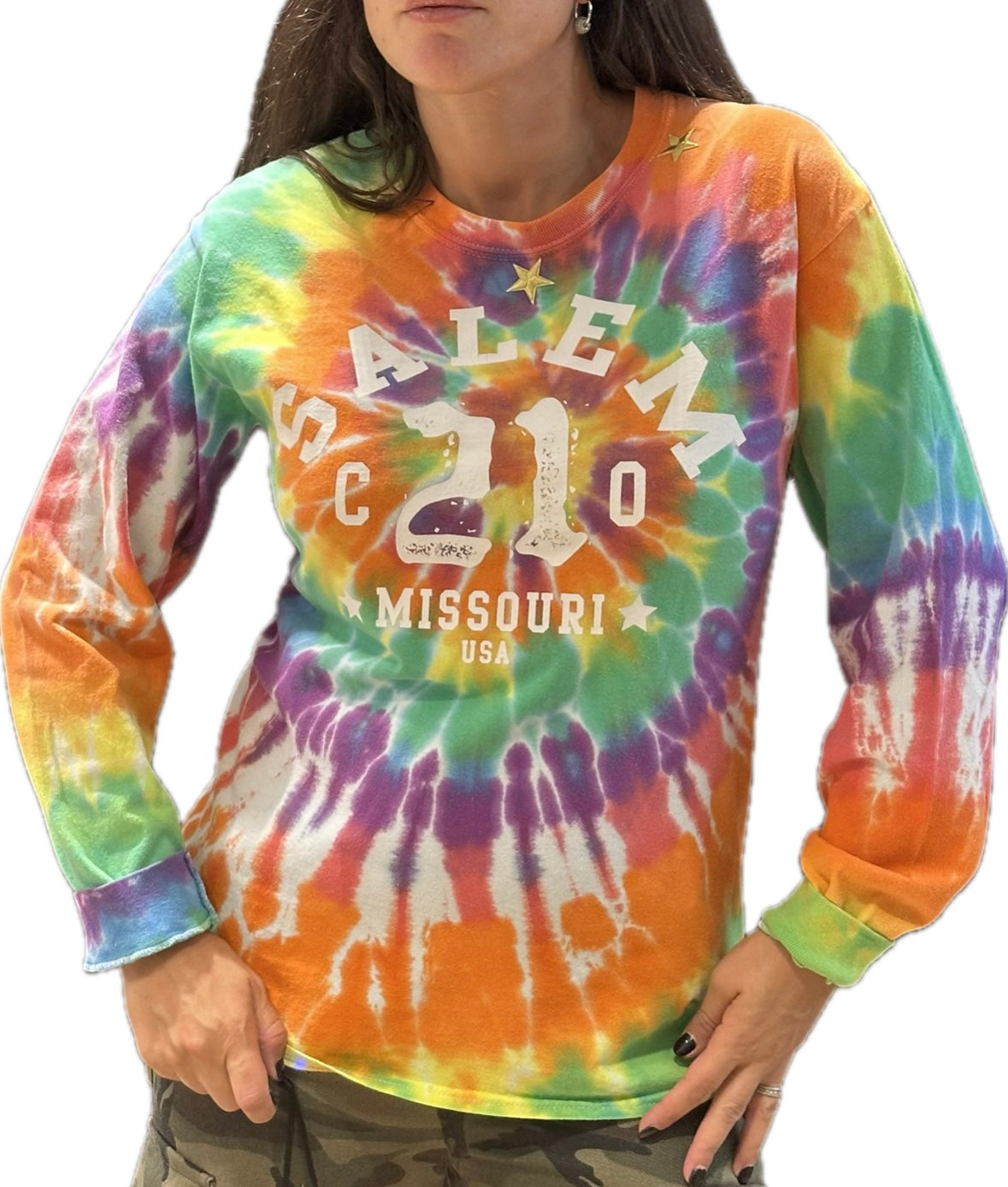 Explosion de couleurs et d’énergie avec ce sweat tie & dye vintage “Salem Missouri”, une pièce pleine de bonne humeur et d’attitude.