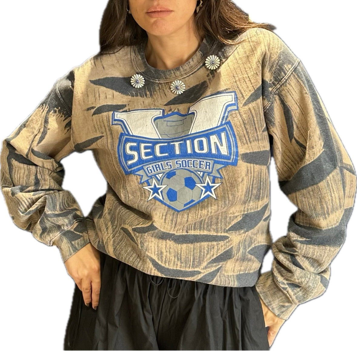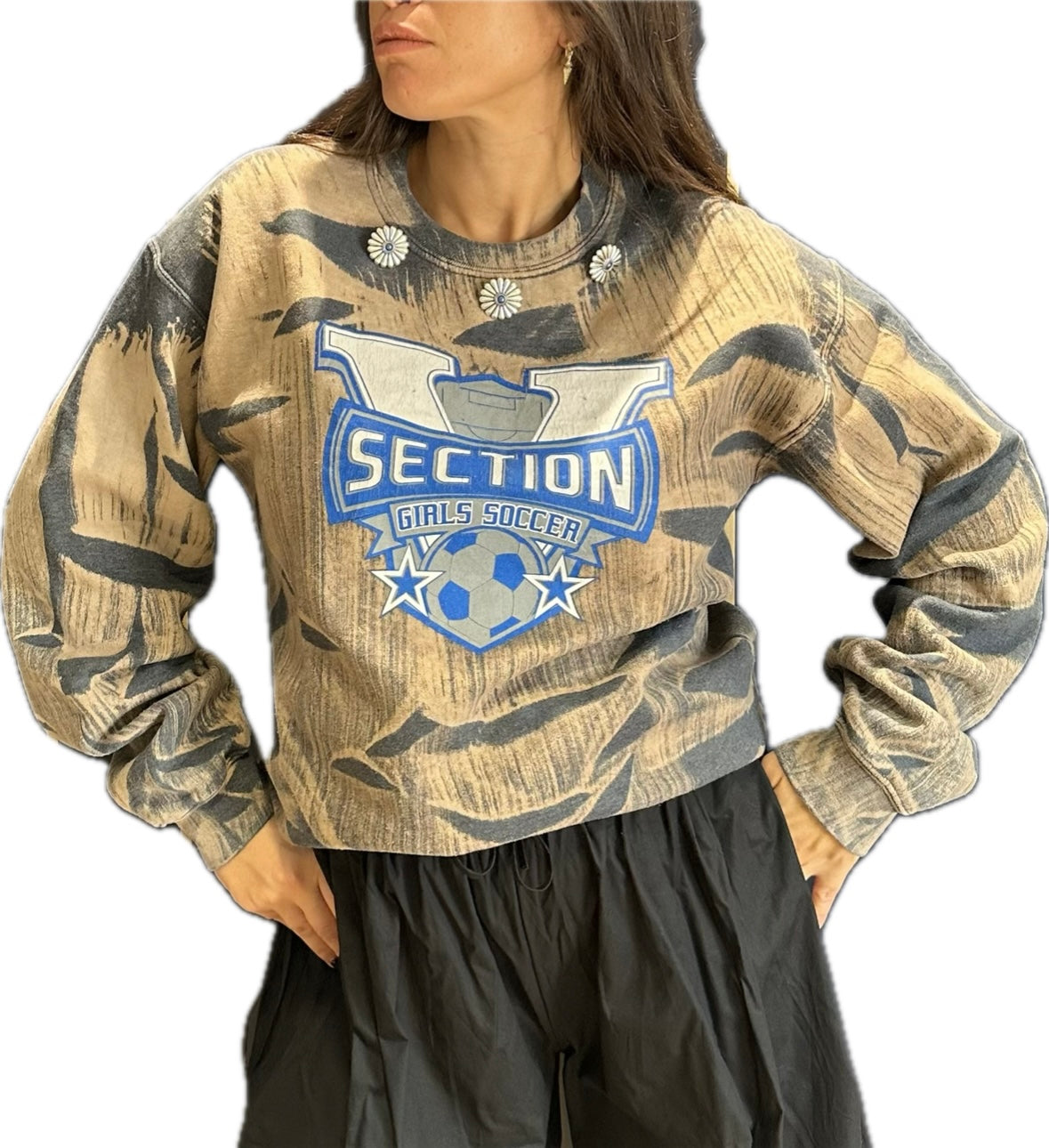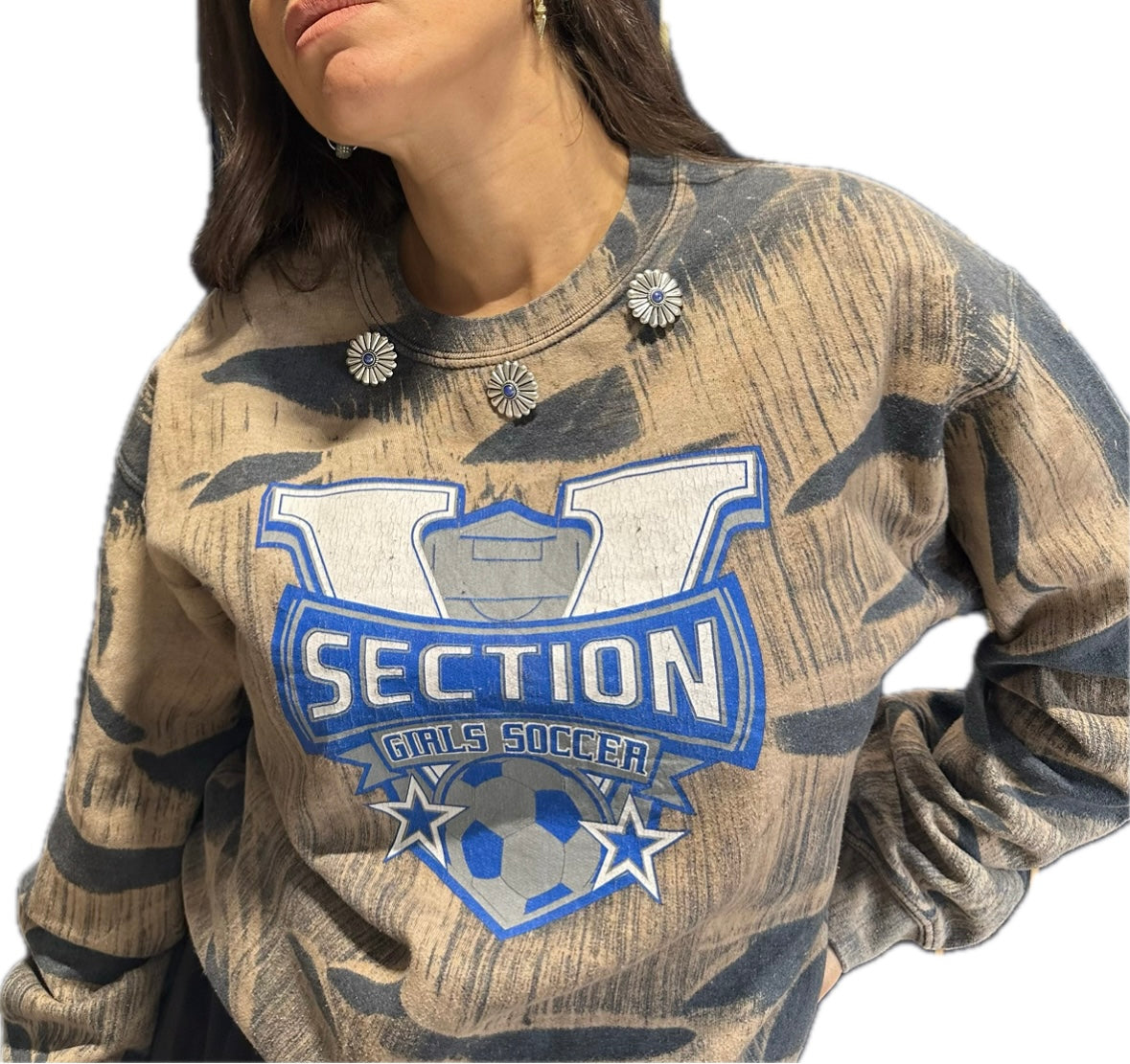 Sur le devant, l’imprimé “Section Girls Soccer” bleu vintage apporte une vibe rétro sportswear, typique des années 90.