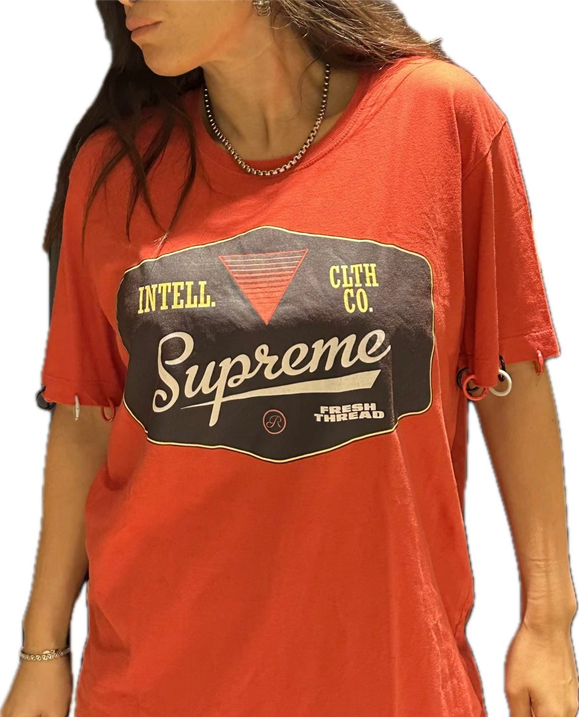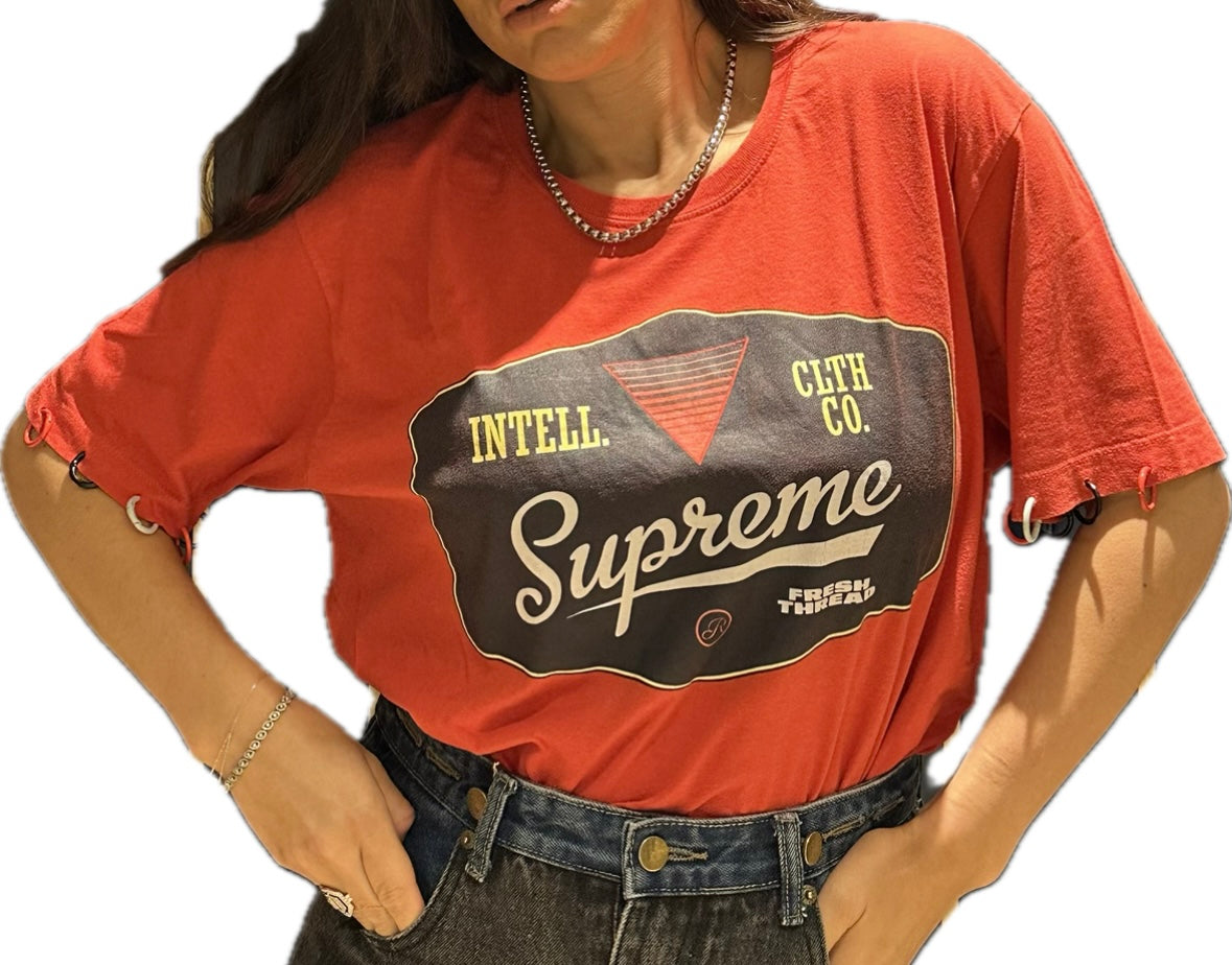 Ce t-shirt vintage est une pièce forte, twistée par une customisation artisanale ultra pointue. En coton rouge intense, il affiche un imprimé rétro “SUPREME – Fresh Thread” au centre, rappelant les visuels iconiques des années 90. Les manches ont été entièrement retravaillées avec des anneaux métalliques colorés, ajoutant une dimension punk et contemporaine à ce basique devenu bijou.