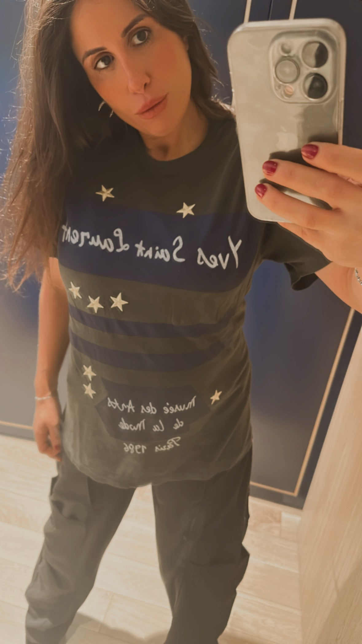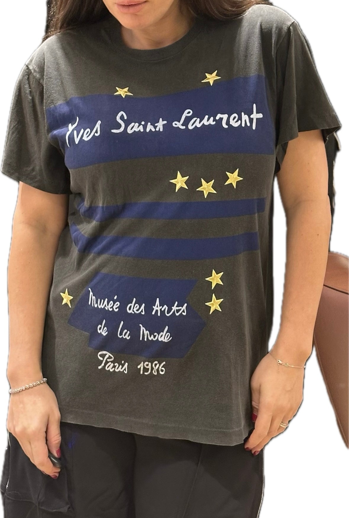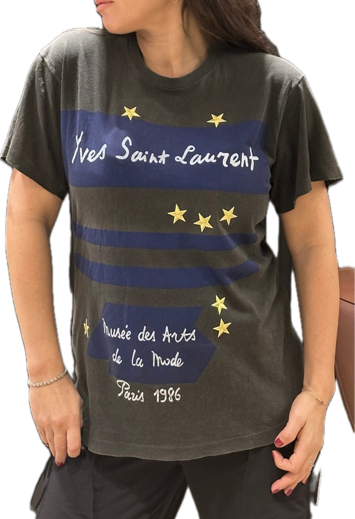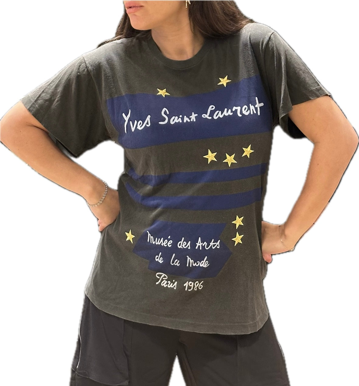 Pièce rare et iconique, ce t-shirt Yves Saint Laurent vintage rend hommage à l’exposition du Musée des Arts de la Mode – Paris 1986.