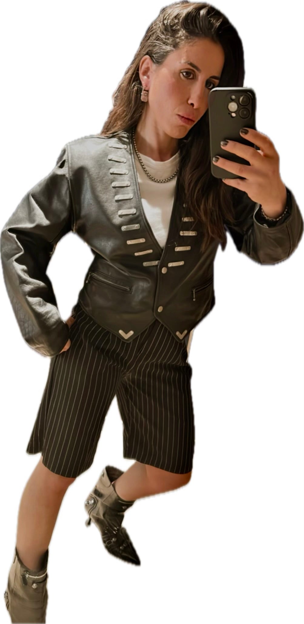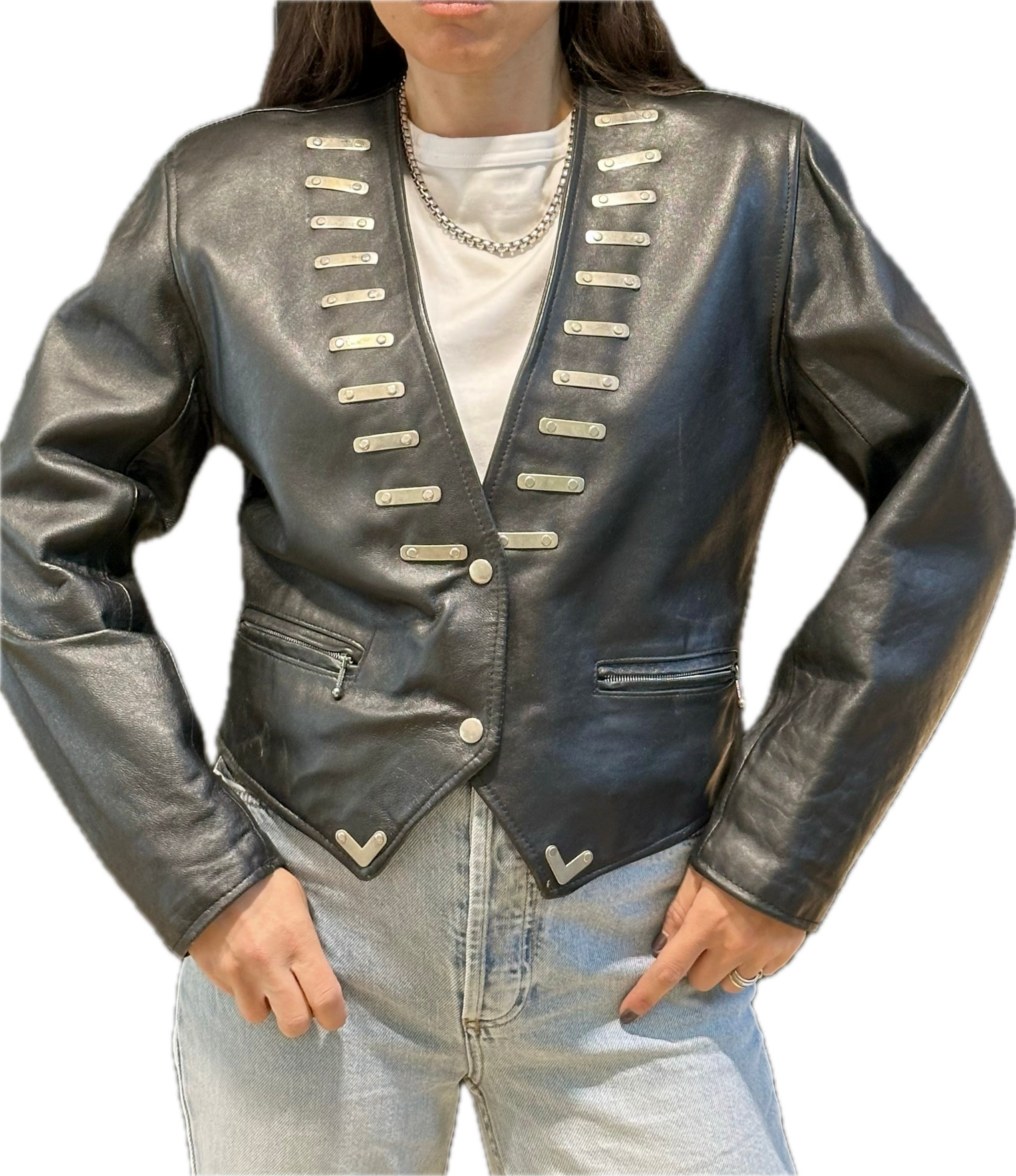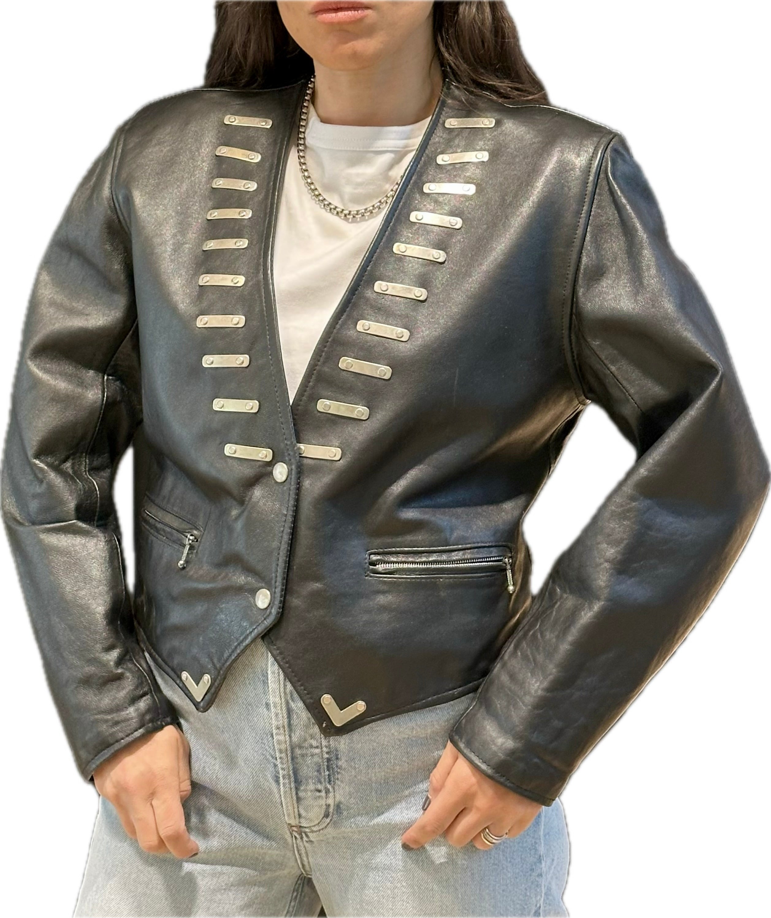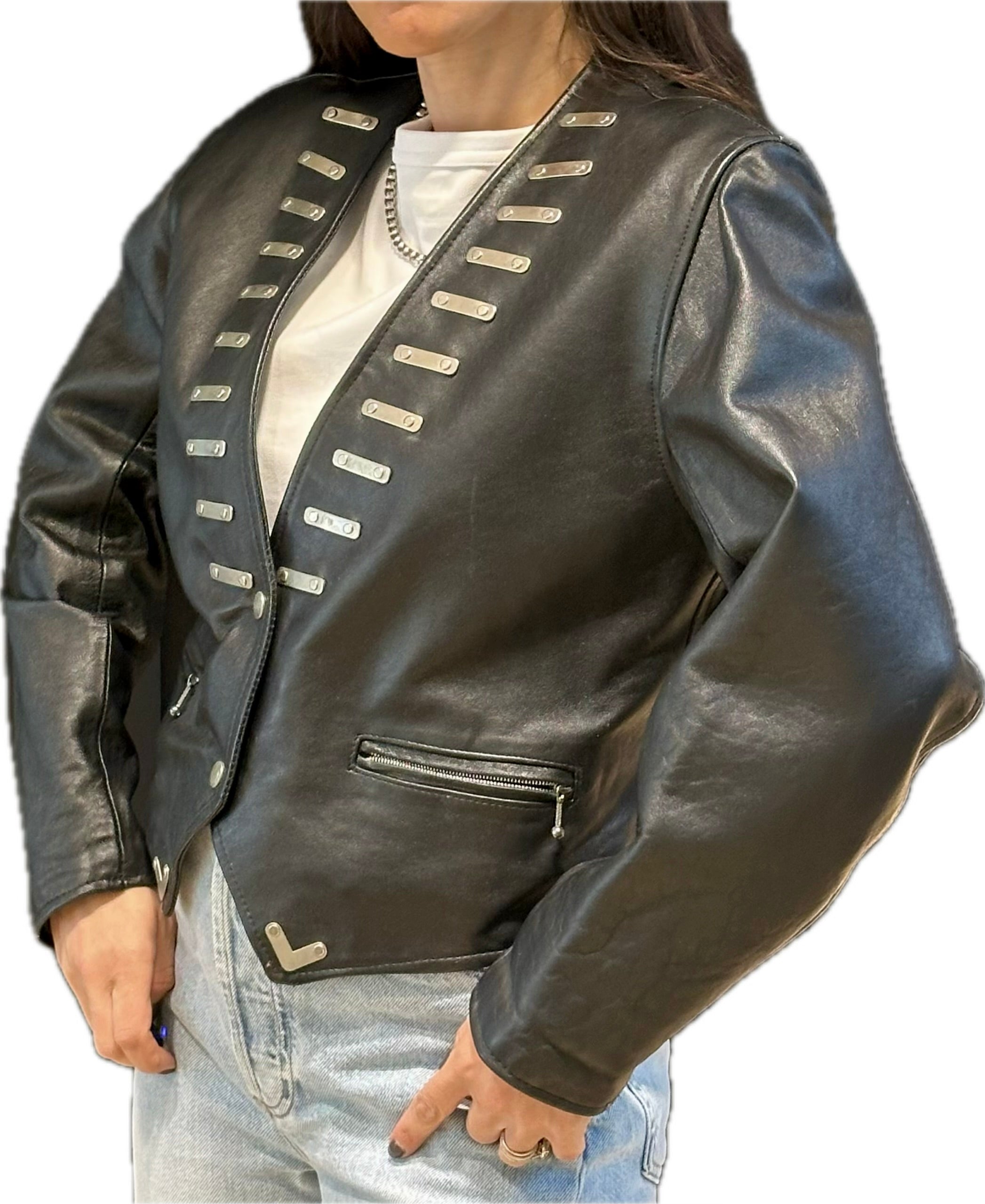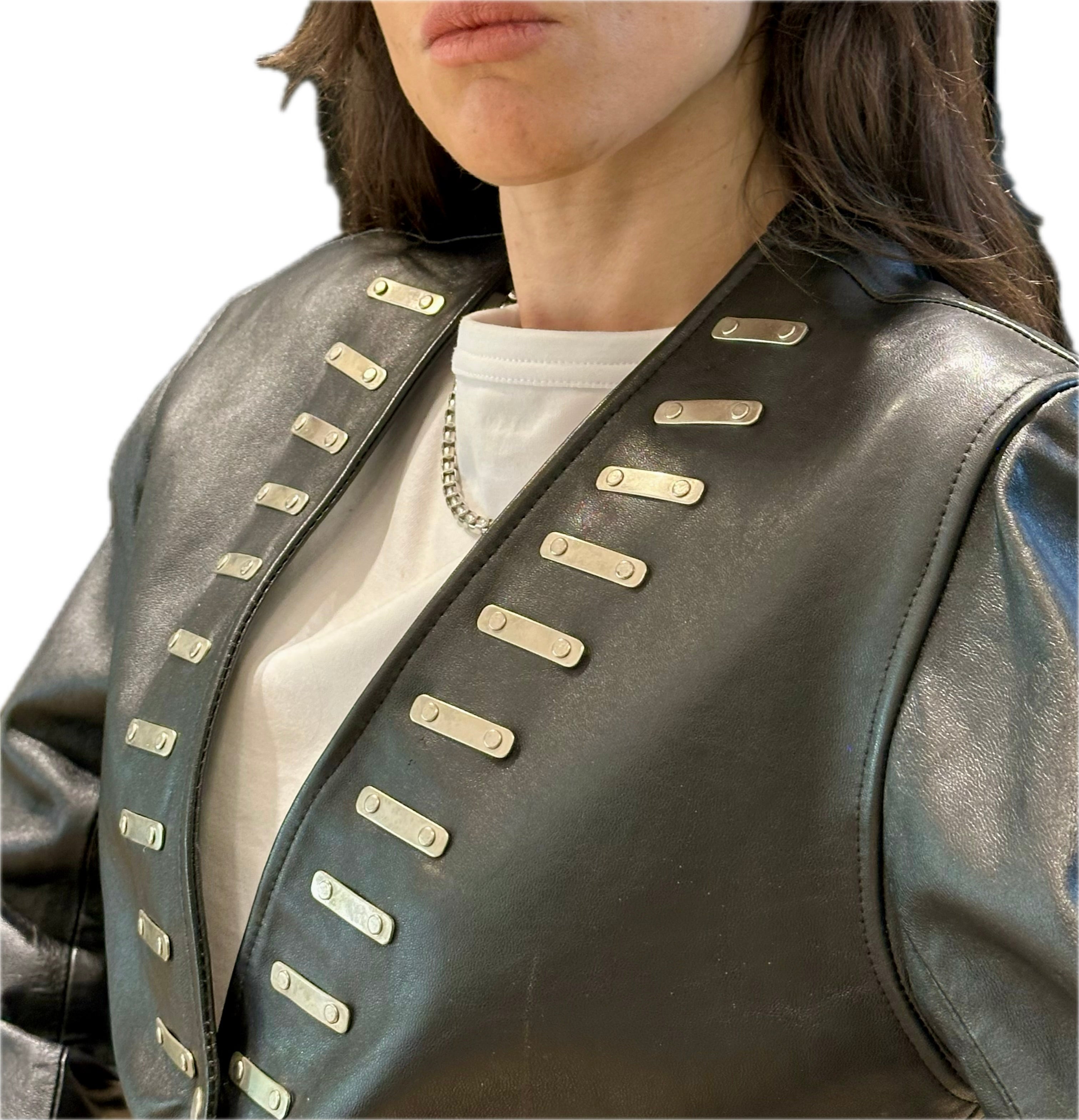 Confectionnée dans un cuir de qualité, cette veste se distingue par ses élégantes plaques argentées qui ornent le col sur toute sa longueur et le bas de la veste, ajoutant un éclat métallique subtil et original.