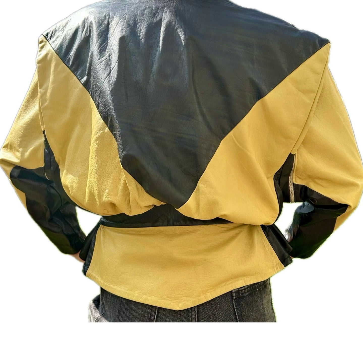 Veste en cuir vintage 2-en-1 jaune et noire à manches amovibles.