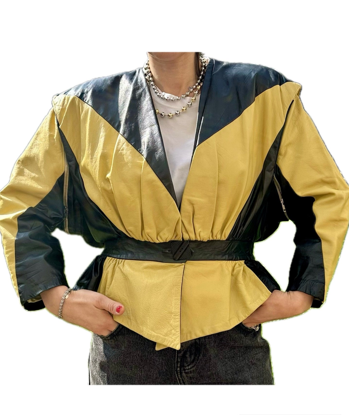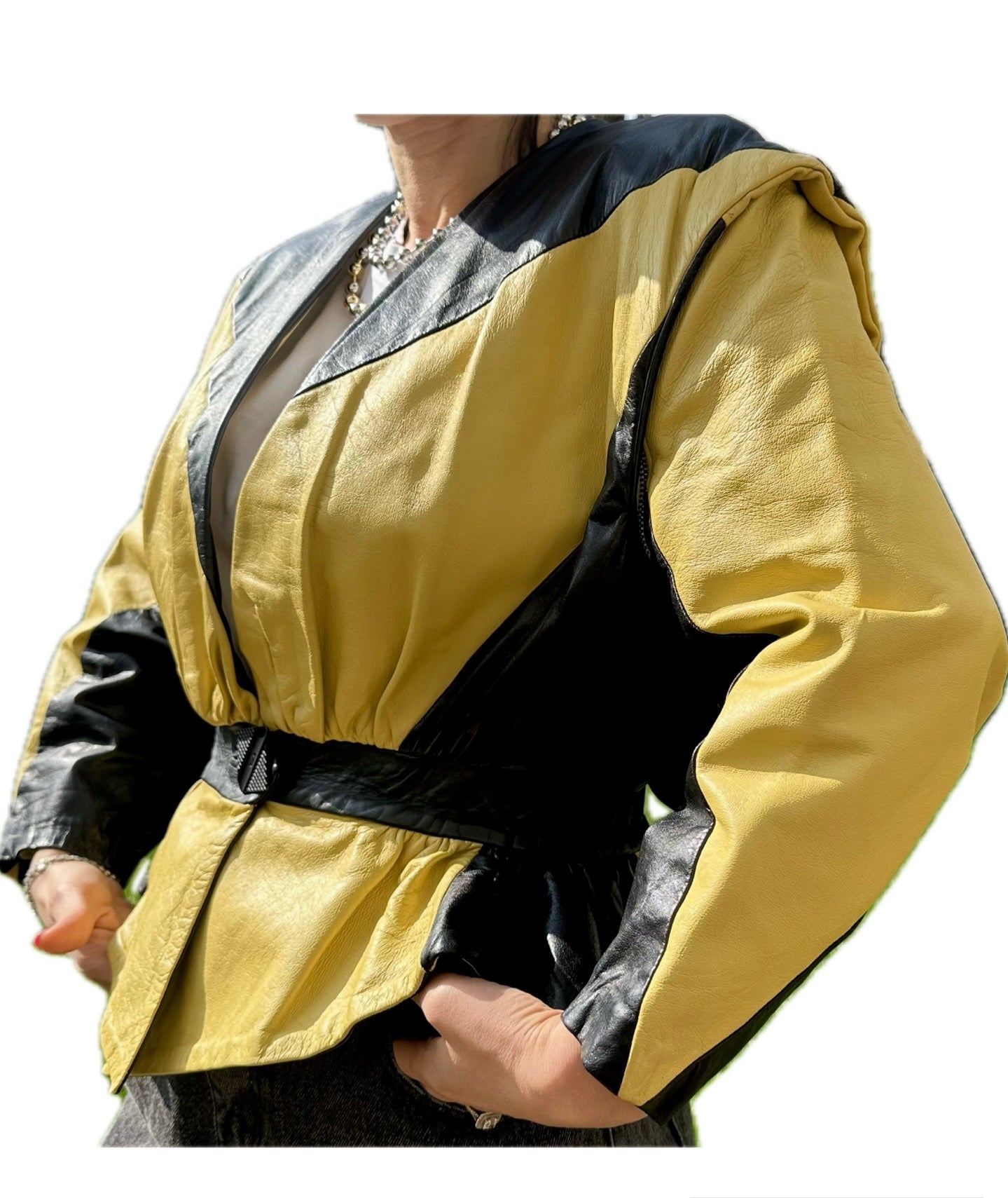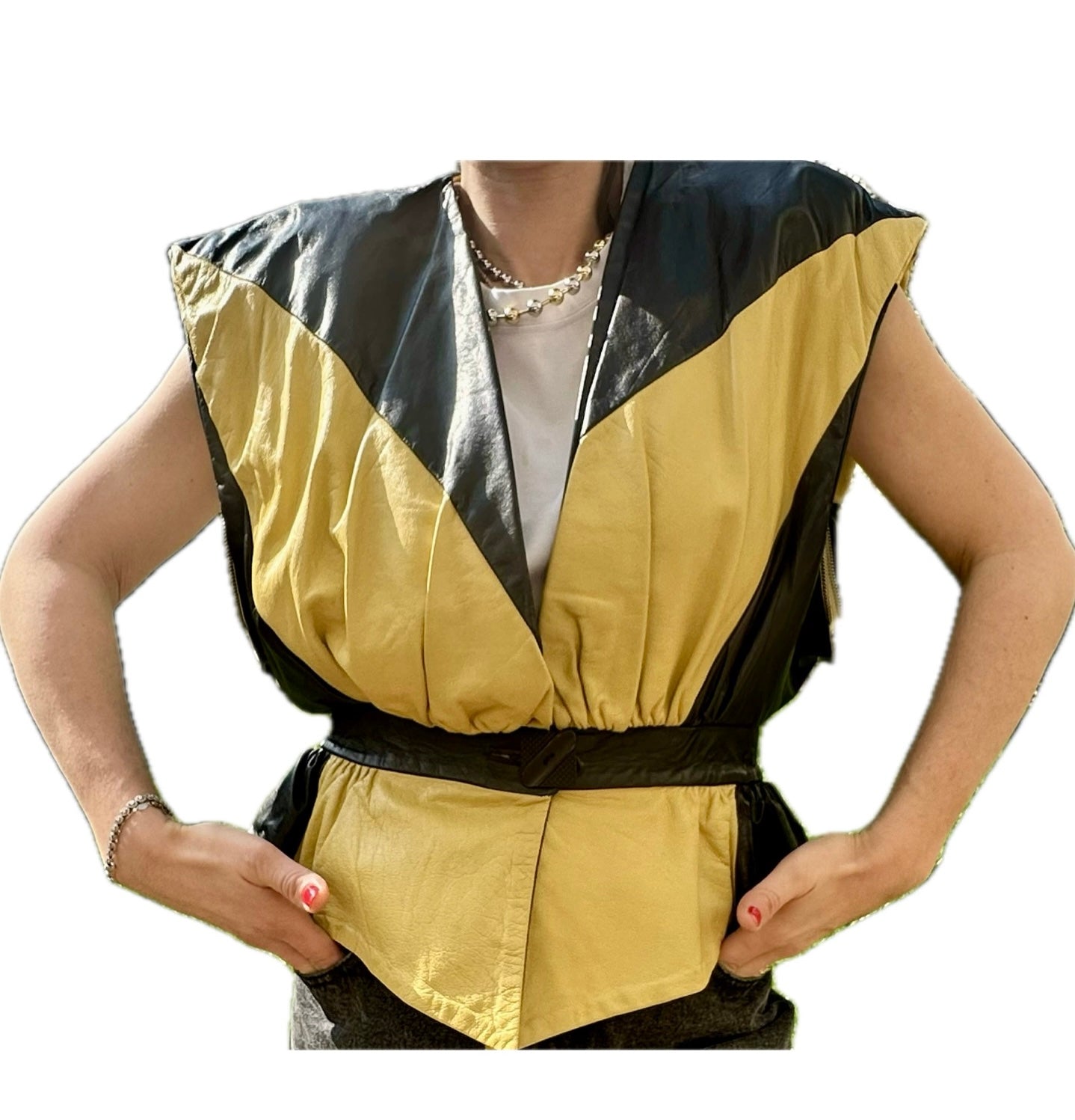 Découvrez cette pièce vintage unique et audacieuse : une veste en cuir véritable qui se transforme astucieusement en un élégant gilet sans manches ! Son design rétro, avec des empiècements graphiques en cuir jaune vif et noir profond, apporte une touche d'originalité et de caractère à votre style.