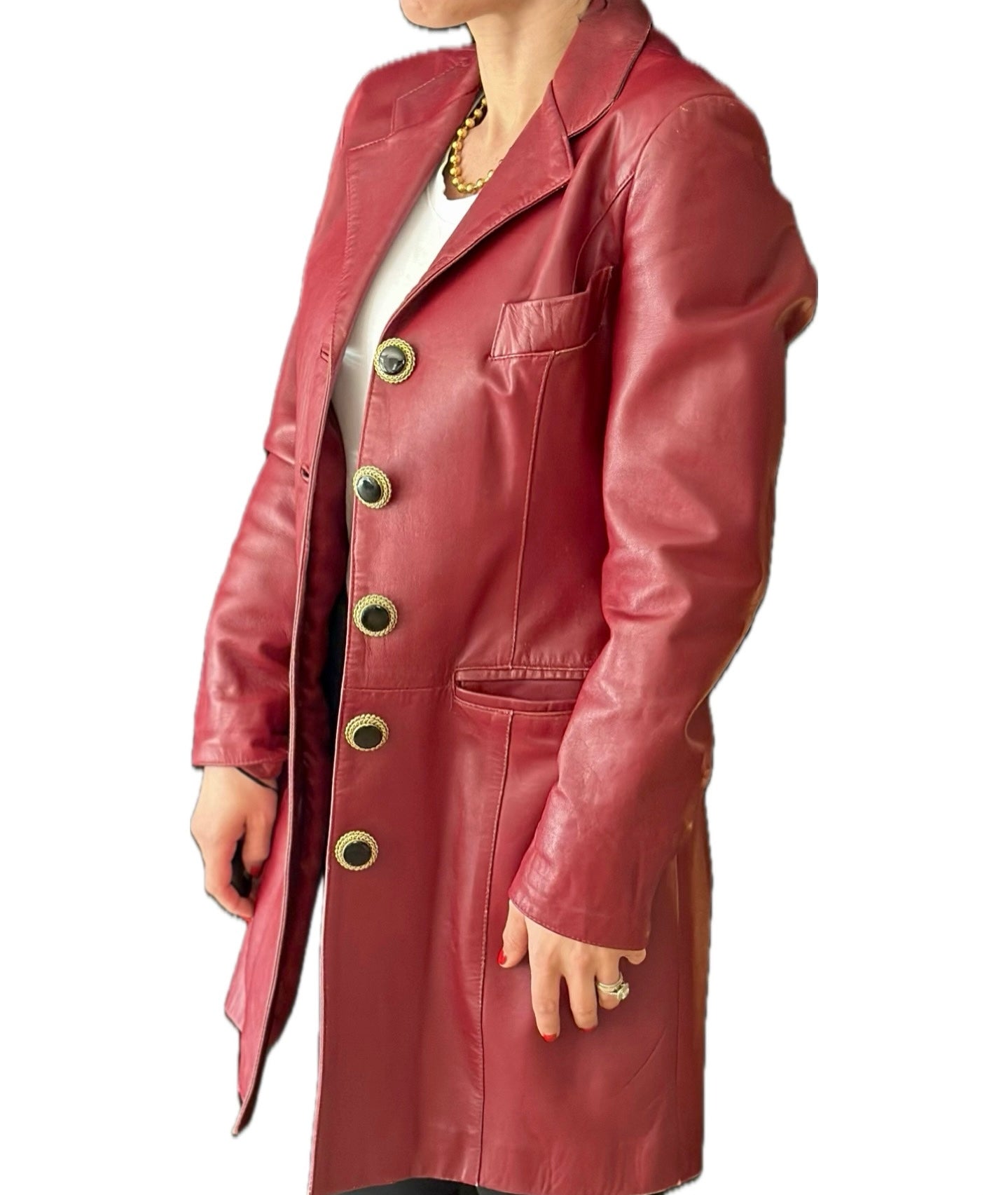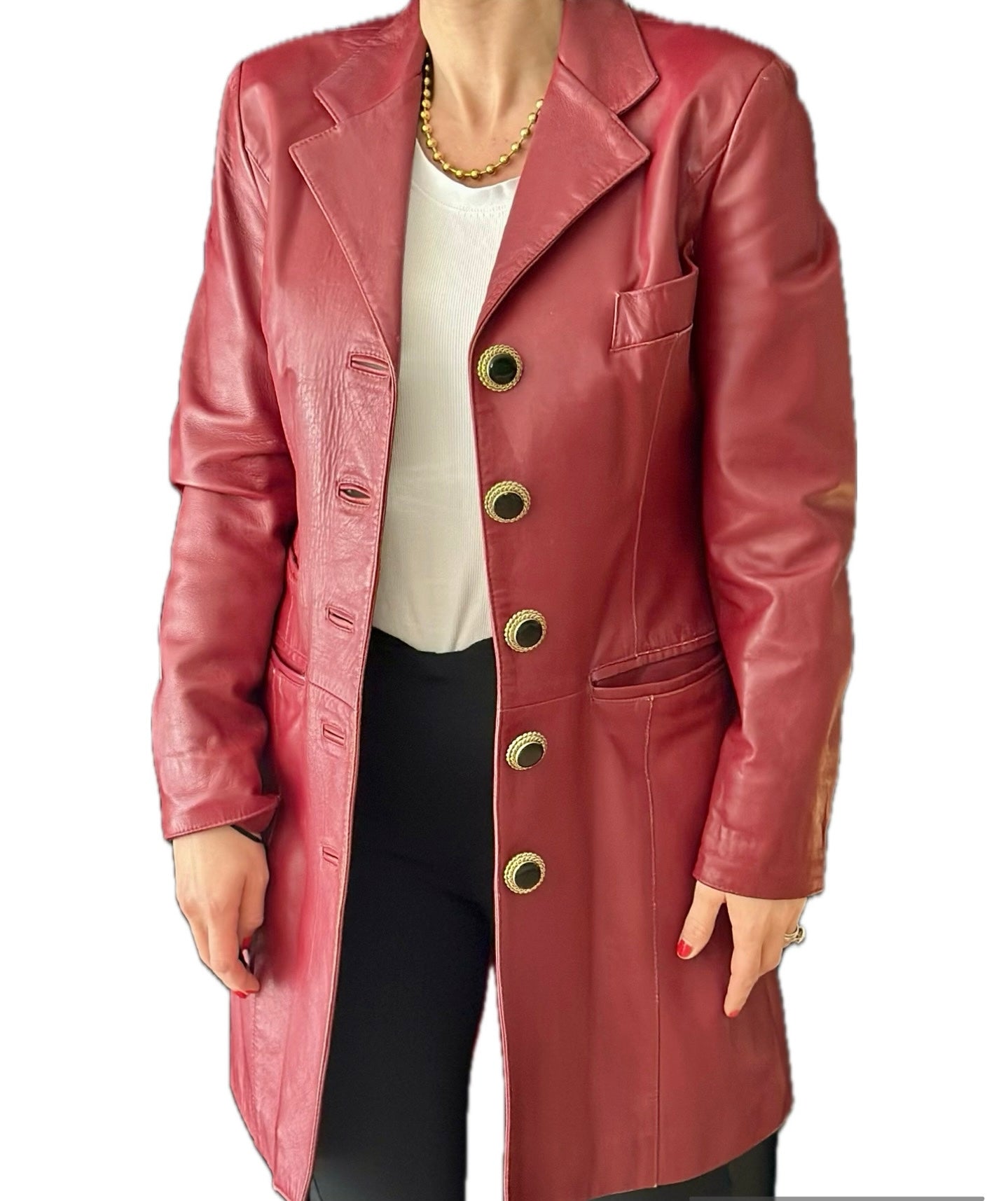 Longue Veste en Cuir Vintage Rouge Bordeaux - Boutons Rétro Noirs et Dorés - Taille 38 Découvrez cette magnifique longue... En savoir plus