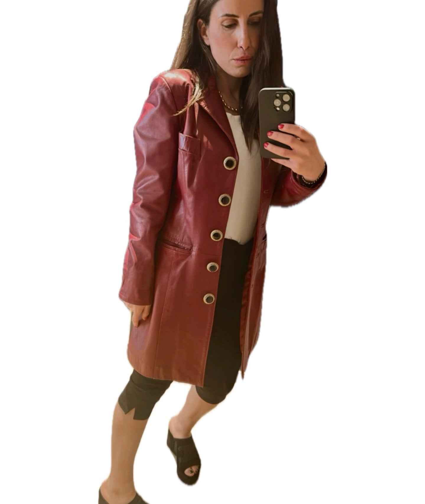 VESTE LONGUE EN CUIR ROUGE-BORDEAUX