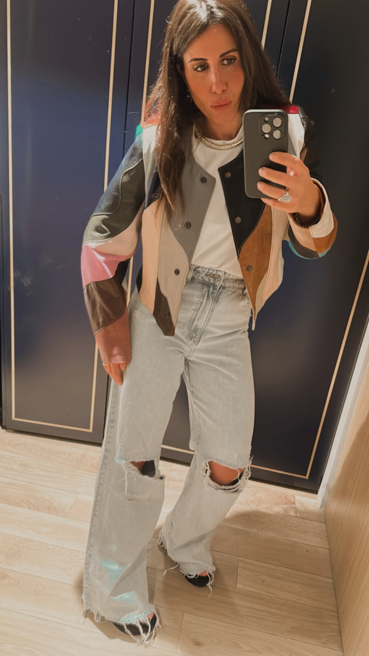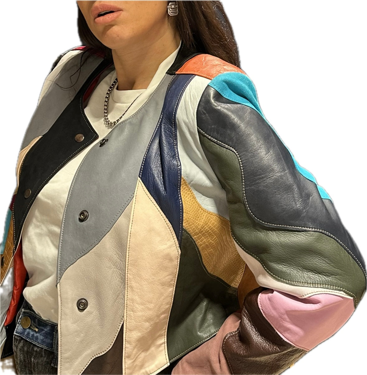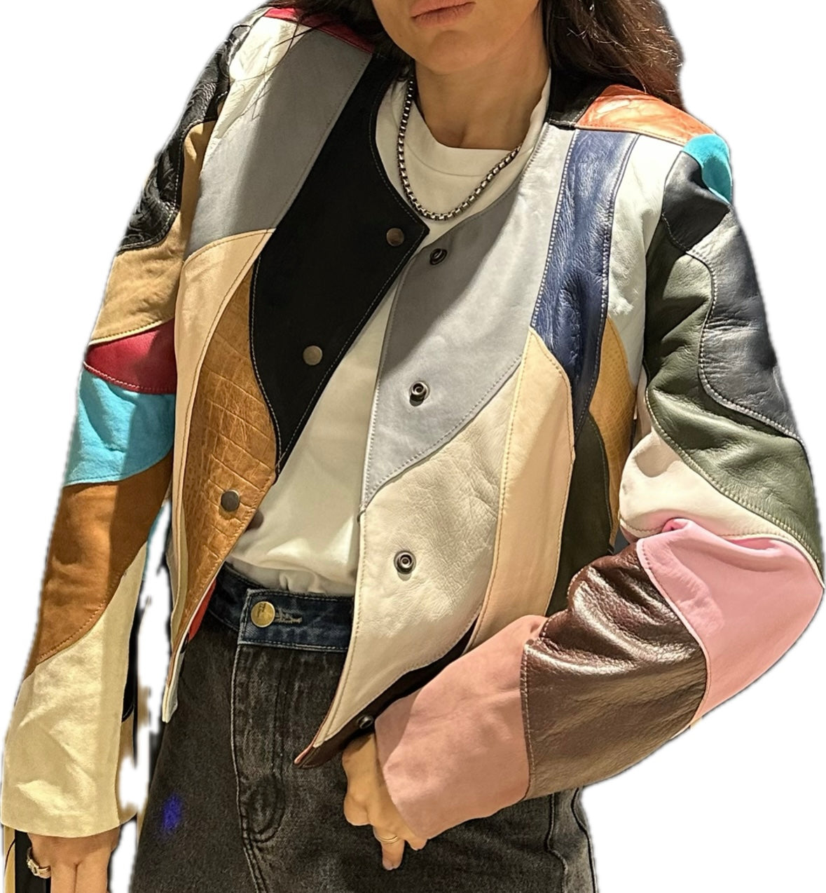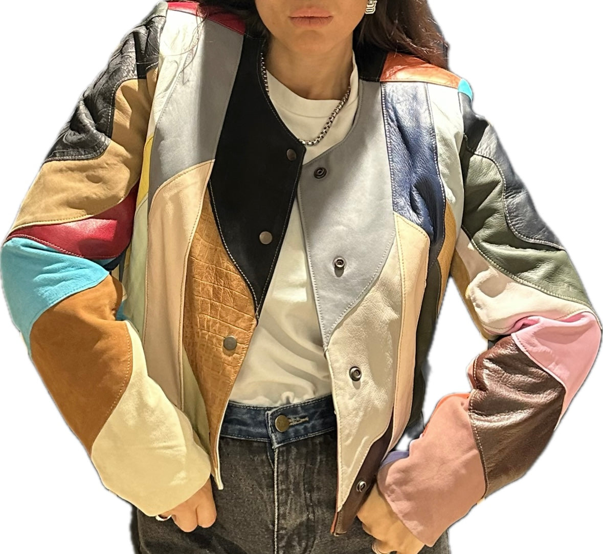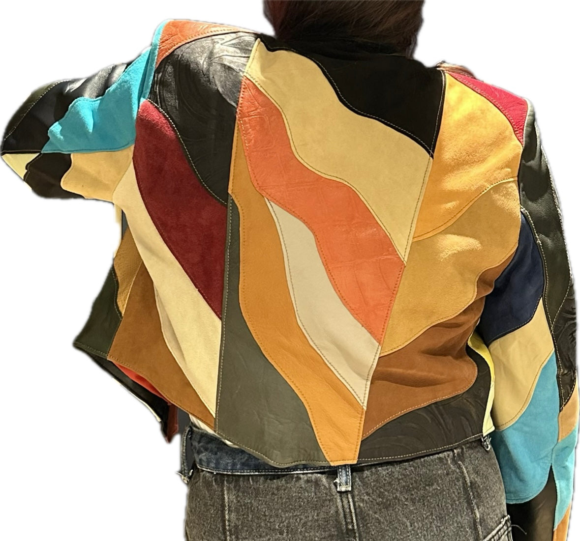Cette sublime veste en cuir vintage est une pièce manifeste, un hymne à l’art du patchwork et à la liberté de style. Composée de cuir et de daim véritable, chaque panneau multicolore a été assemblé avec précision pour créer une pièce unique au charme brut et sophistiqué.
