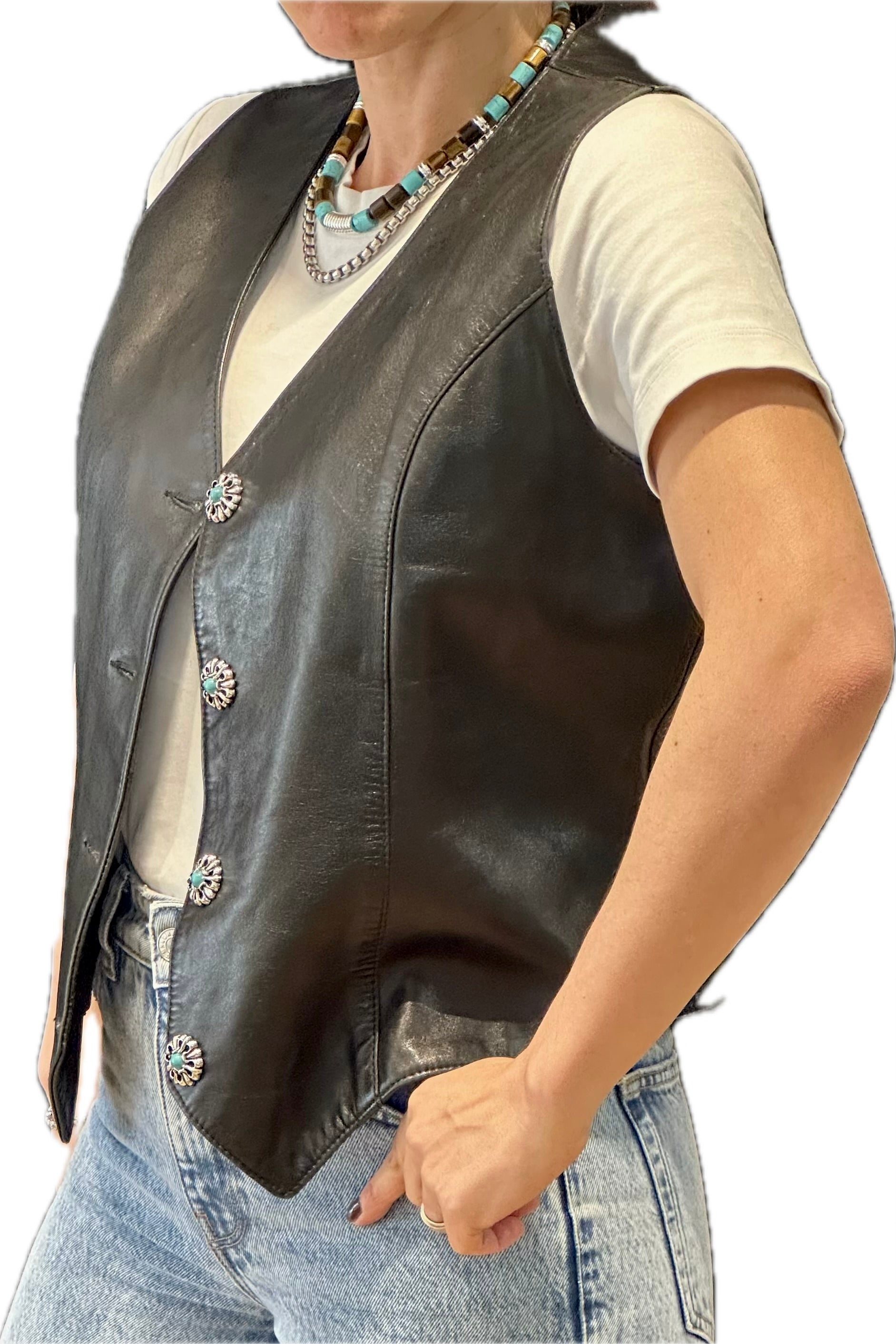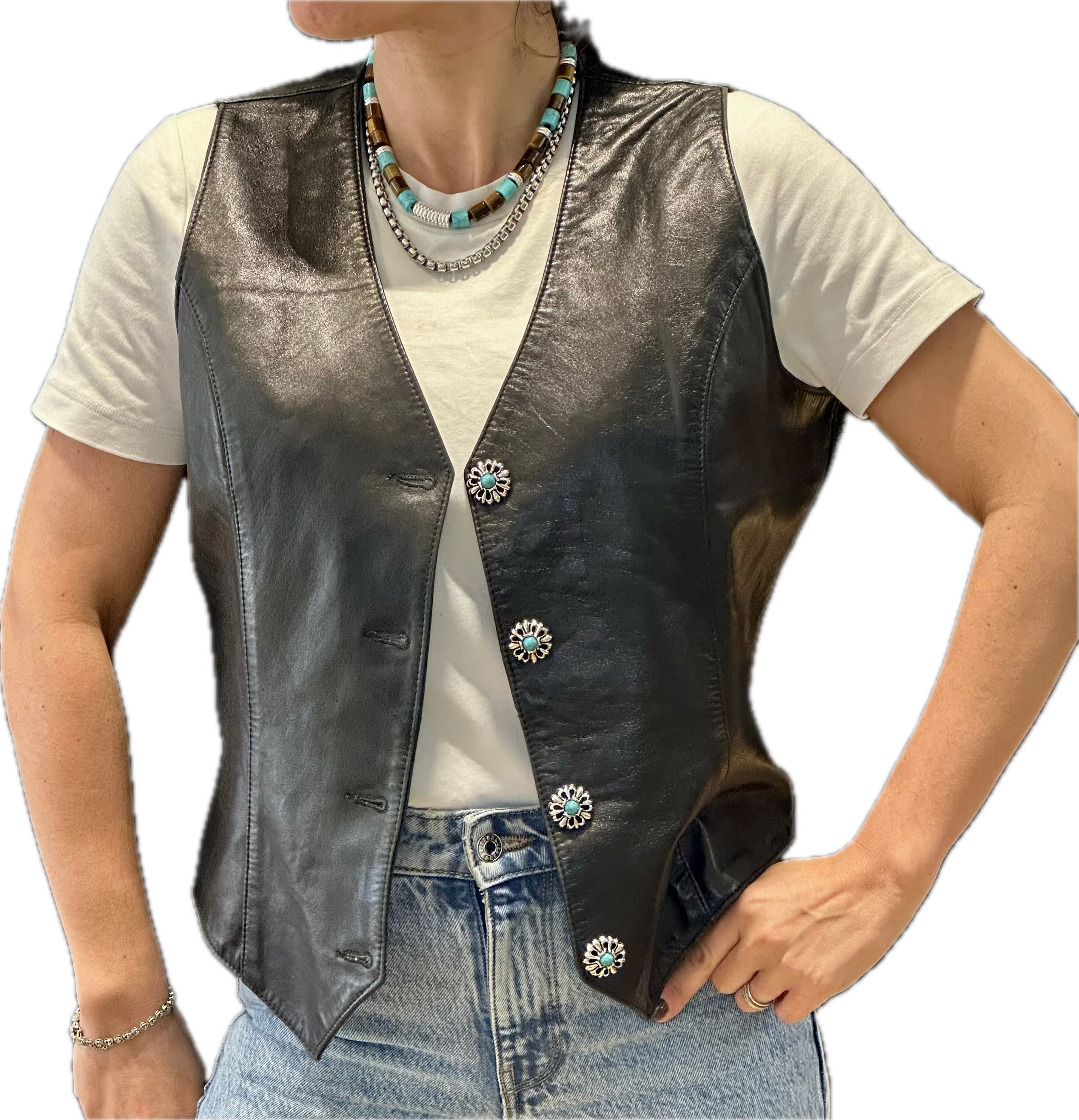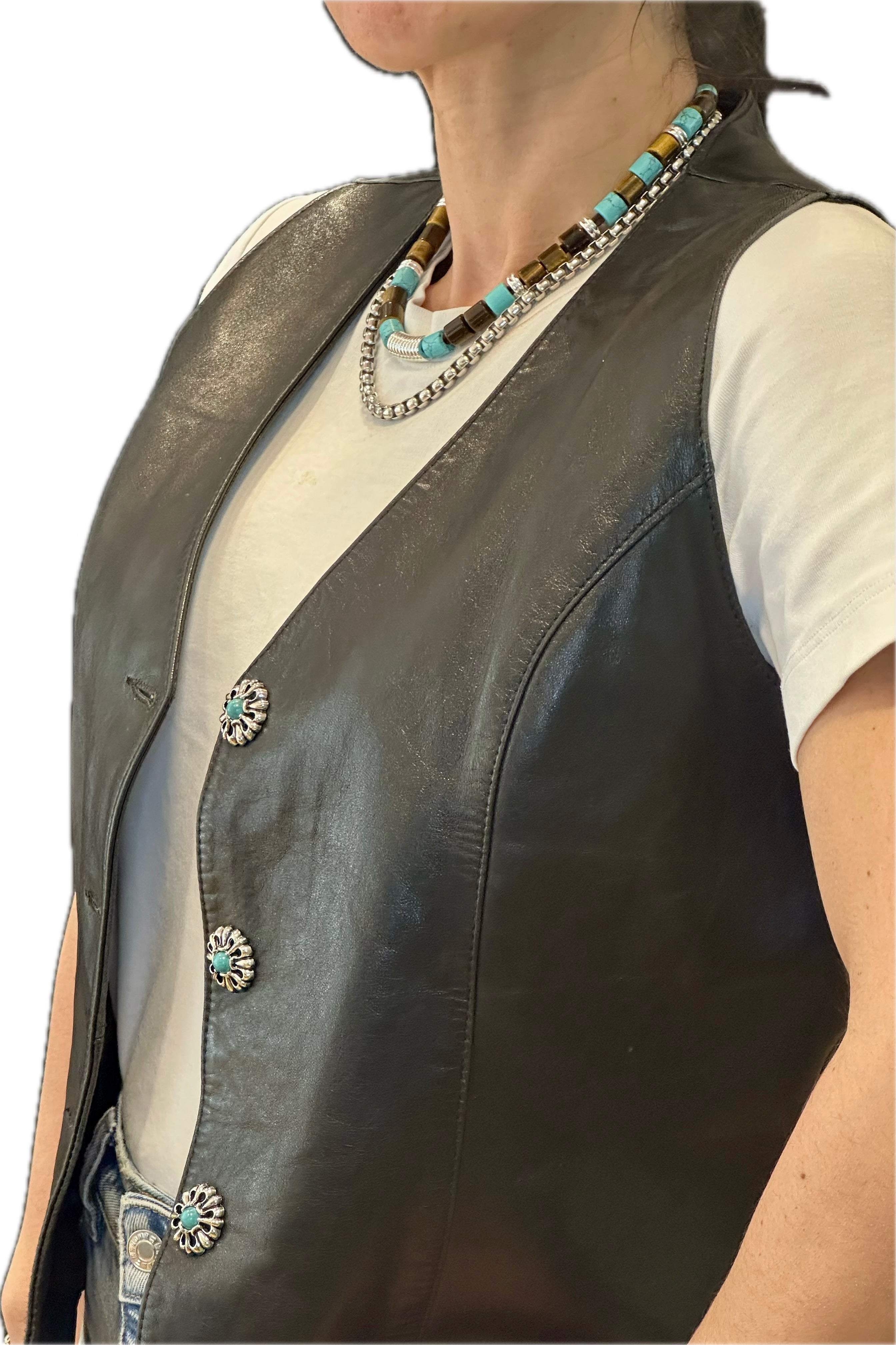 Gilet en Cuir Noir Vintage - Customisé Boutons Argent & Turquoise - Pièce Unique