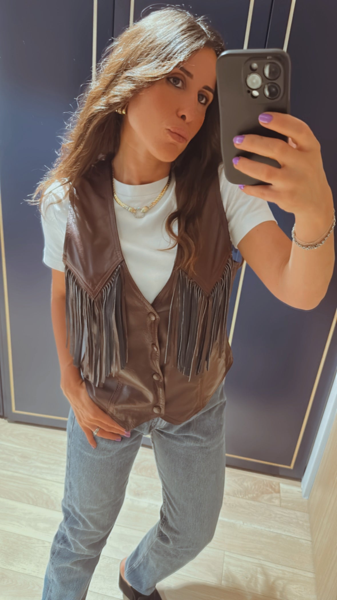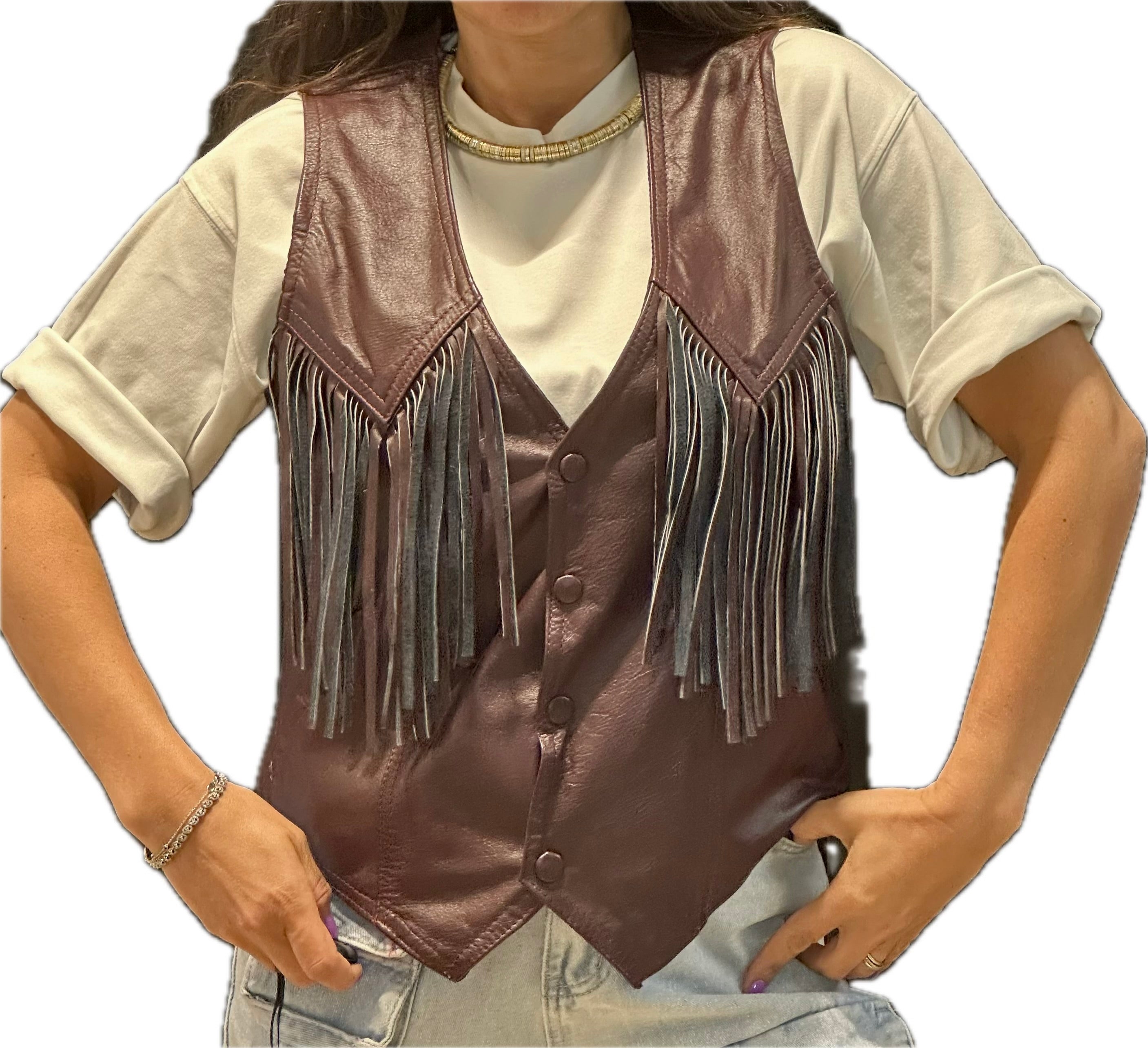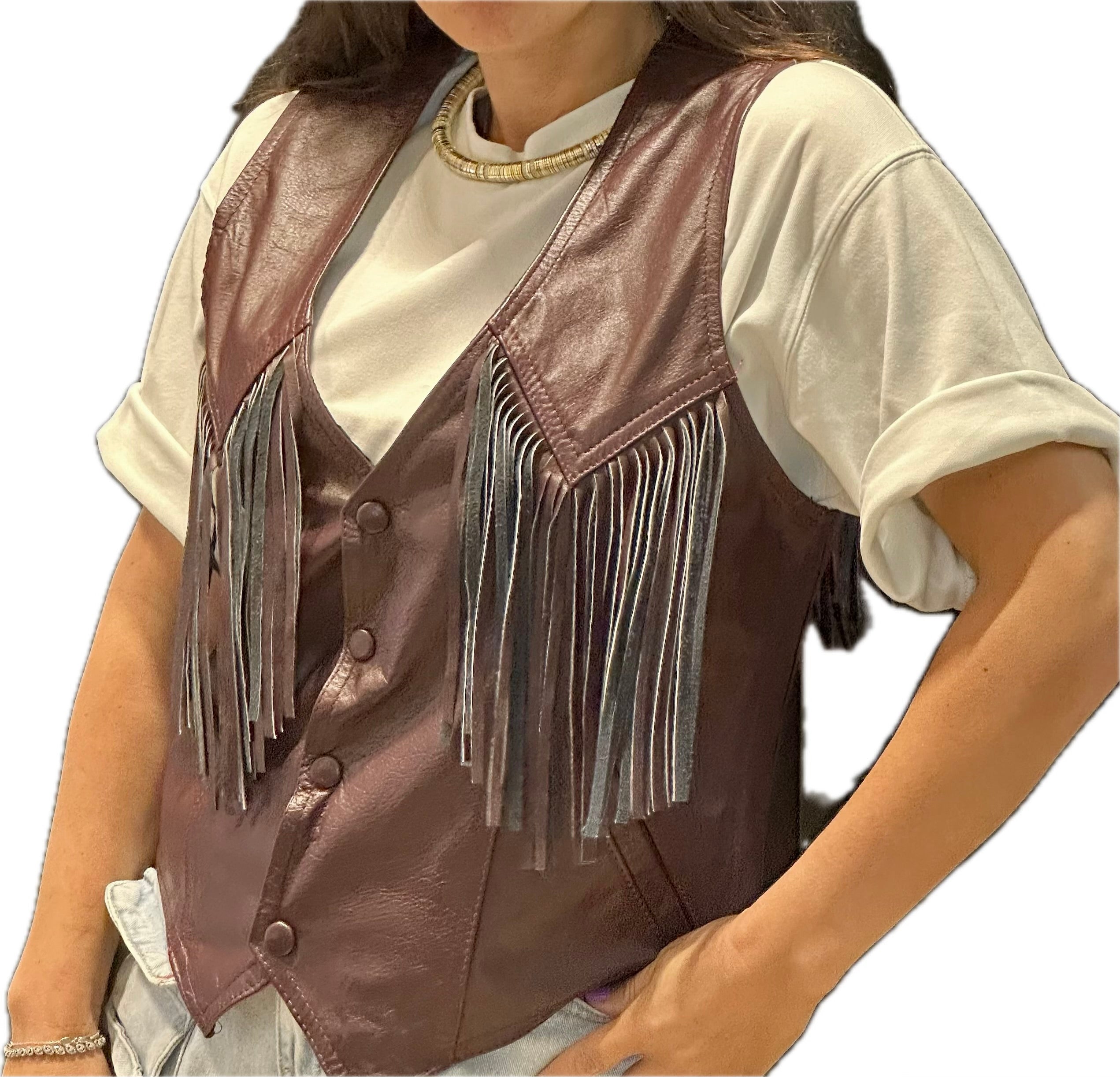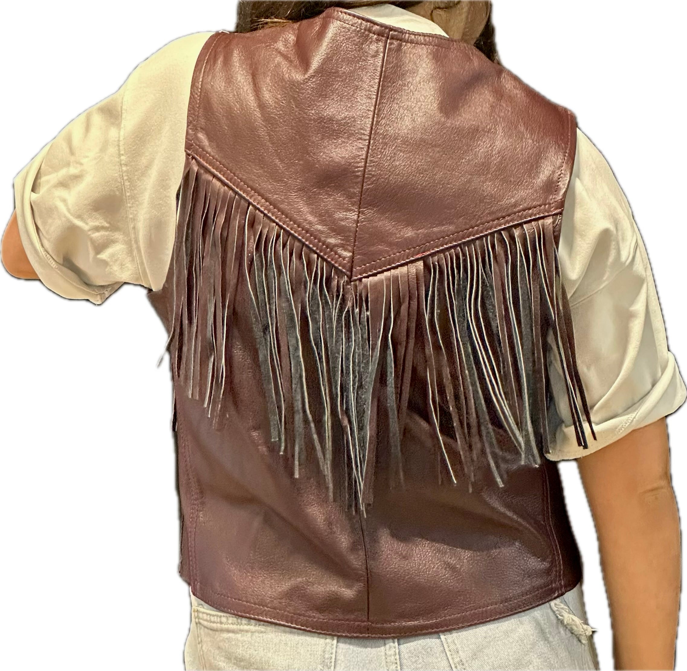 Veste sans manches en cuir bordeaux — Franges et allure vintage